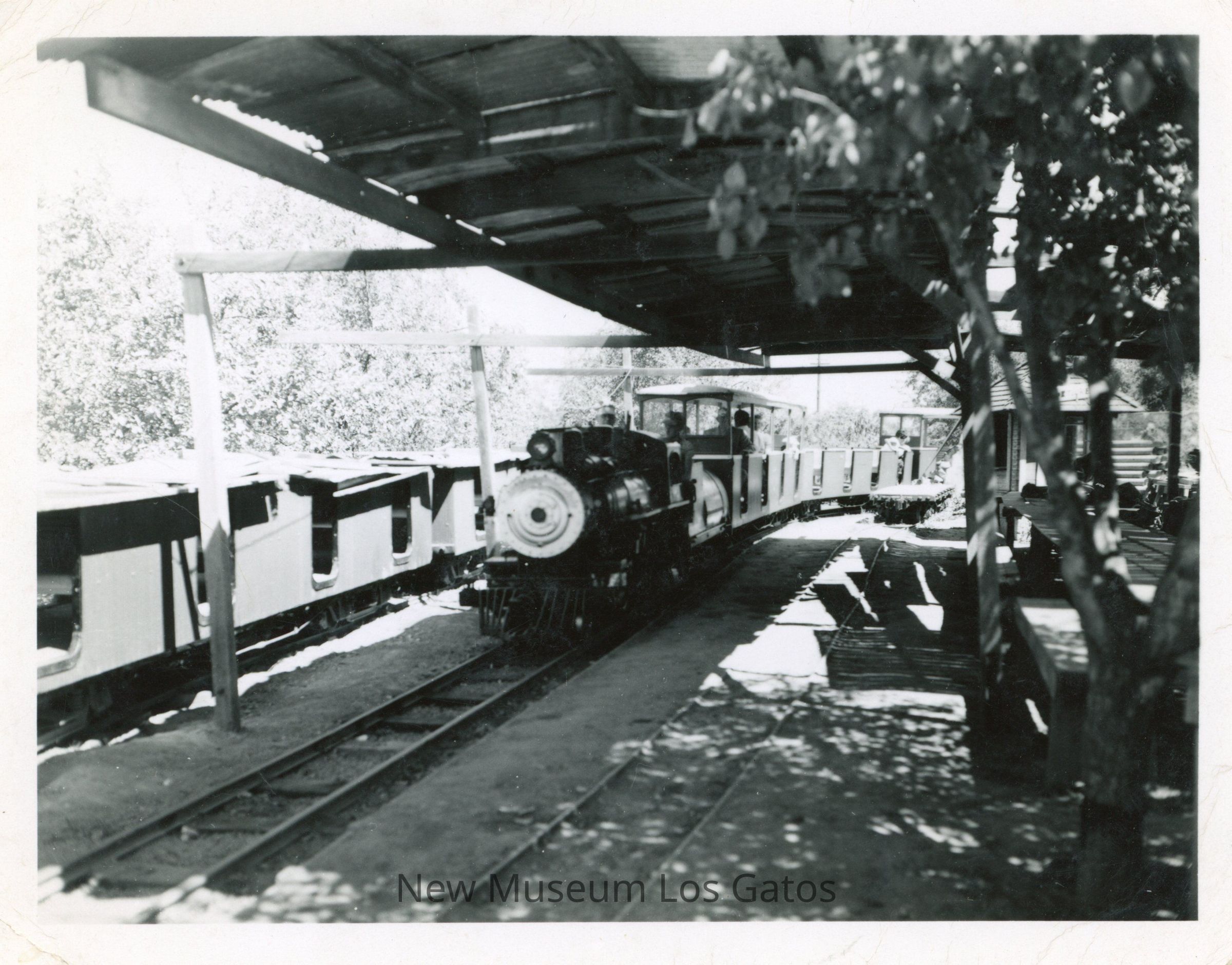 A black and white photograph featuring the Wildcat Railroad train and station. The engine is near the center of the image, on the tracks underneath a roof. There is a spare train car off to the left, and a tree and benches off to the right. The image is surrounded by a white border.Collection