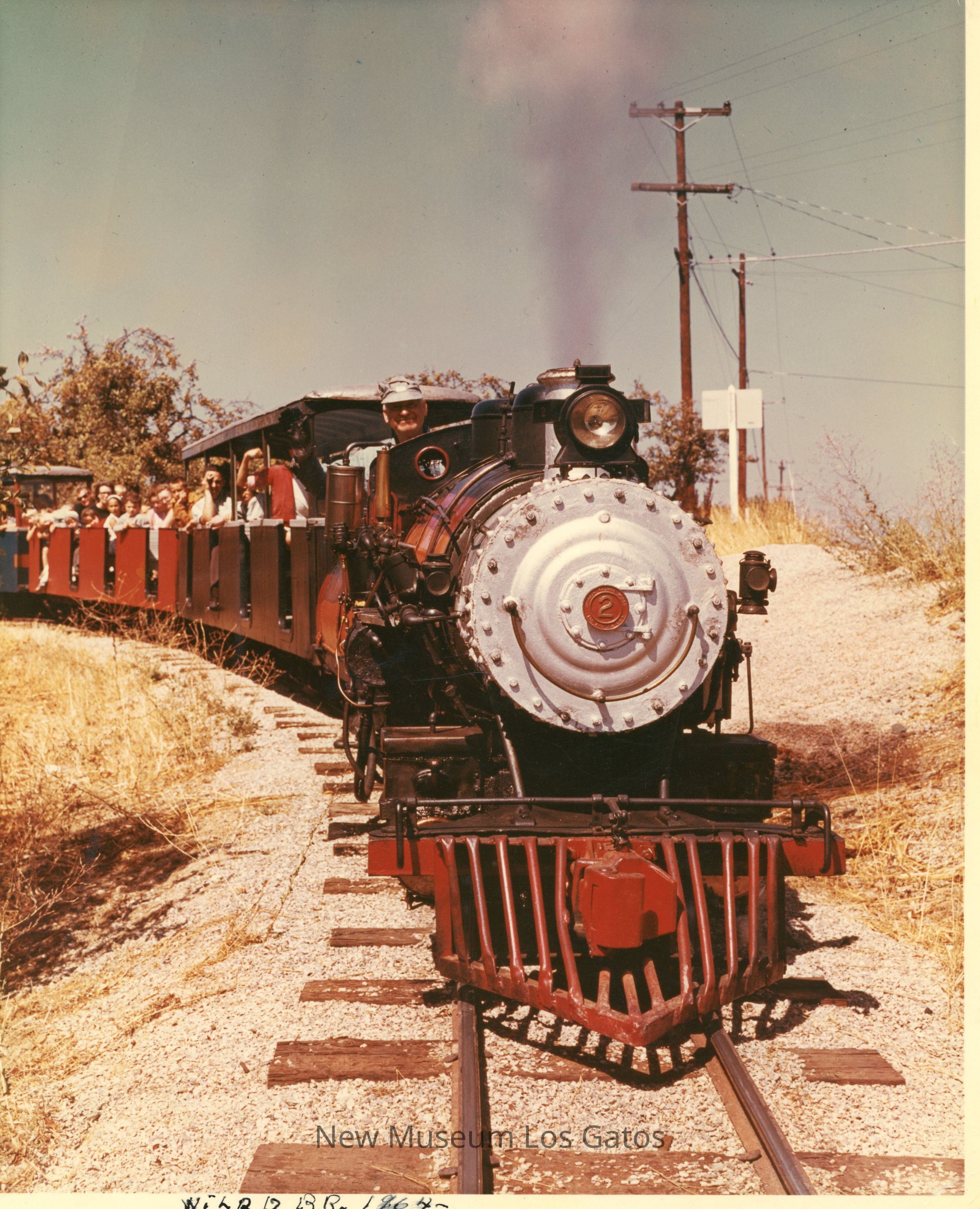 A color photograph of the Wildcat Railroad in use on its track. Billy Jones is the conductor sitting in the locomotive, and there are numerous passengers in the train cars.Photograph Details