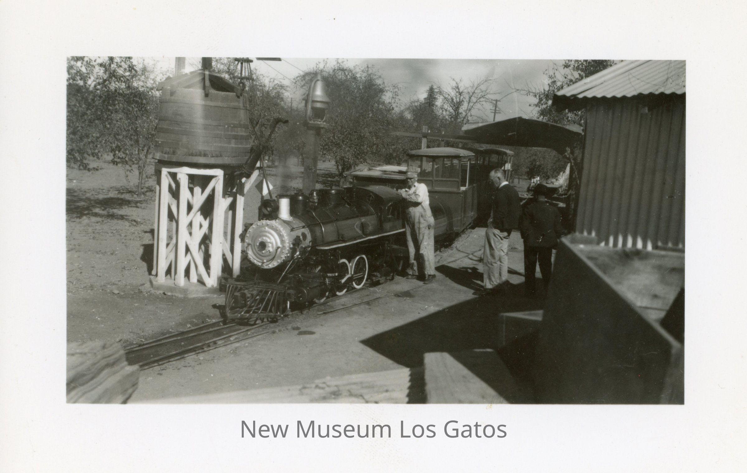 A black and white photograph featuring the Wildcat Railroad train. The train is on its tracks, with a water tank to the left and buildings to the right. There are three people standing next to the train; Billy Jones is next to the engine reaching in, while two unidentified people are further off to the right. The image is surrounded by a white border, and has wavy edges.Photograph Details