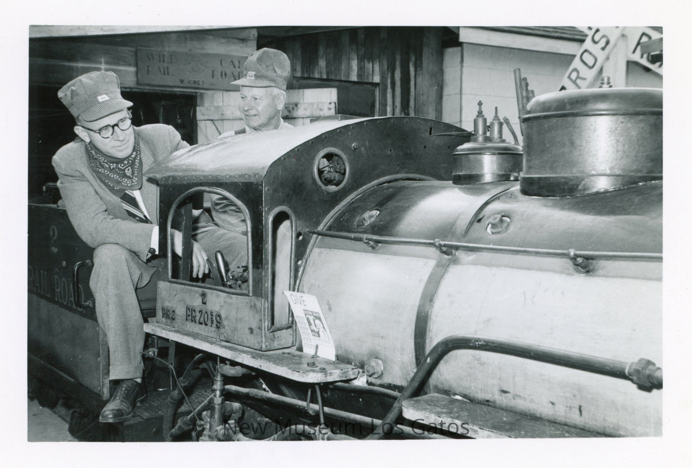 A black and white photograph featuring a close-up of the Wildcat Railroad train. The steam engine and where the conductor sits are visible, with buildings in the background. There are two men near the engine; Billy Jones standing behind off to the right, and an unidentified man sitting in the engine. The image is surrounded by a white border.Photograph Details