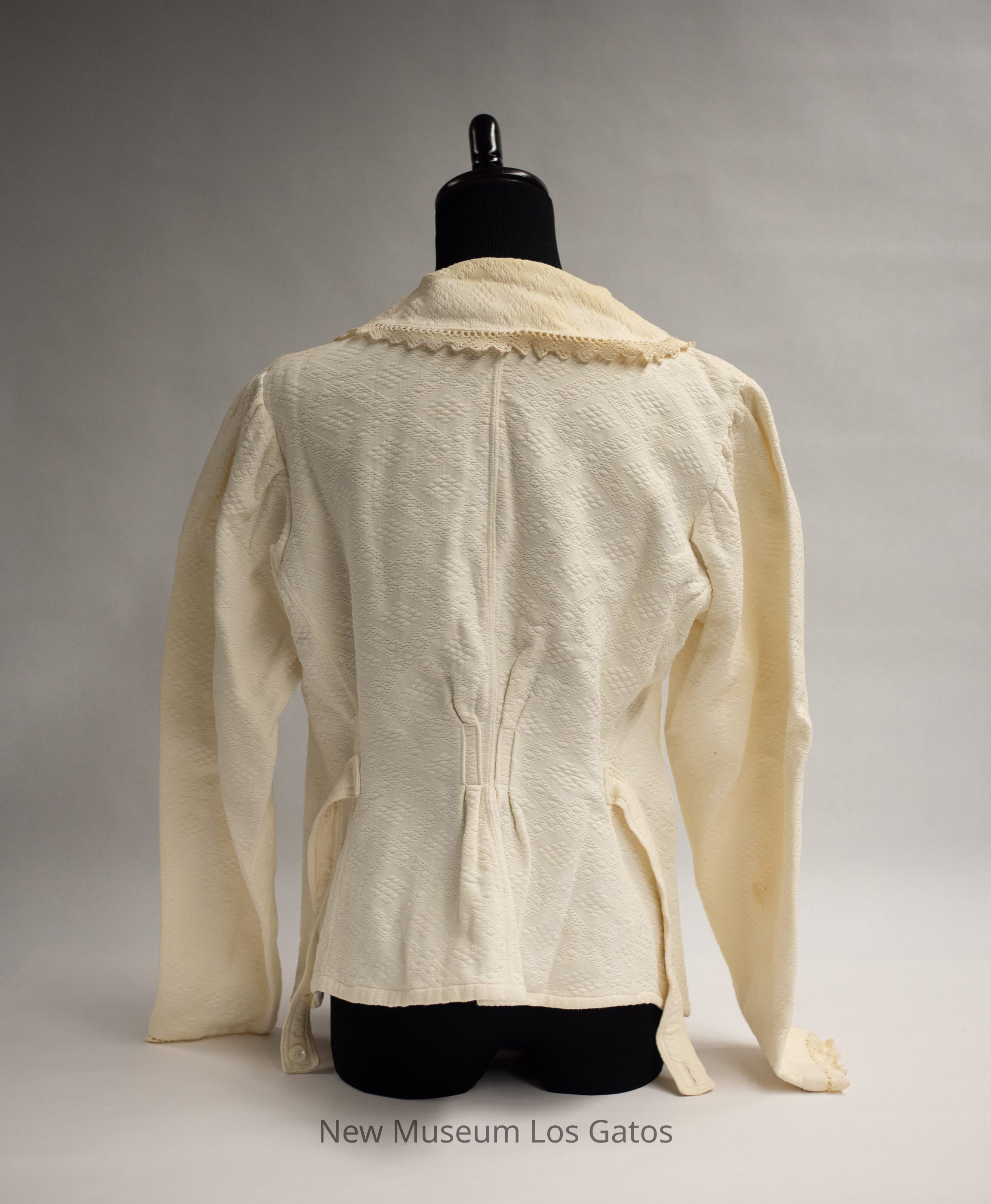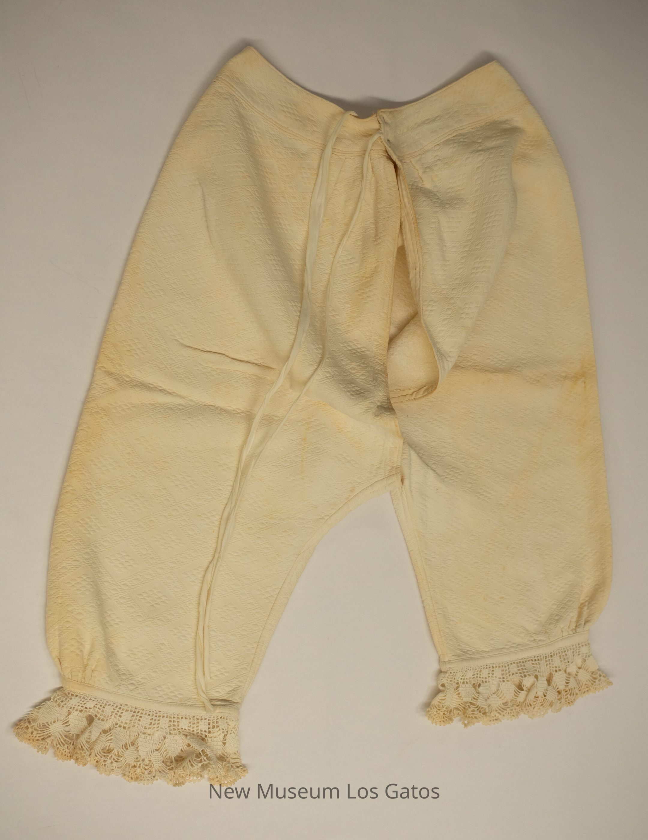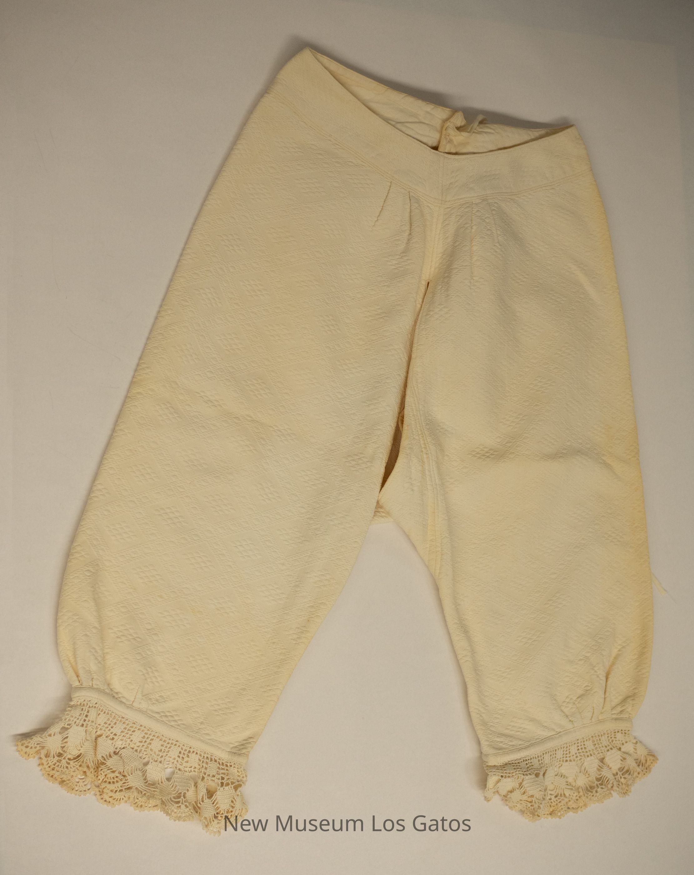 A cream-colored winter undergarment set, consisting of bloomers and a long-sleeved jacket. The jacket opens in the front, and closes with five pearl buttons. There is decorative lace around the collar, down the front, and along the sleeve hems. There is an attached belt, that is sewn to the back and secures around the front, with a single pearl button The bloomers have decorative lace/fringe at the bottom of the legs, and tie at the top with two long fabric ties. Both pieces have an intricate diamond pattern throughout.Collection