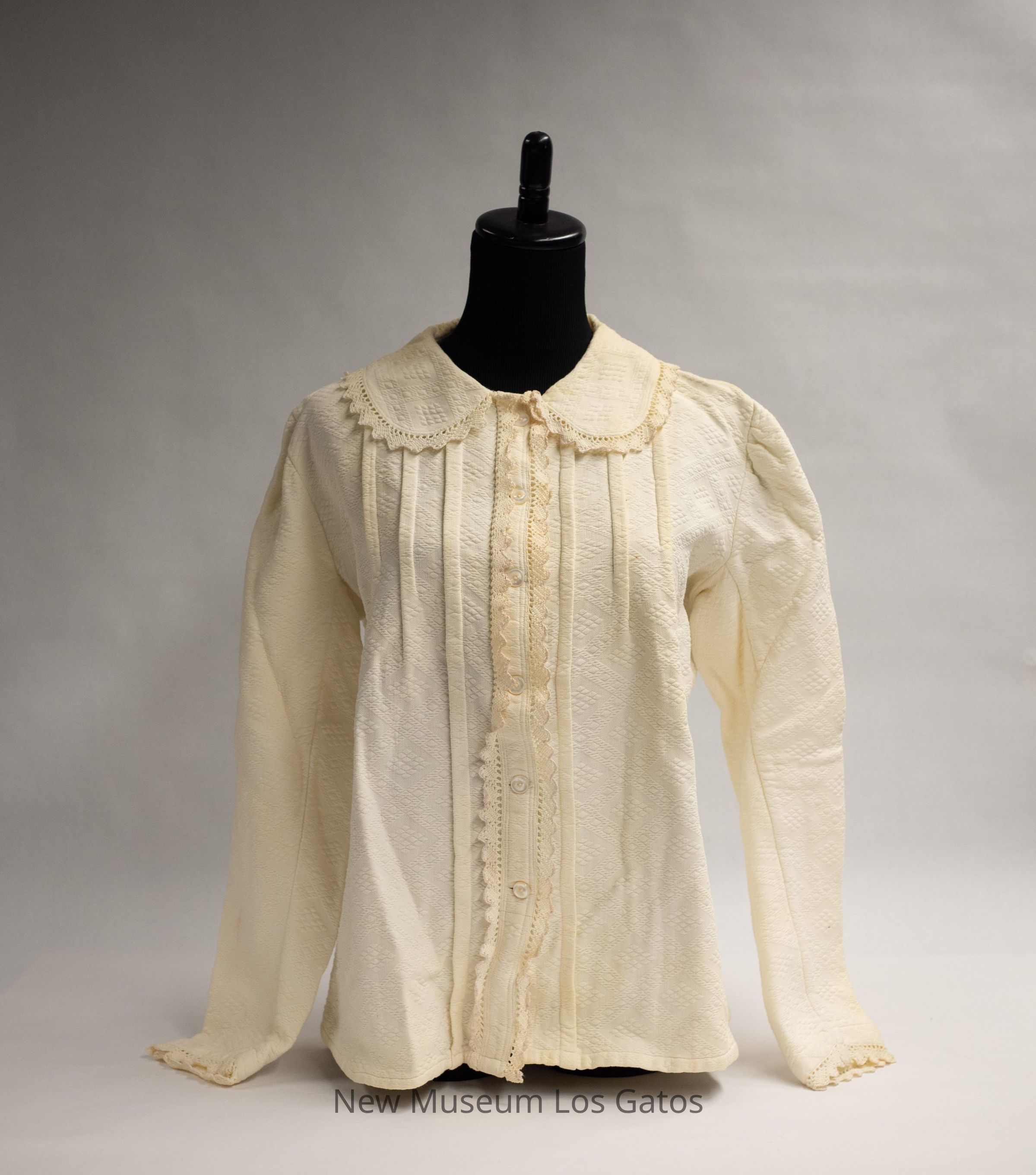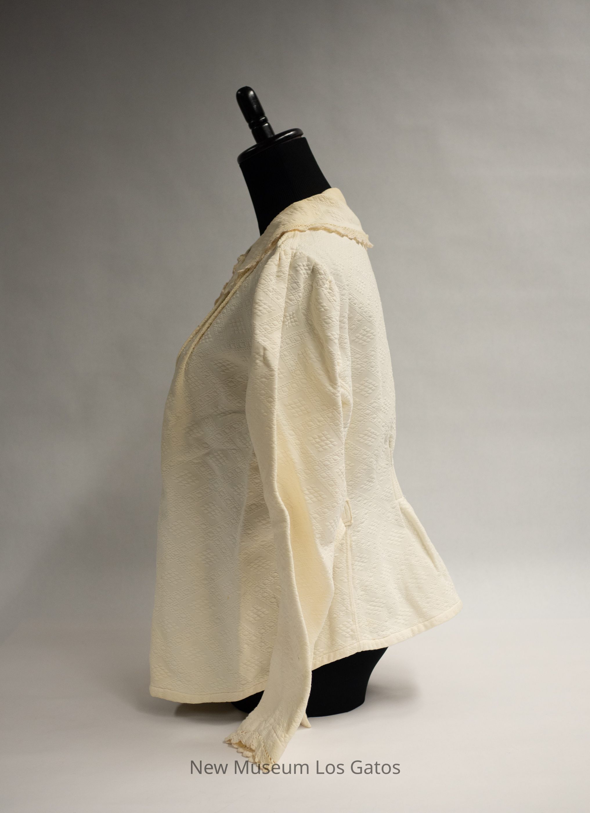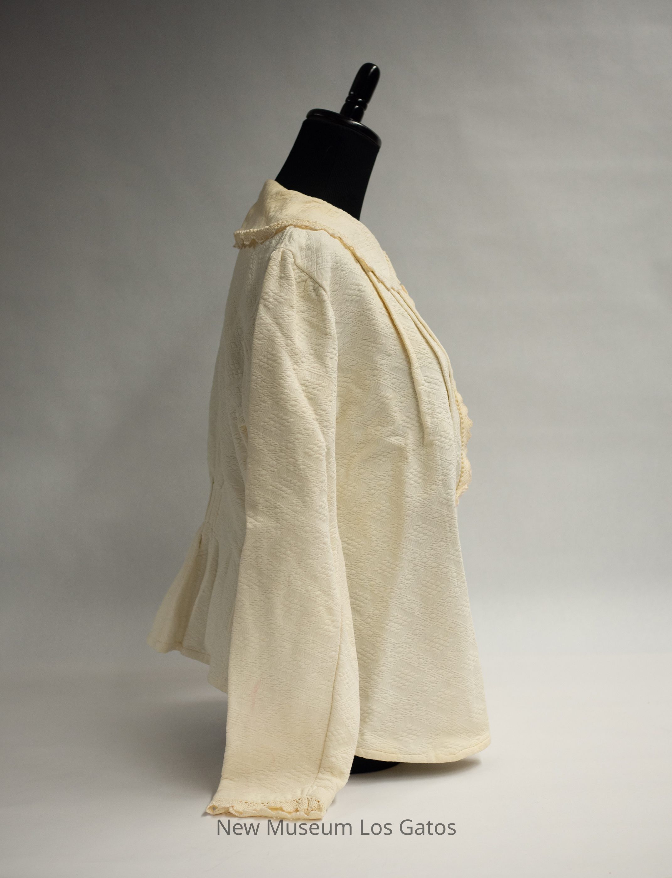 A cream-colored winter undergarment set, consisting of bloomers and a long-sleeved jacket. The jacket opens in the front, and closes with five pearl buttons. There is decorative lace around the collar, down the front, and along the sleeve hems. There is an attached belt, that is sewn to the back and secures around the front, with a single pearl button The bloomers have decorative lace/fringe at the bottom of the legs, and tie at the top with two long fabric ties. Both pieces have an intricate diamond pattern throughout.Collection