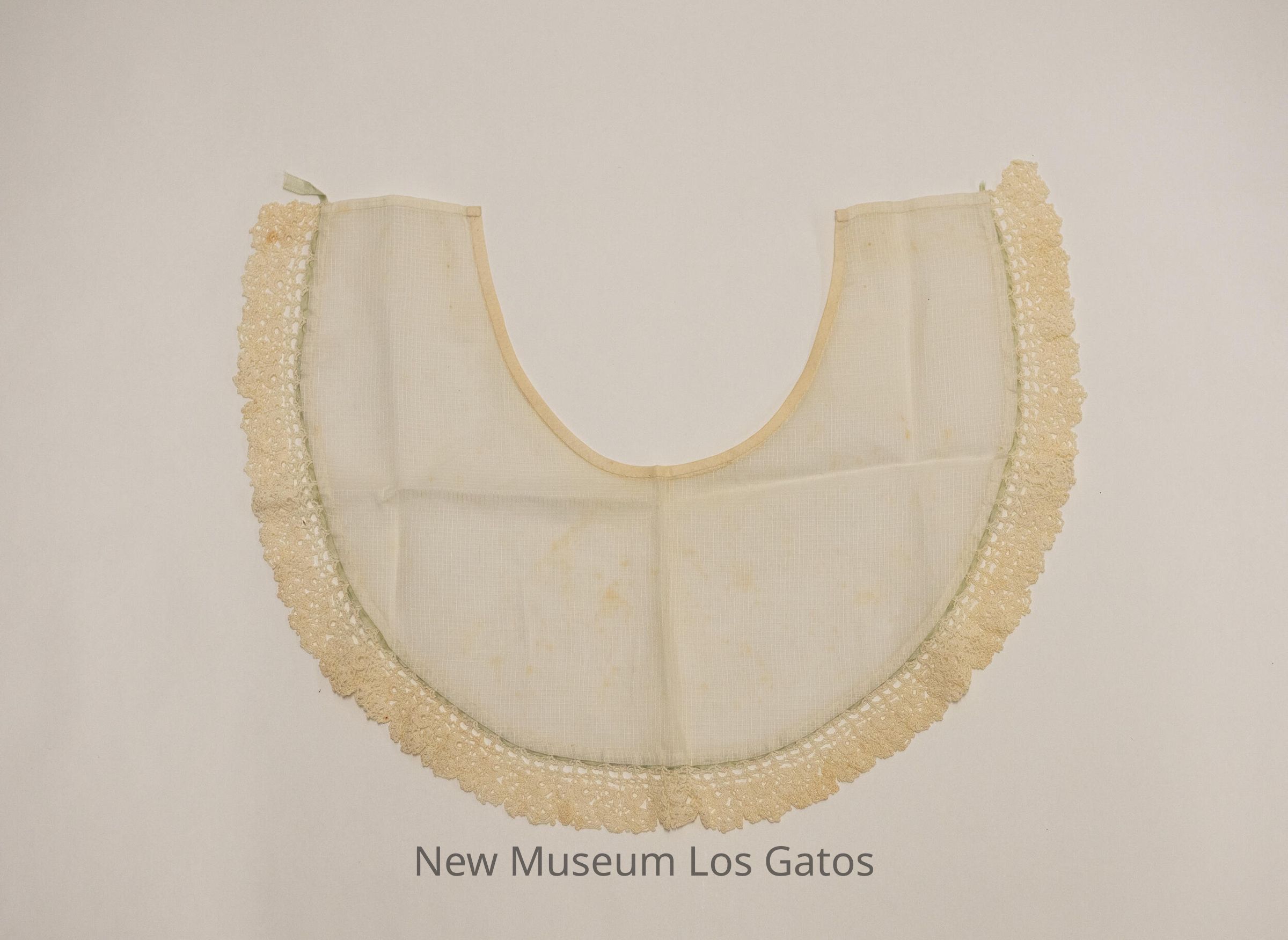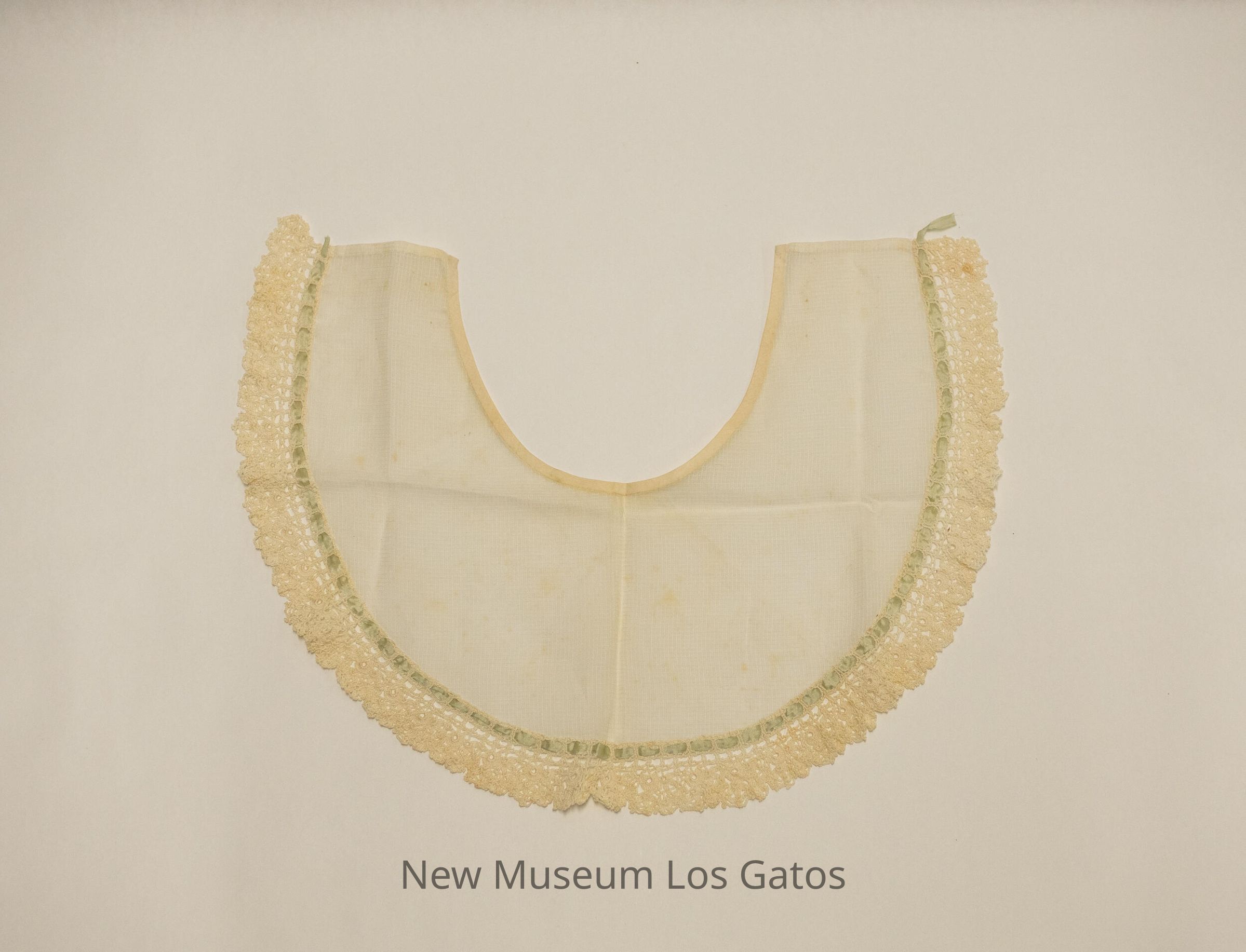 A U-shaped ecru women's collar, with a green satin ribbon along the edge, in between the linen and a crocheted border.Collection