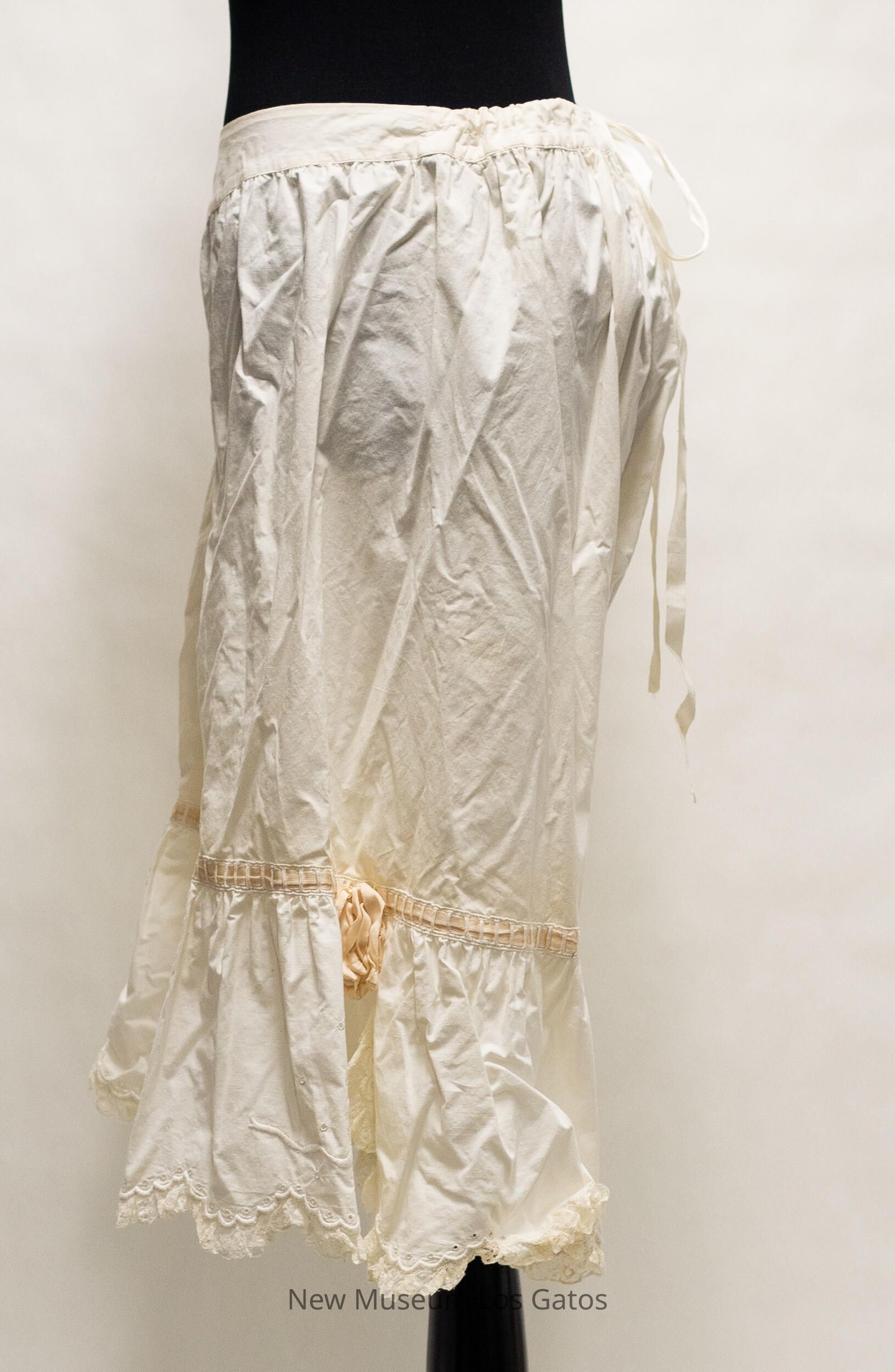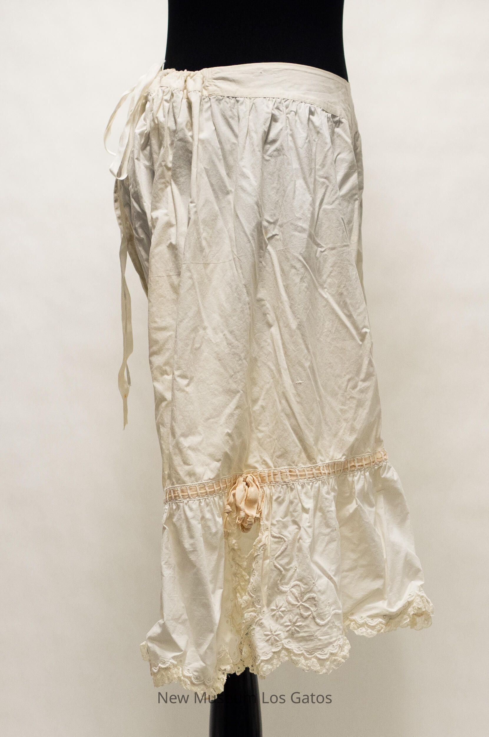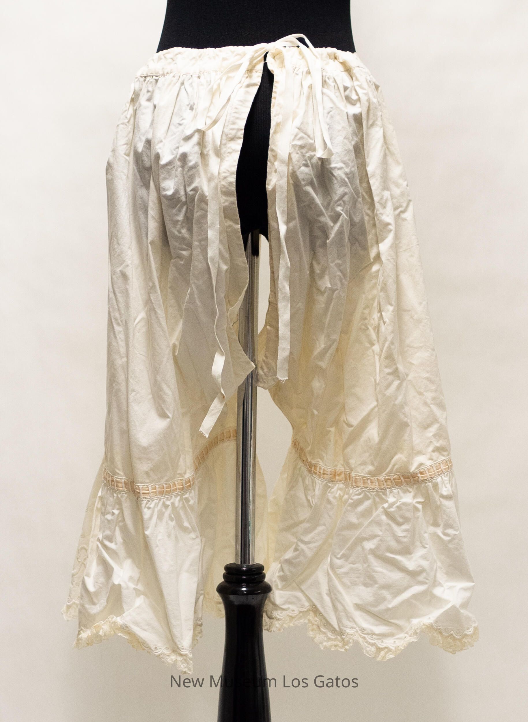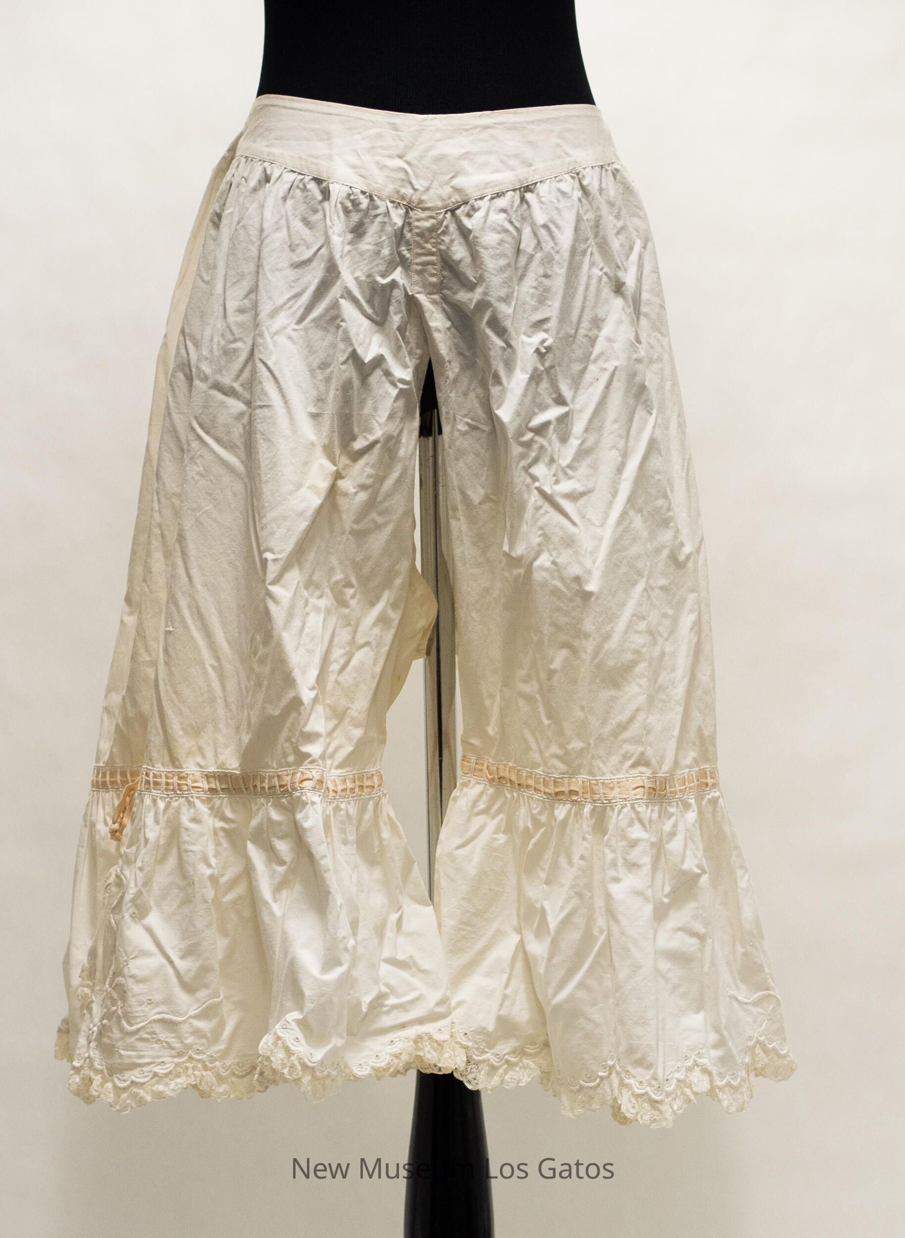 A long pair of white, cotton drawers. The legs are open along the interior of the legs, and the drawers cinch at the back, and tie together with two strings. There is decorative, peach-colored fabric threaded horizontally through the legs, that form bows on the outside of the legs. There is scalloped lace edging along the bottom of the legs, and there are slits along the outer edge, from the bottom up to the peach fabric. There is also decorative embroidery along the bottom edges and up the slits.Collection
