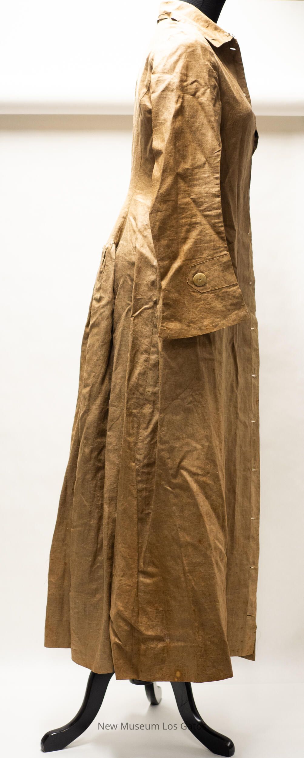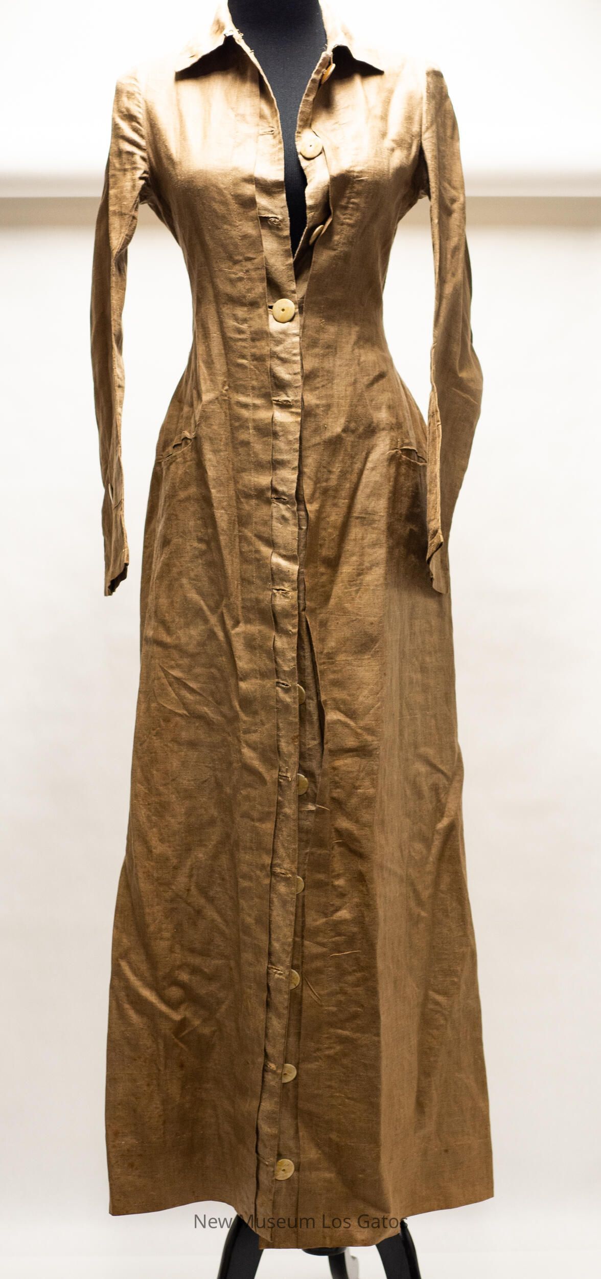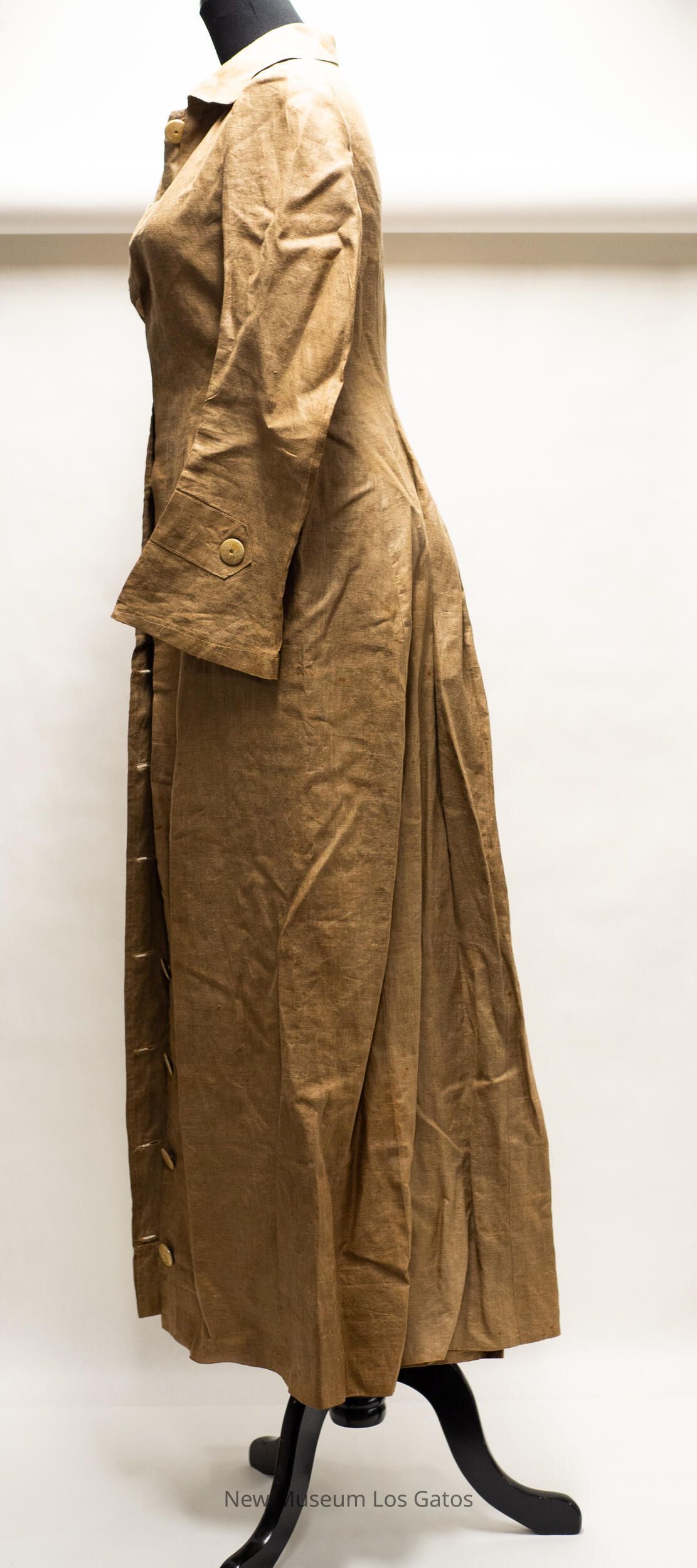 A long, brown, button-up linen duster. There are 13 circular tan-and-brown buttons on the left side of the duster, as well as one on each sleeve, near the cuff. There are two small pockets on each side of the front of the duster.Collection