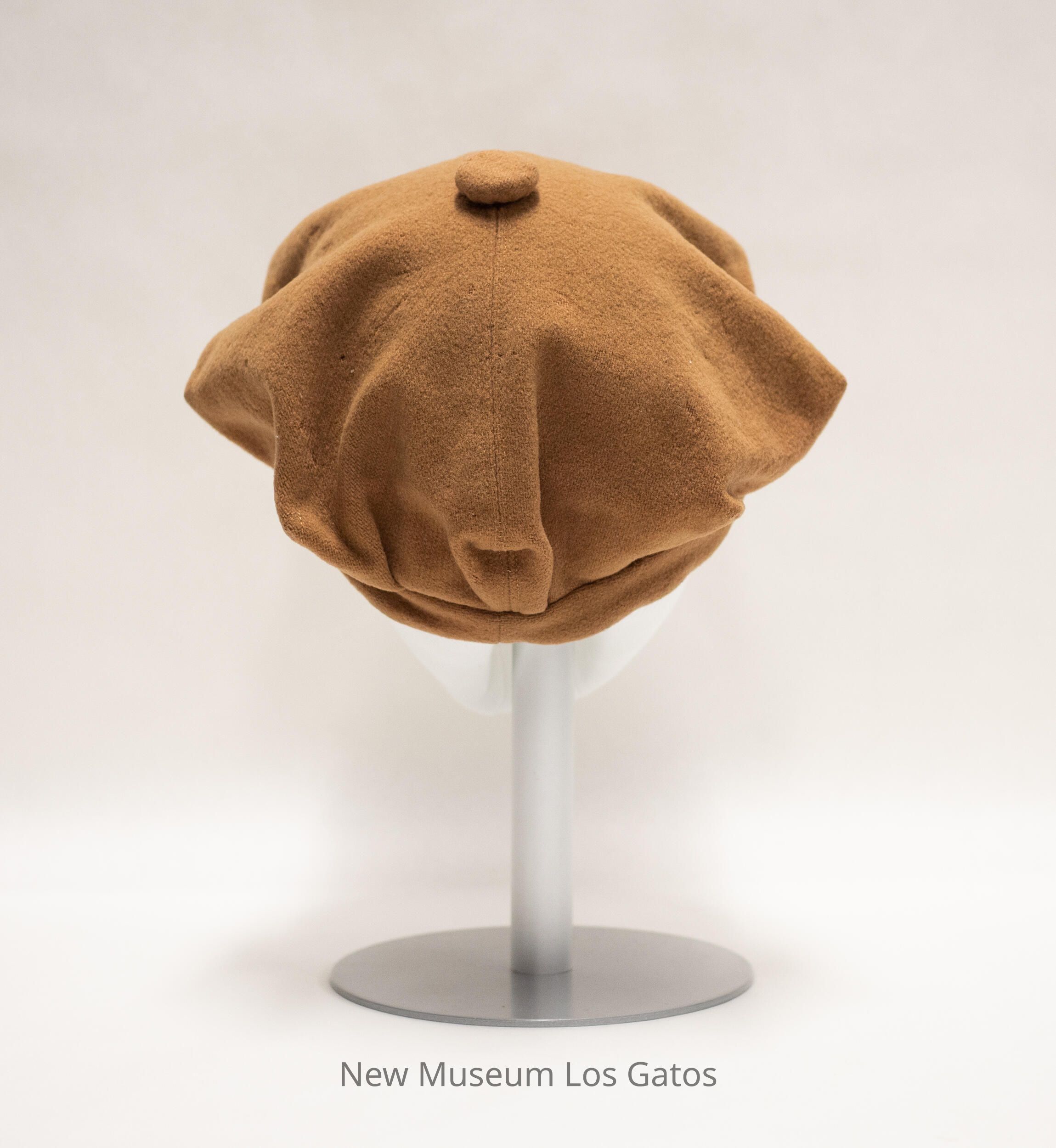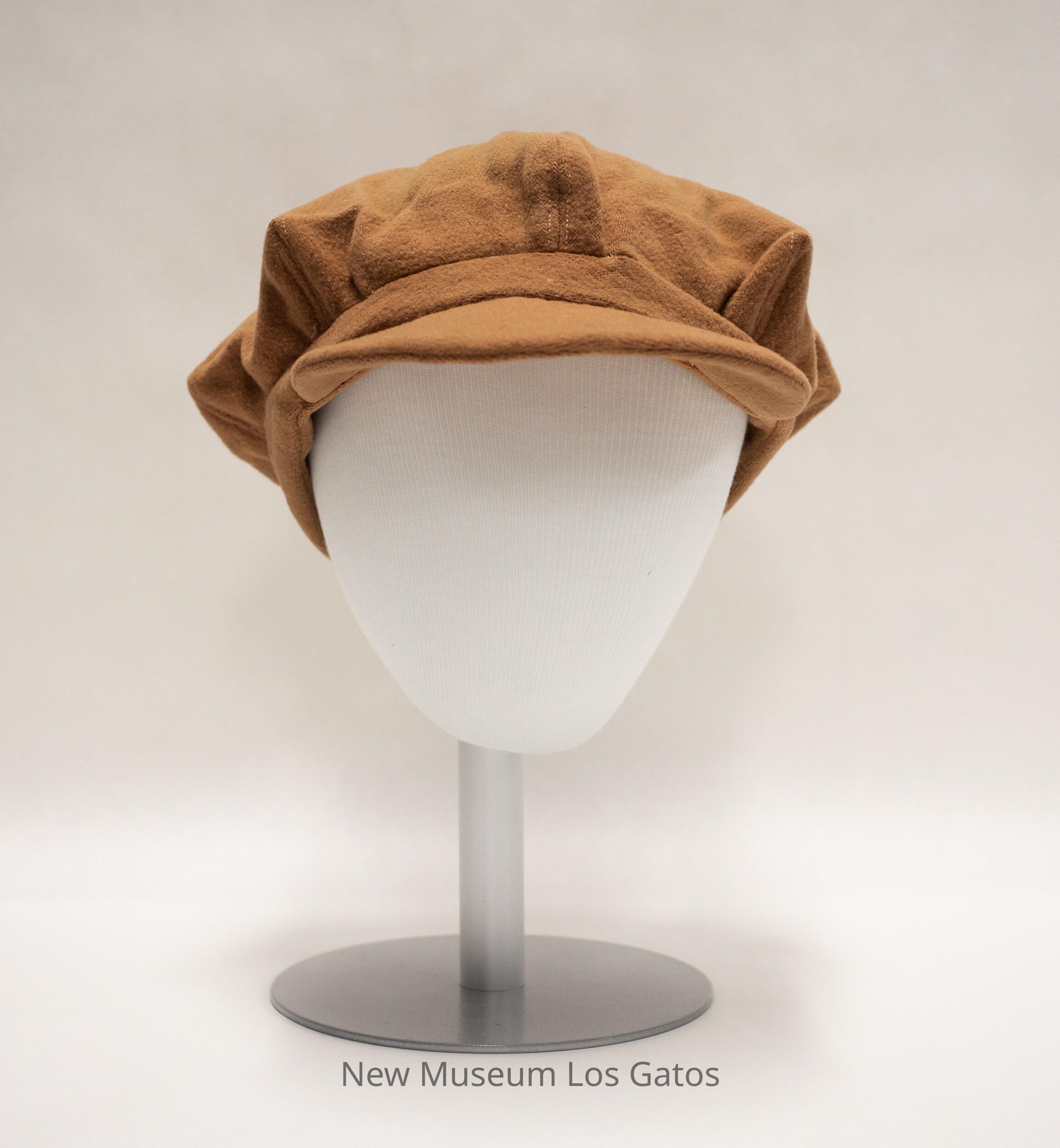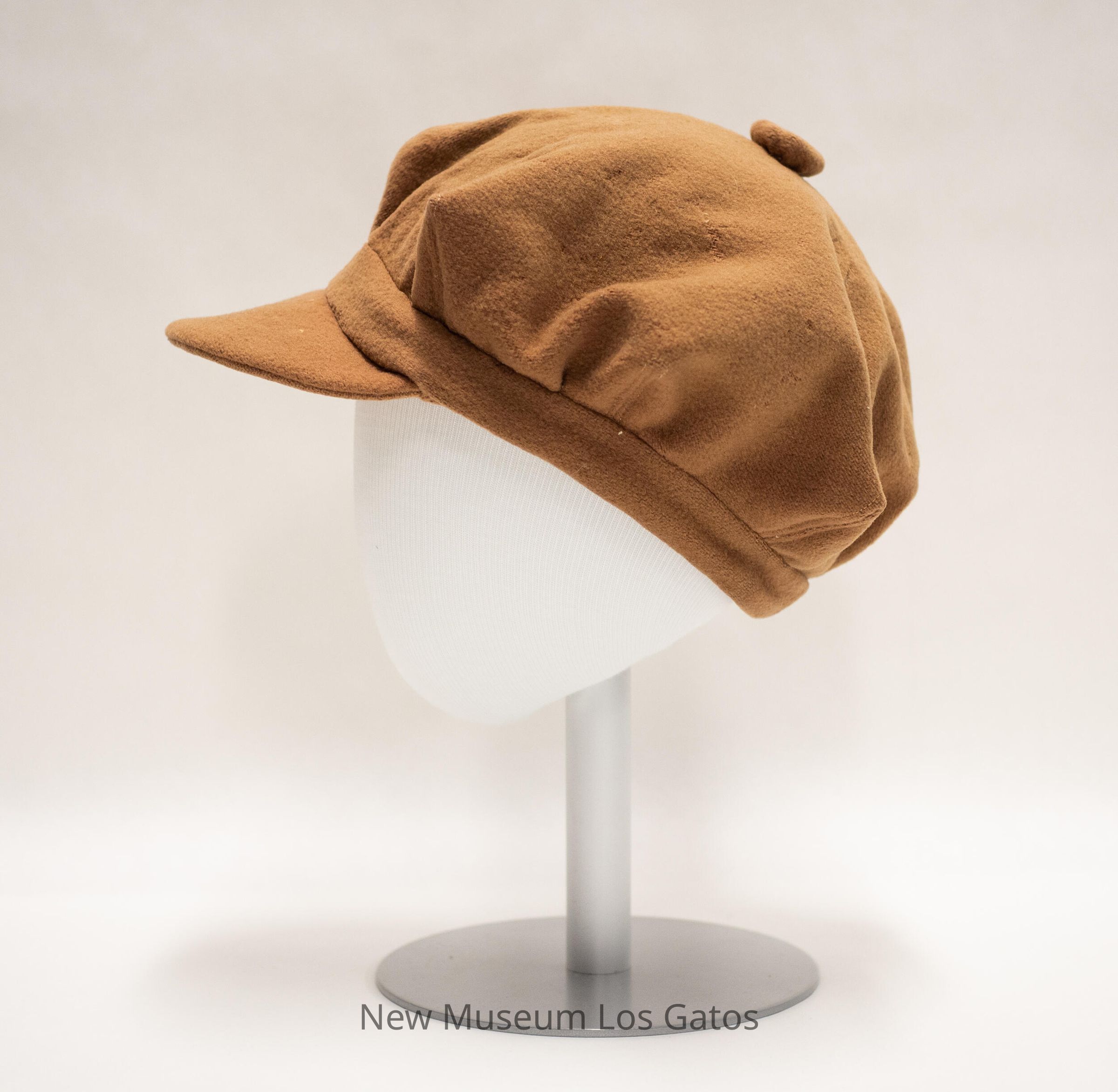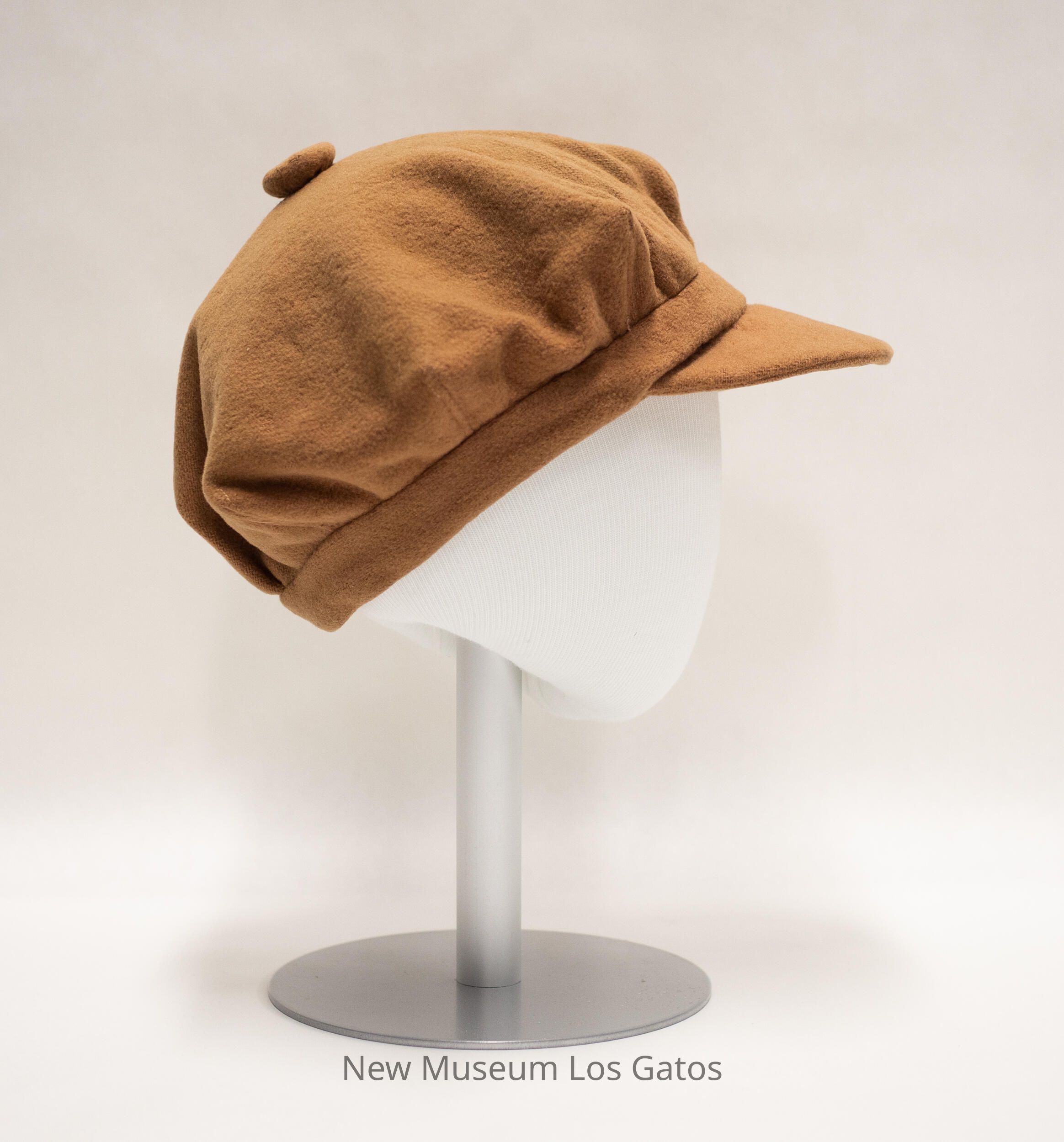 A tan-colored newsboy cap, with a small brim in front, a single seam down the center of the cap, and a button on top.Collection