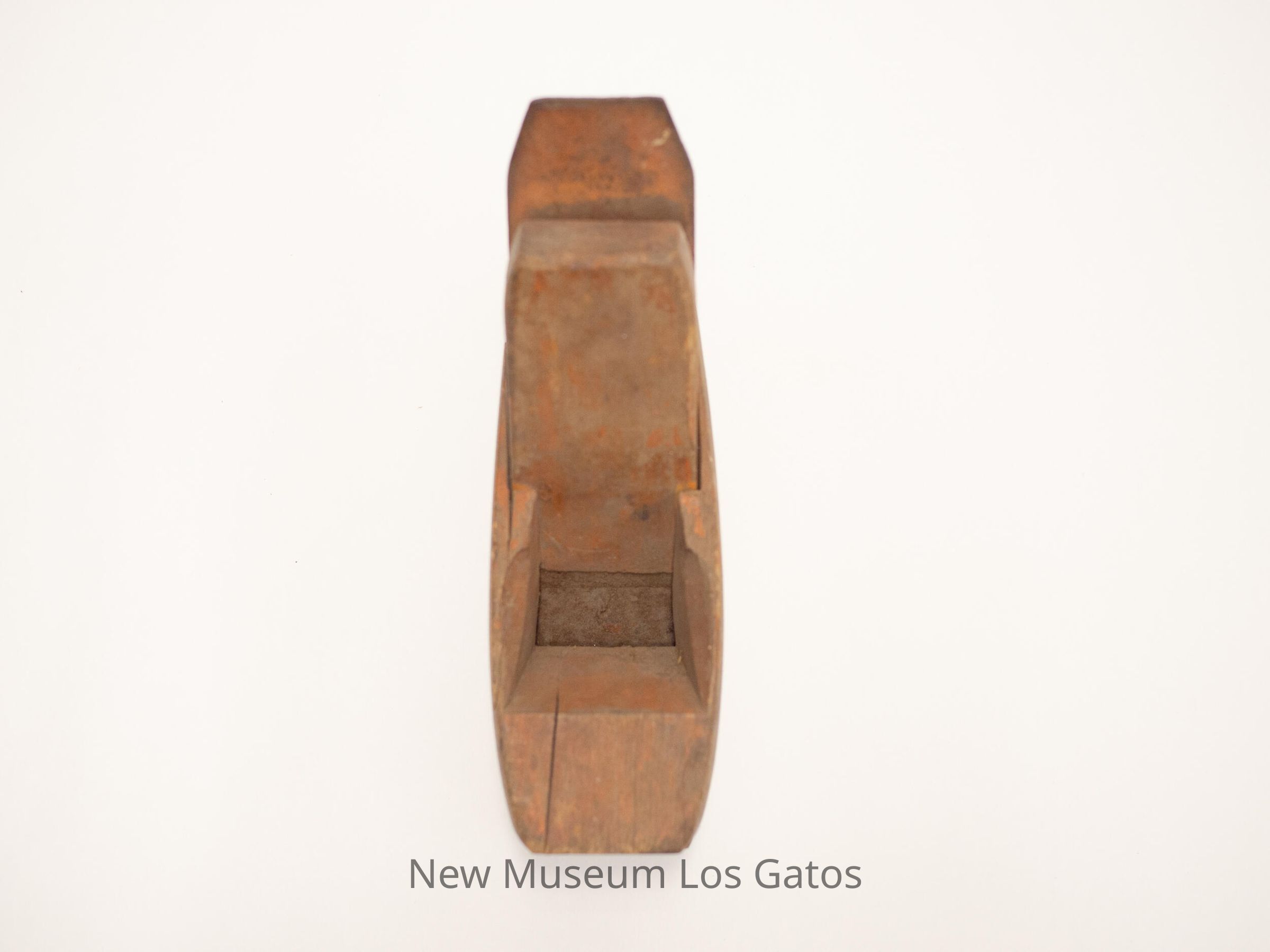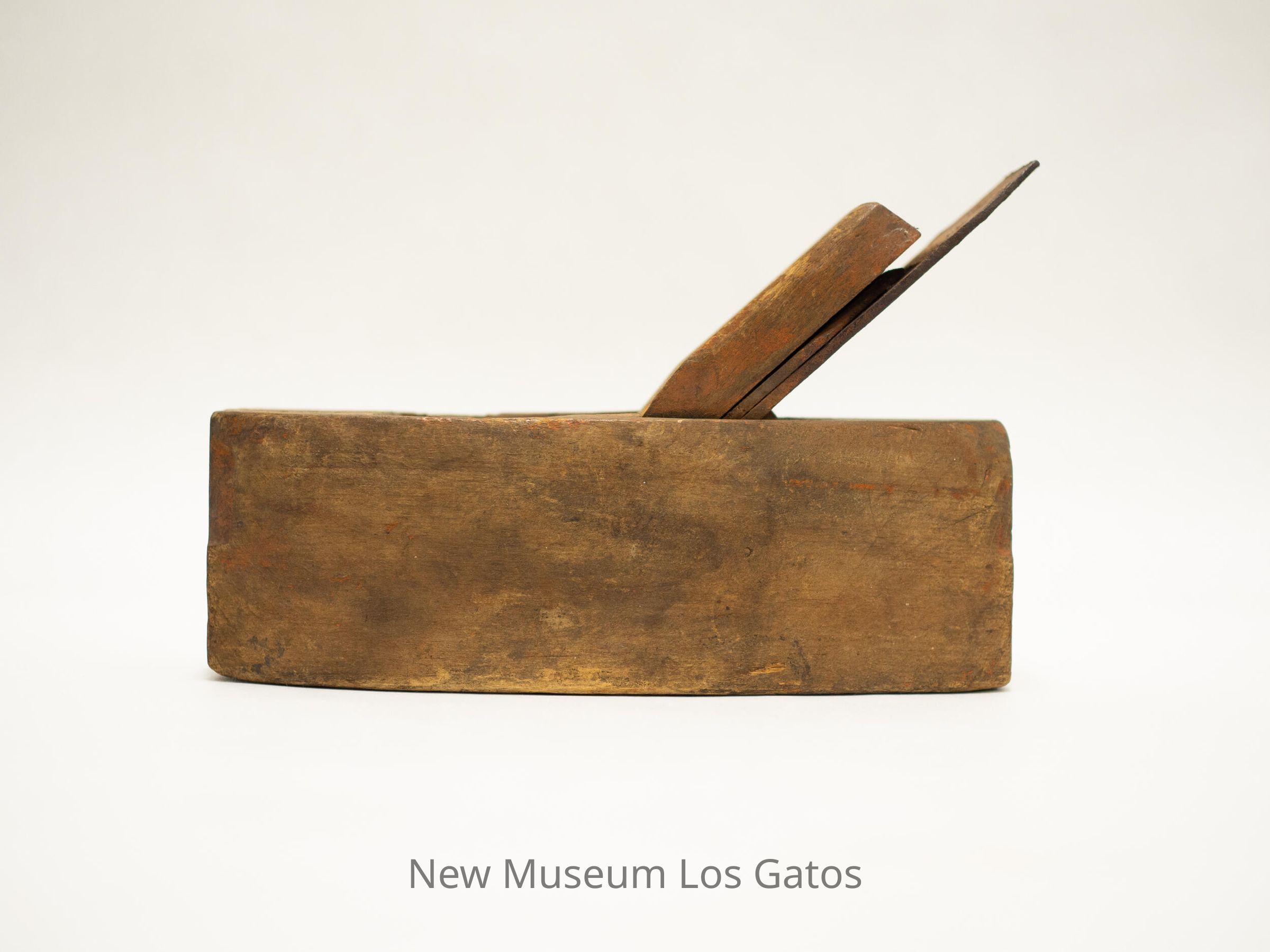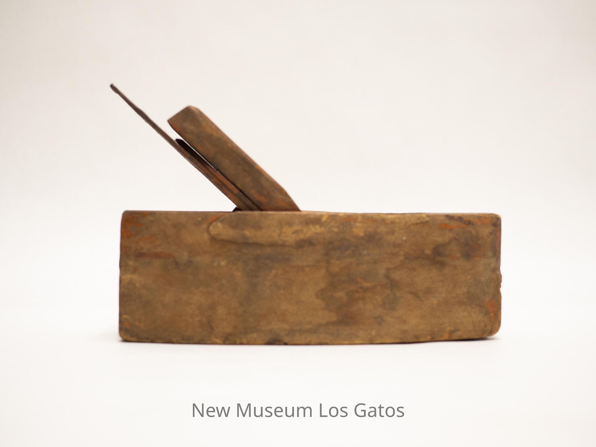 Small, wooden rectangular wood plane with a metal blade and wooden chip breaker angled into the base.Collection