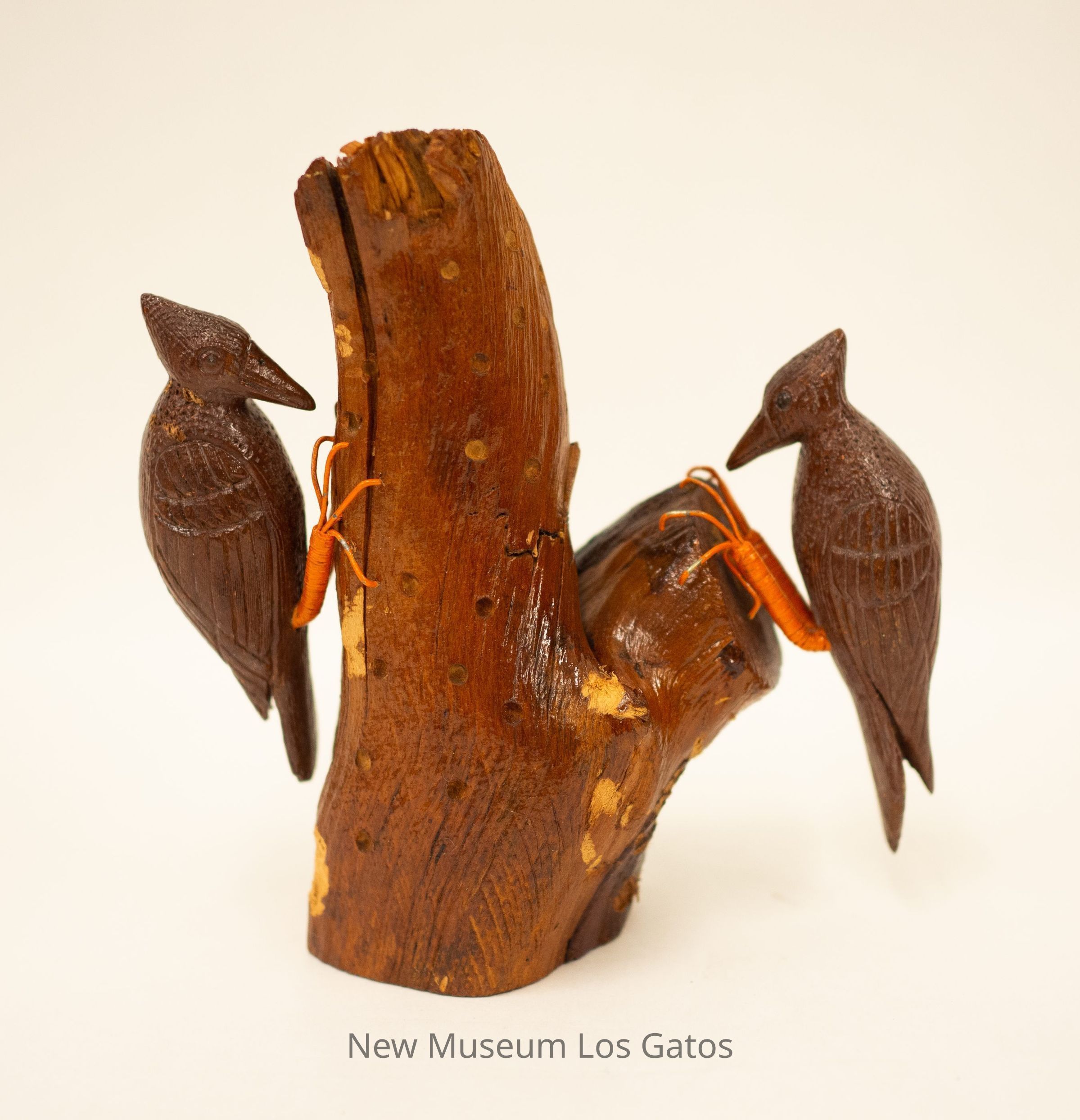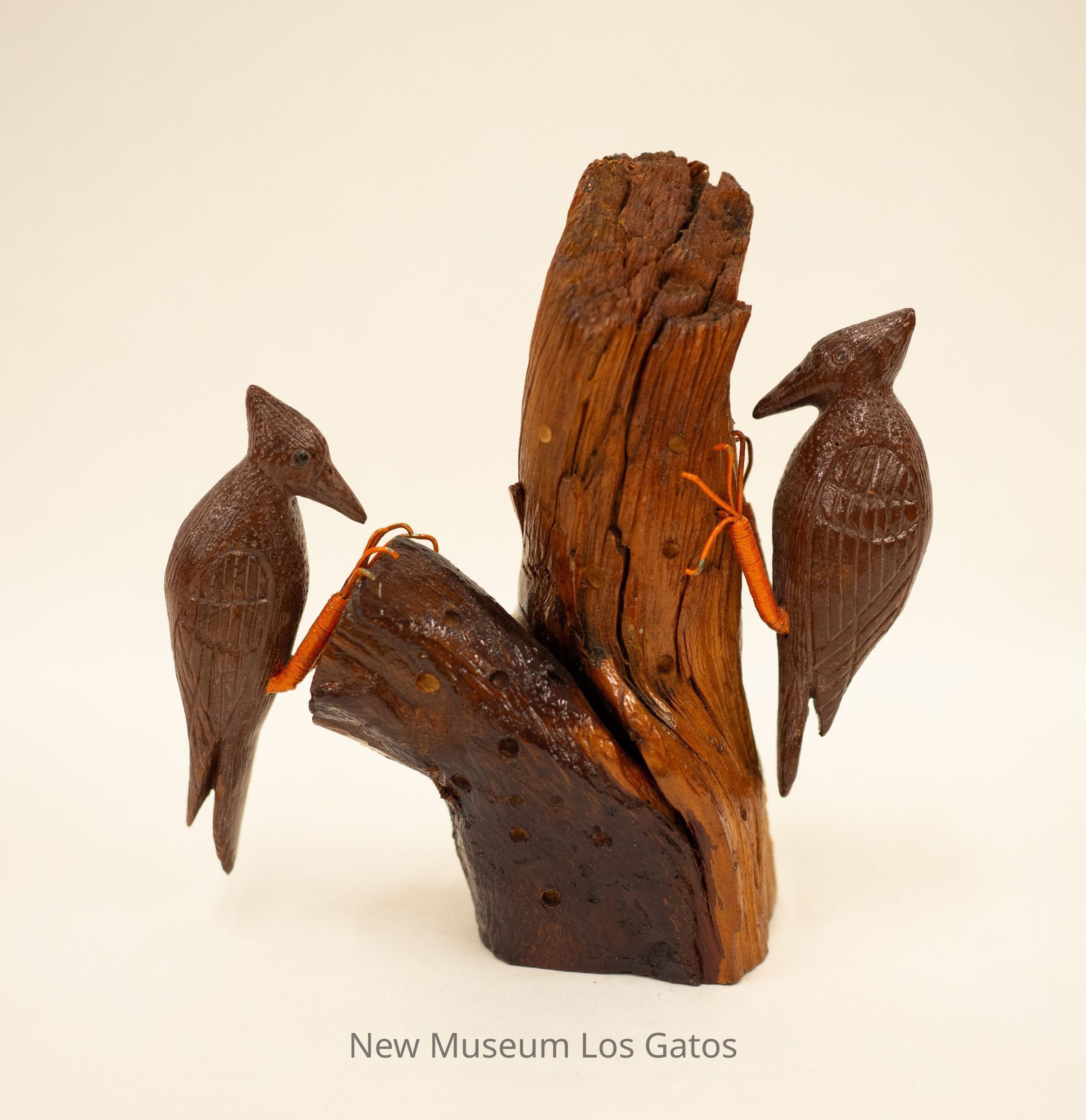 A brown hand-carved wooden sculpture of two woodpeckers, perched on opposite sides of a wooden base resembling a tree trunk.Type of Sculpture