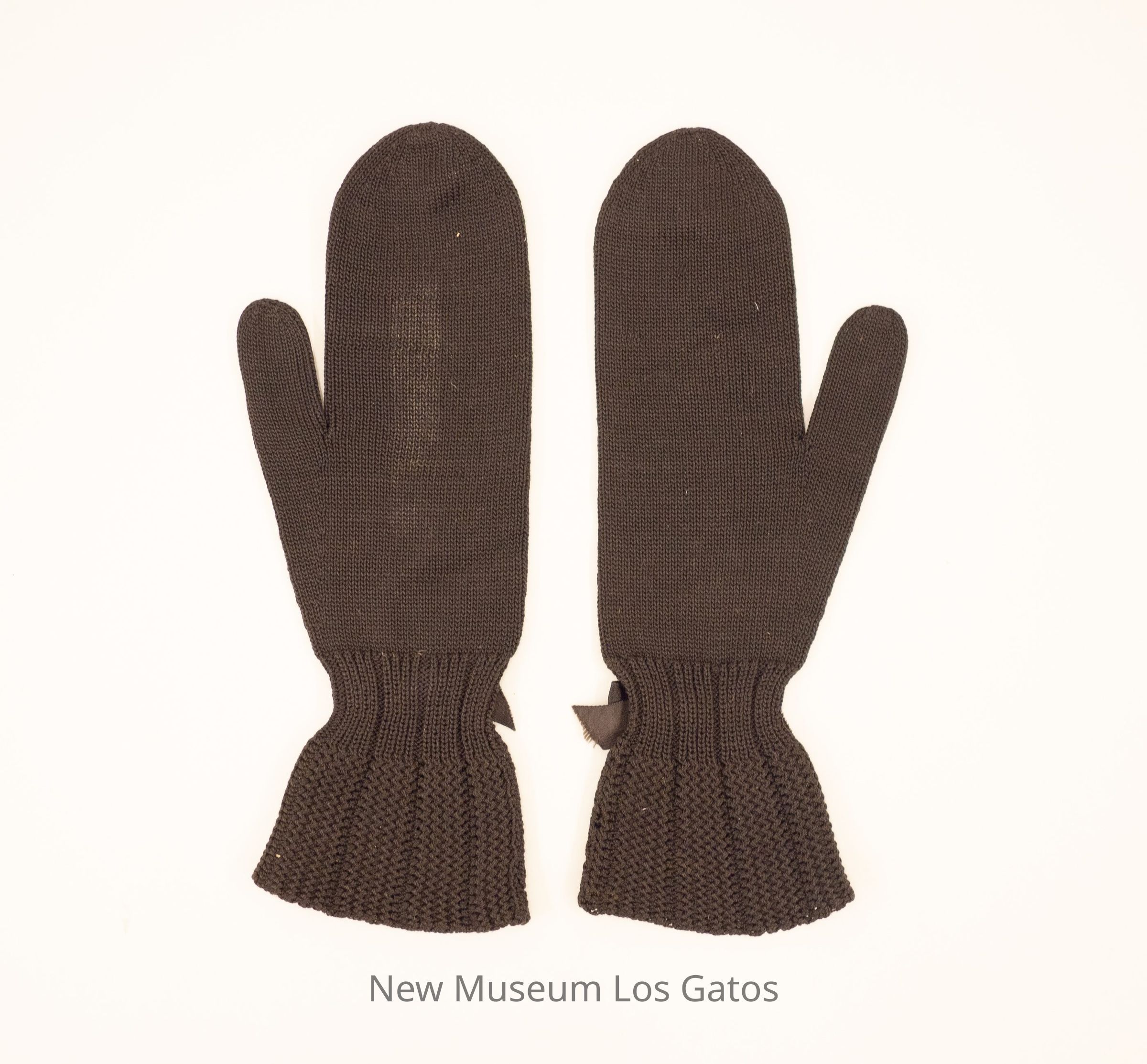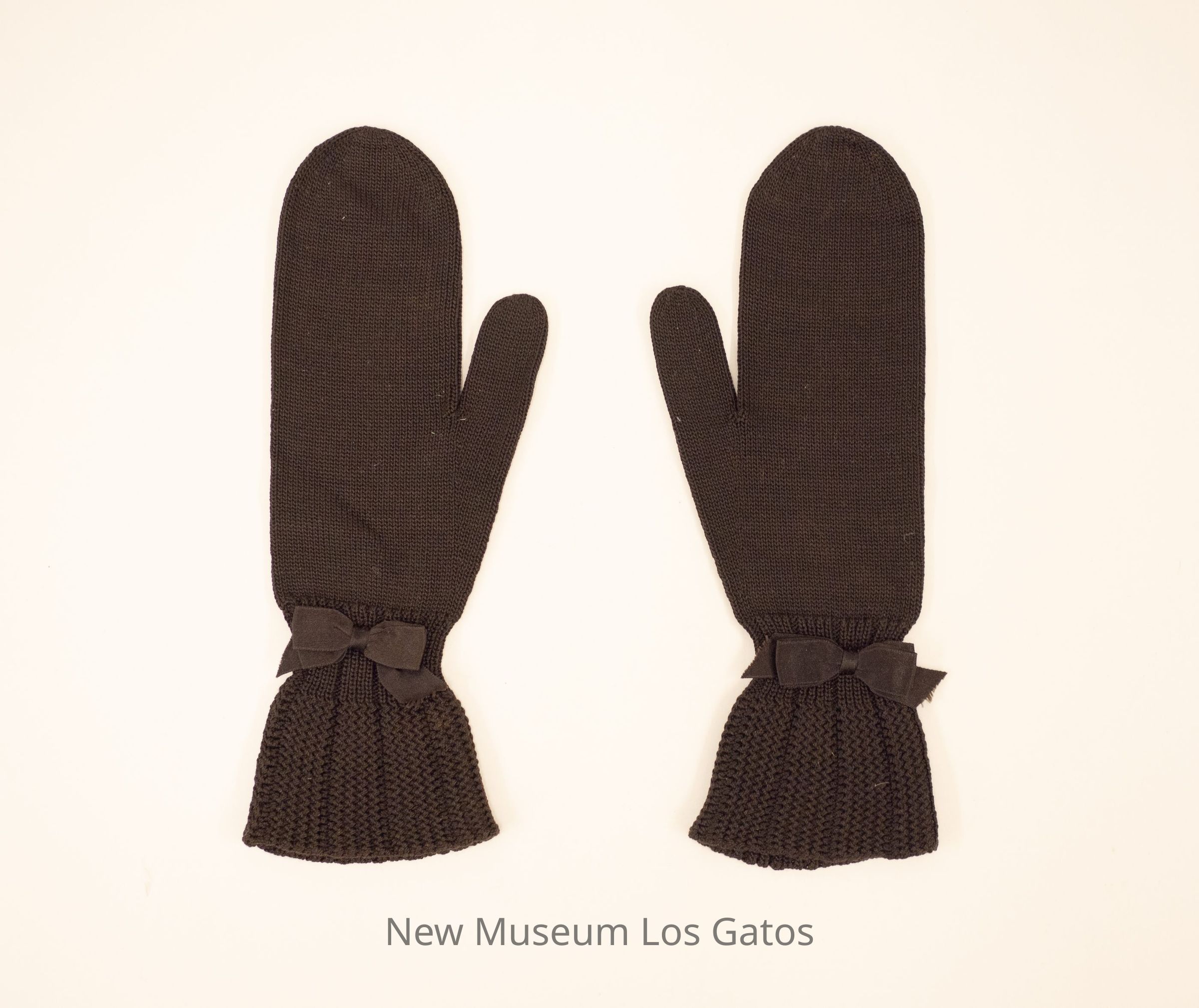 A pair of black, knitted wool mittens. There is a black bow around each wrist, and a more geometric pattern on the cuffs.Collection