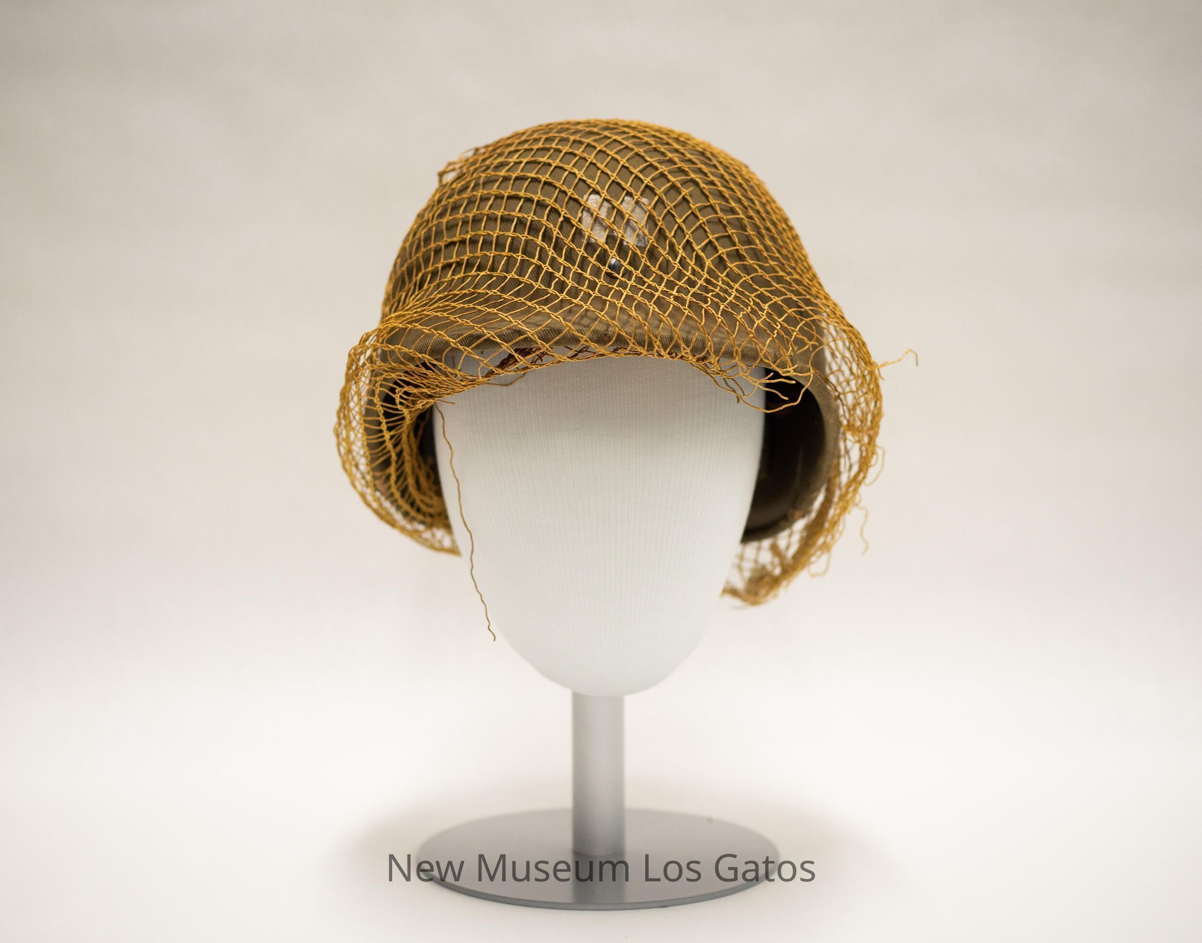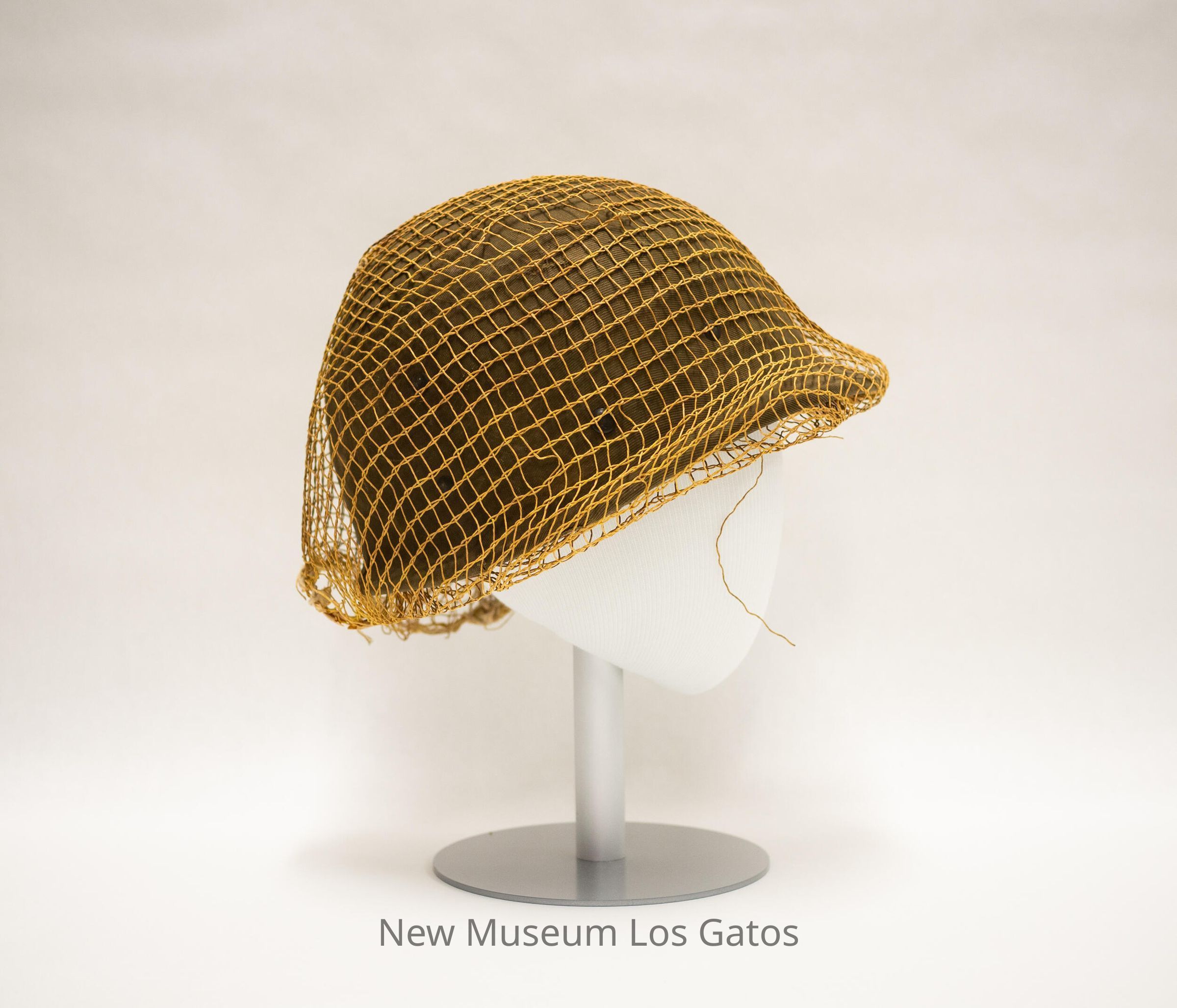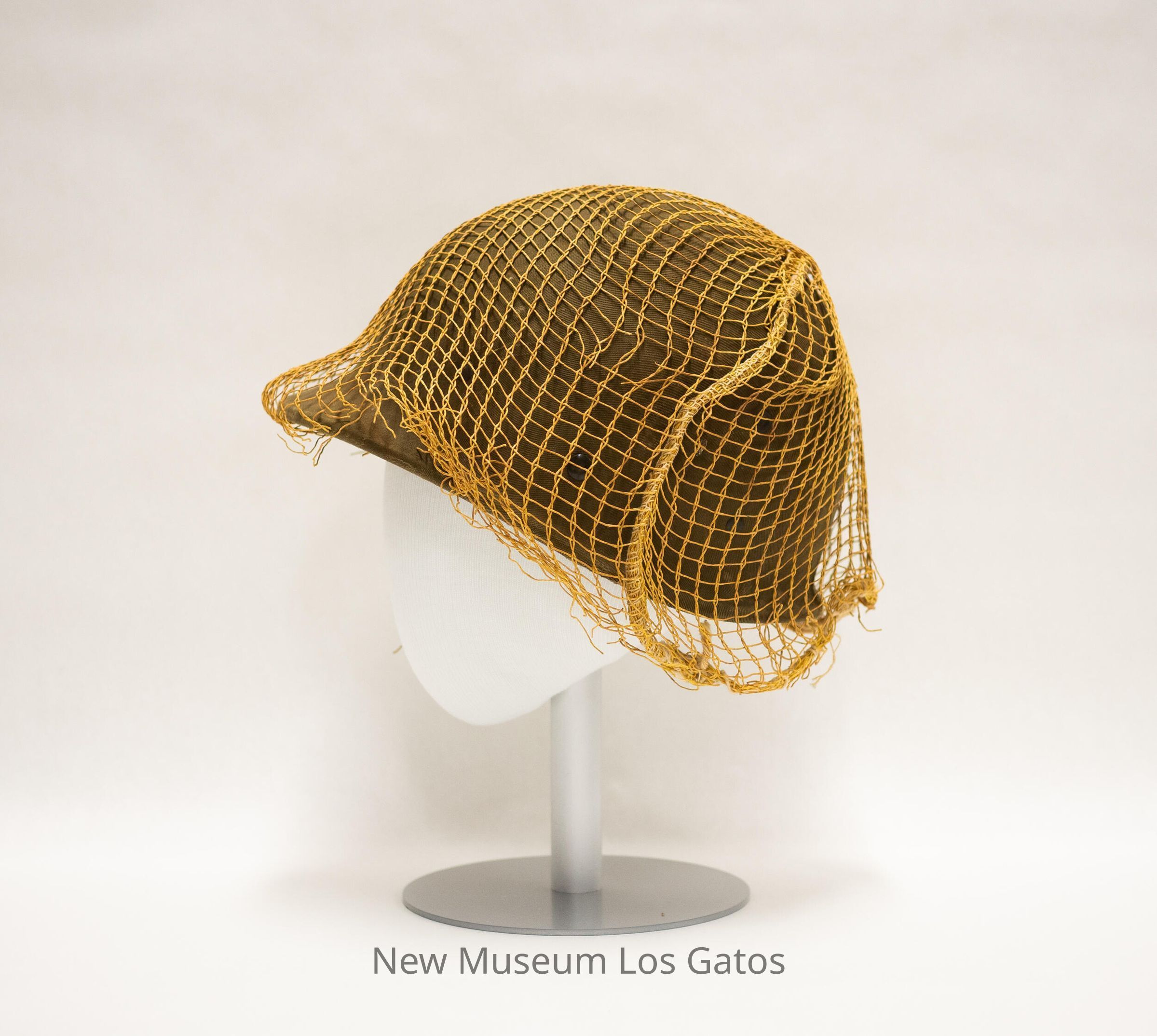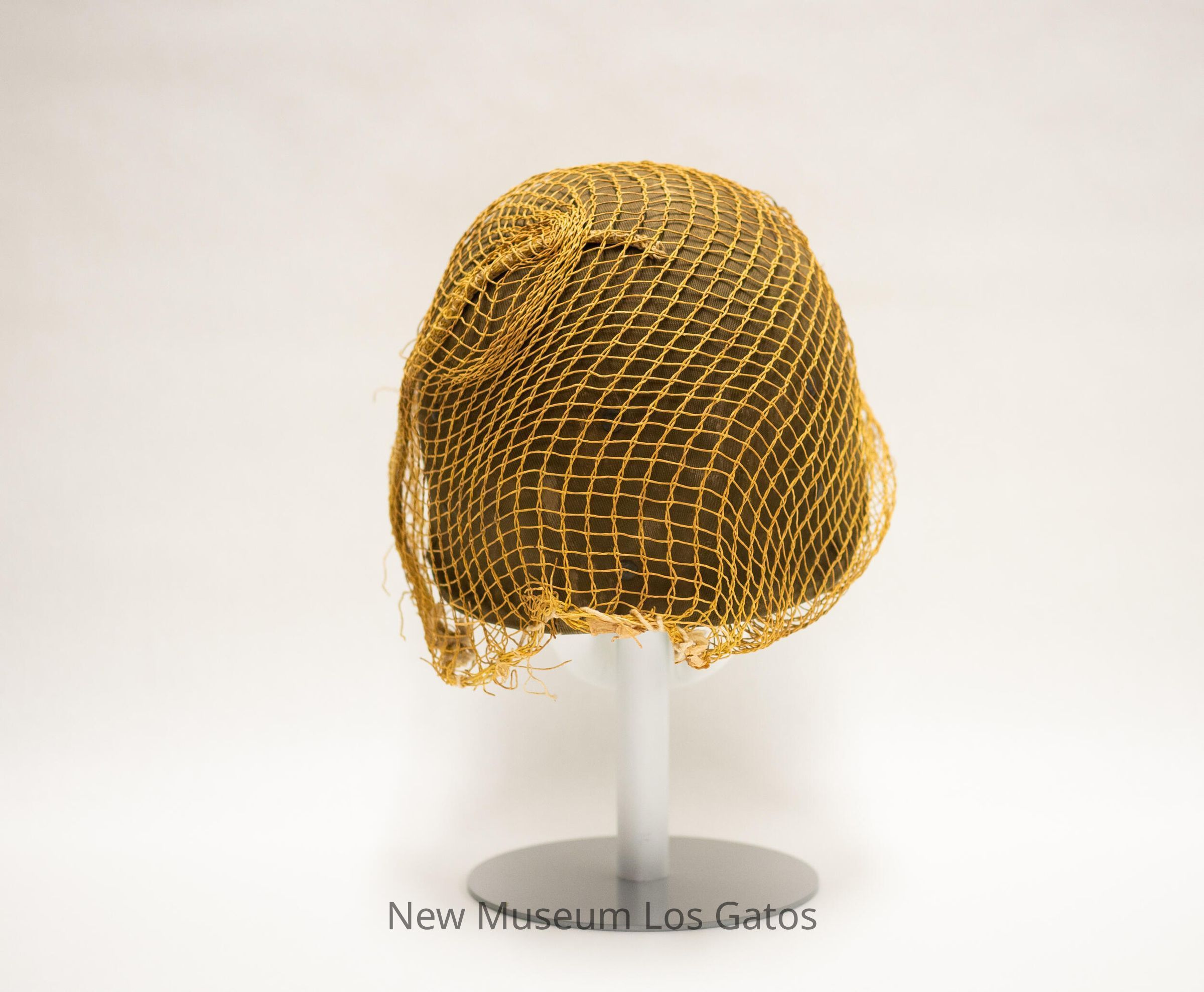 A hard, plastic military helmet, which appears to be a World War II M1 helmet, that is covered in olive green fabric. There is loose yellow netting covering the surface of the helmet. Inside, there are fabric cross straps as well as leather straps. There is also a silver "H"-looking symbol on the front of the hat.Collection