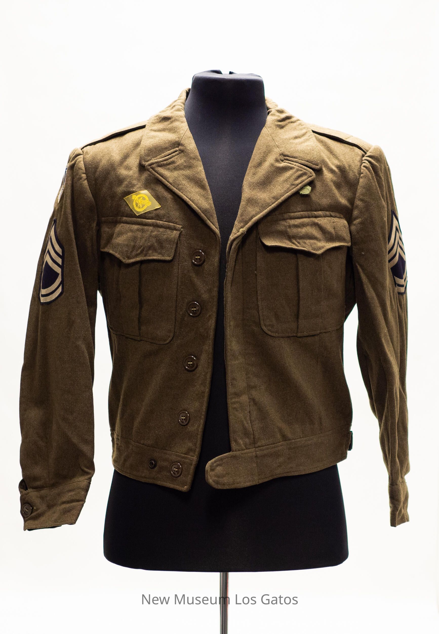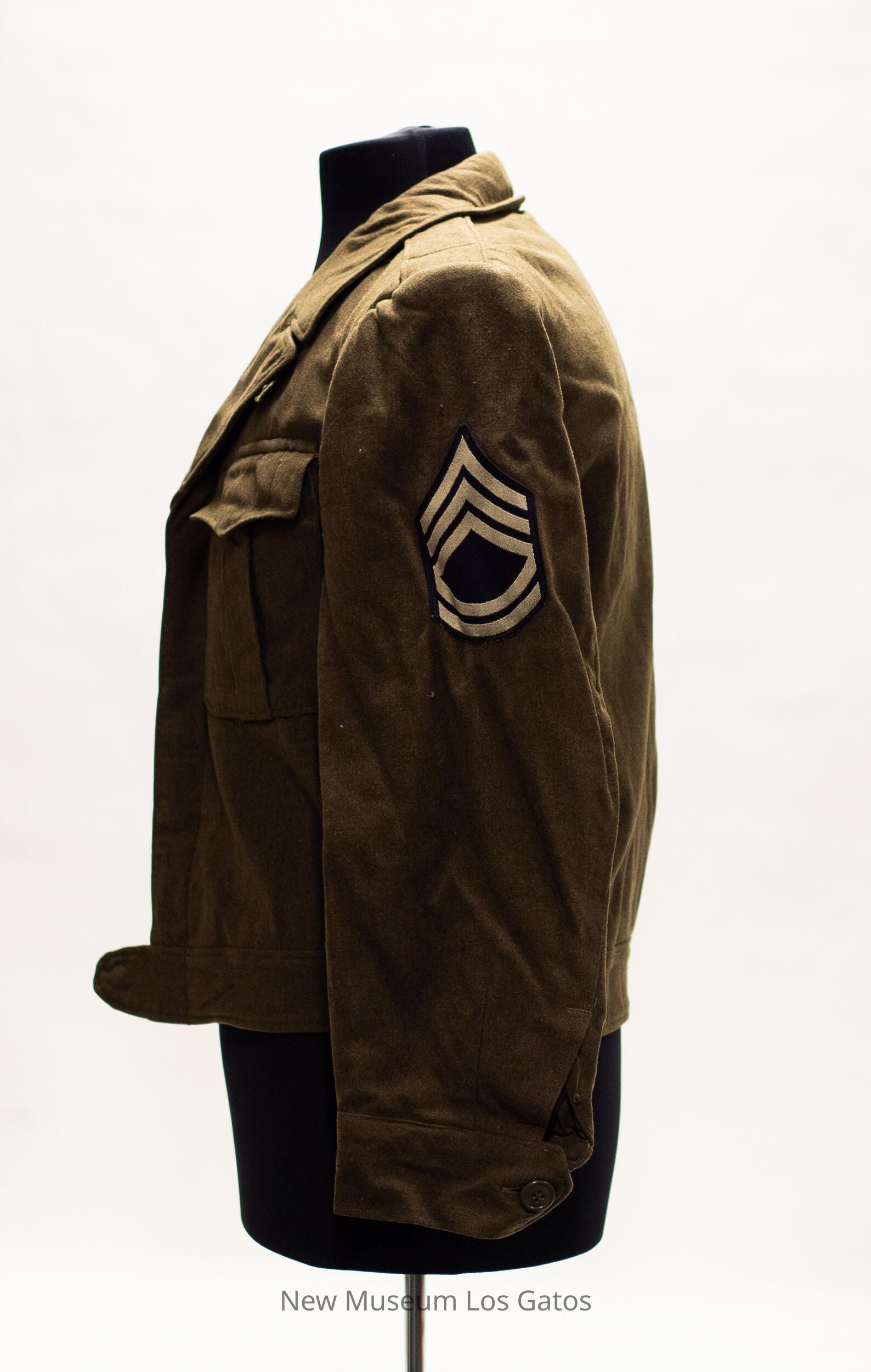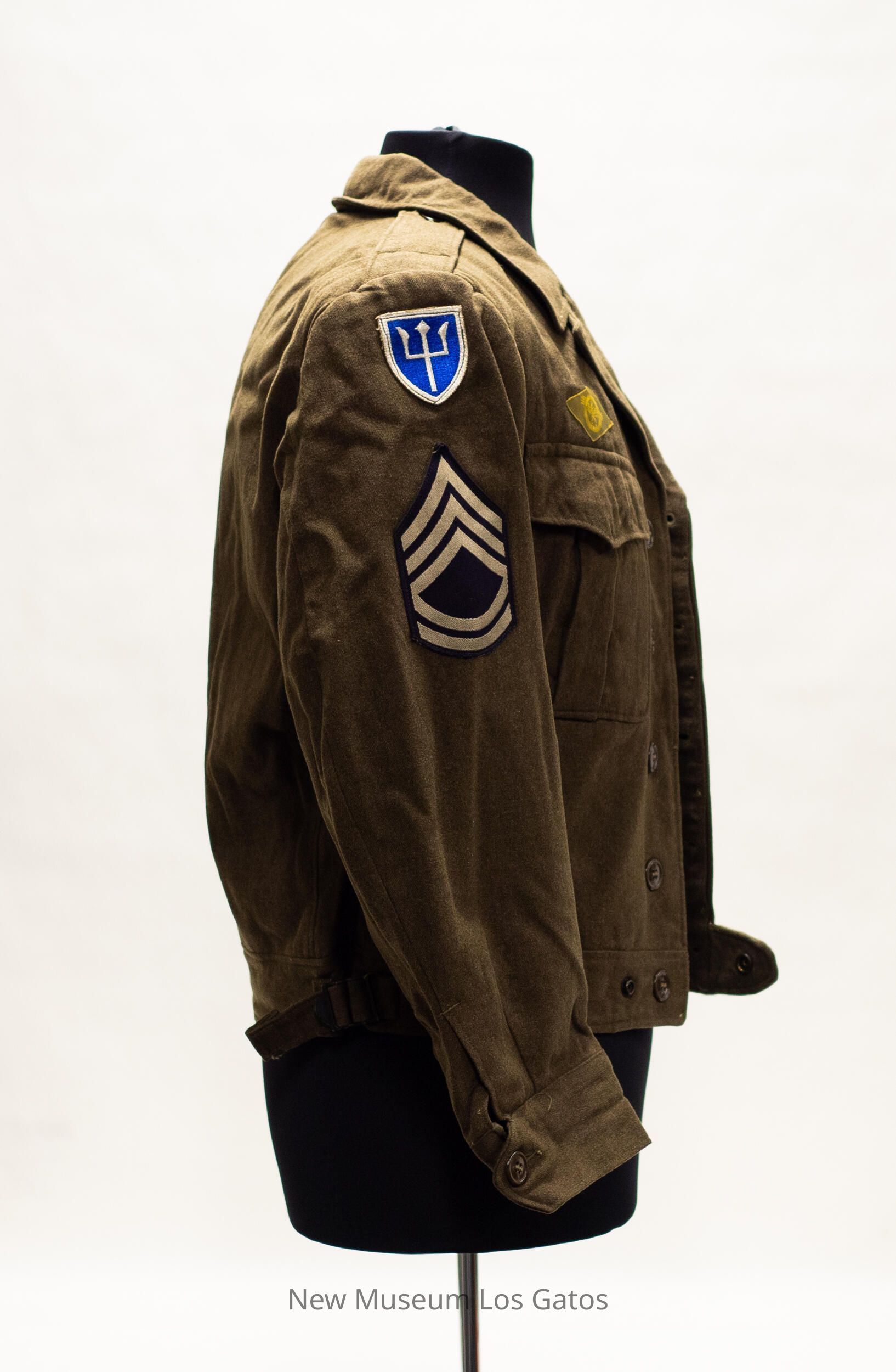 An olive drab "Ike jacket" that buttons up in the center, featuring a collar, two breast pockets with button-down flaps, two buckles around the waist for size adjustment, and buttons at the end of the sleeves to keep them closed. There are matching Sergeant First Class insignia patches on each arm, consisting of navy background and three gold triangles angling up and two lines at the bottom. There is an insignia patch for the 97th Infantry Division on the right arm, featuring a white, three-pronged trident on a blue background edged in white. An Honorable Discharge Patch, consisting of a golden eagle inside a golden circle, is above the right breast pocket.Collection