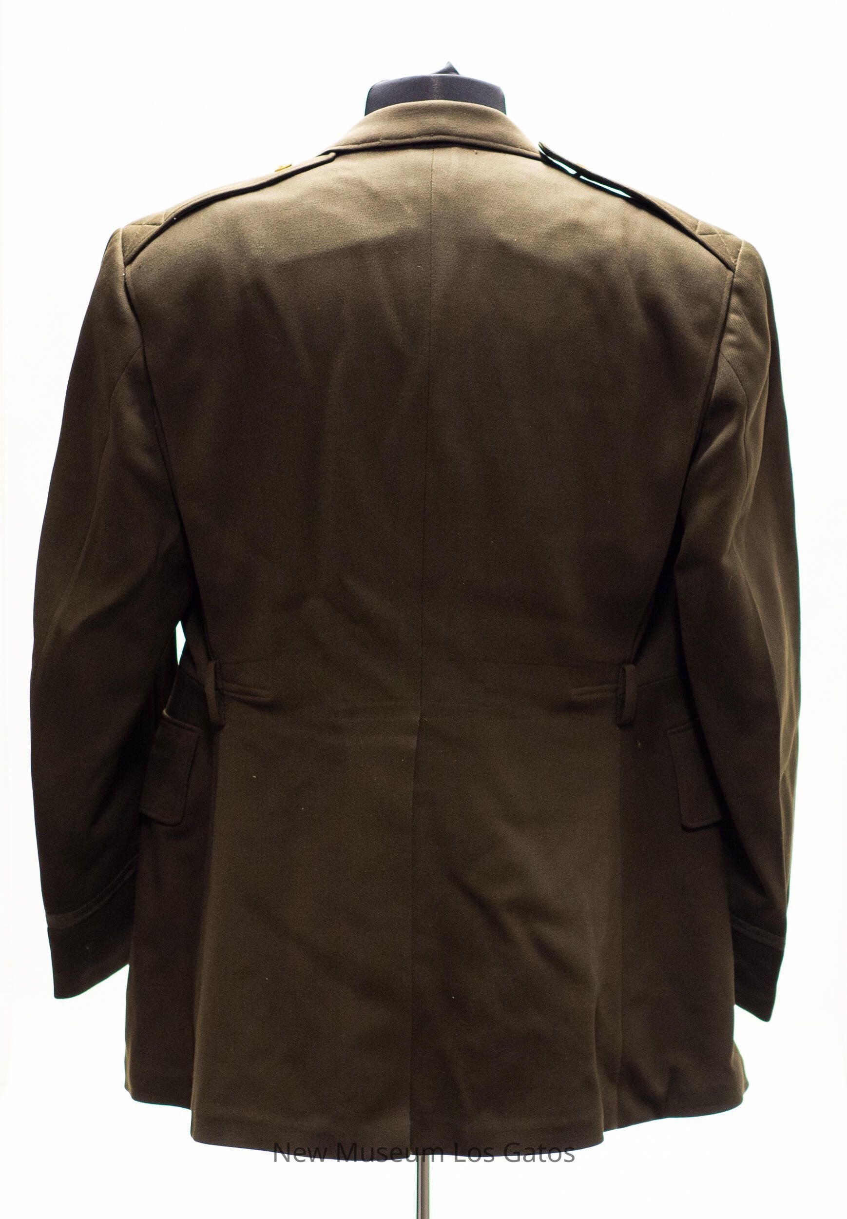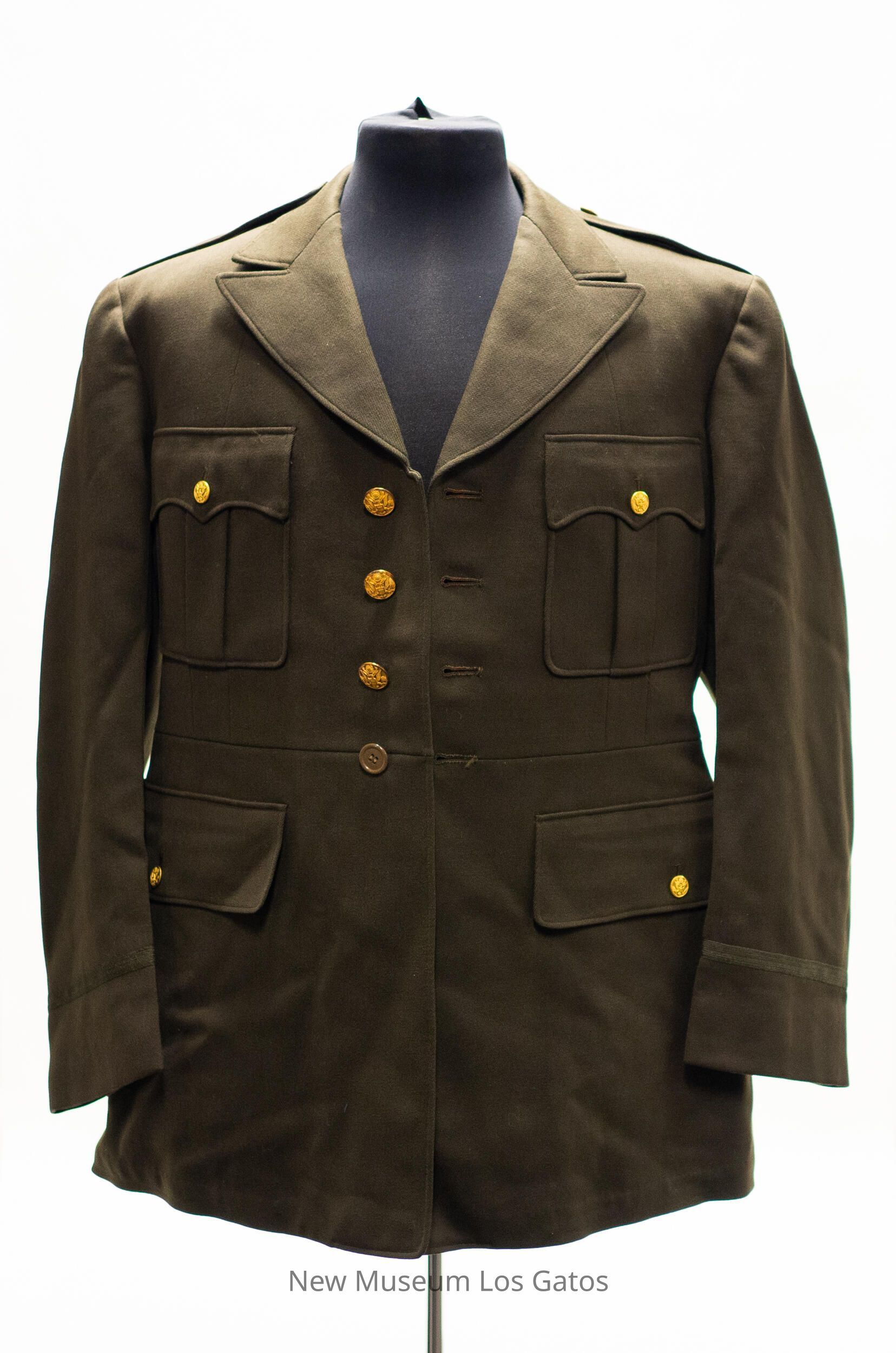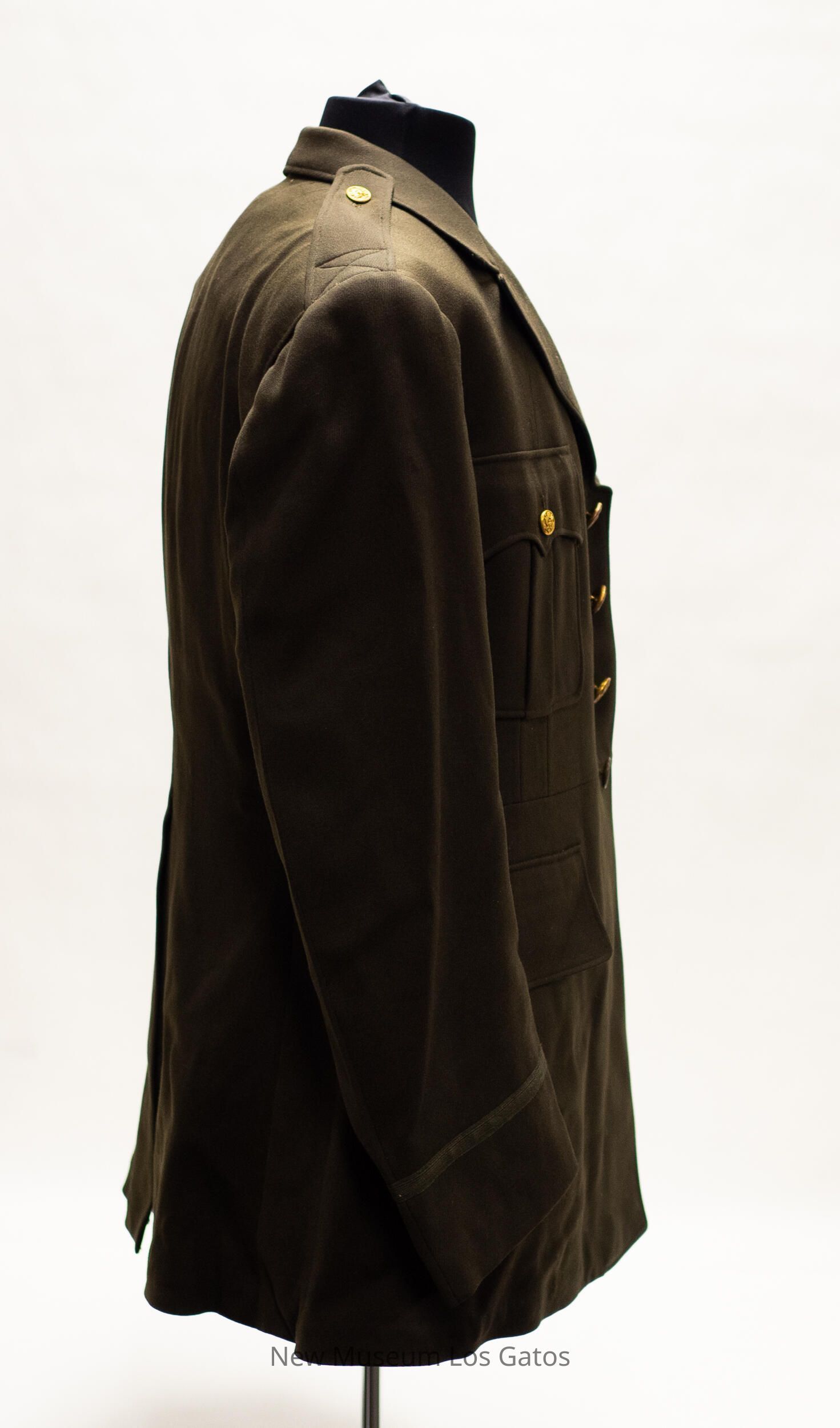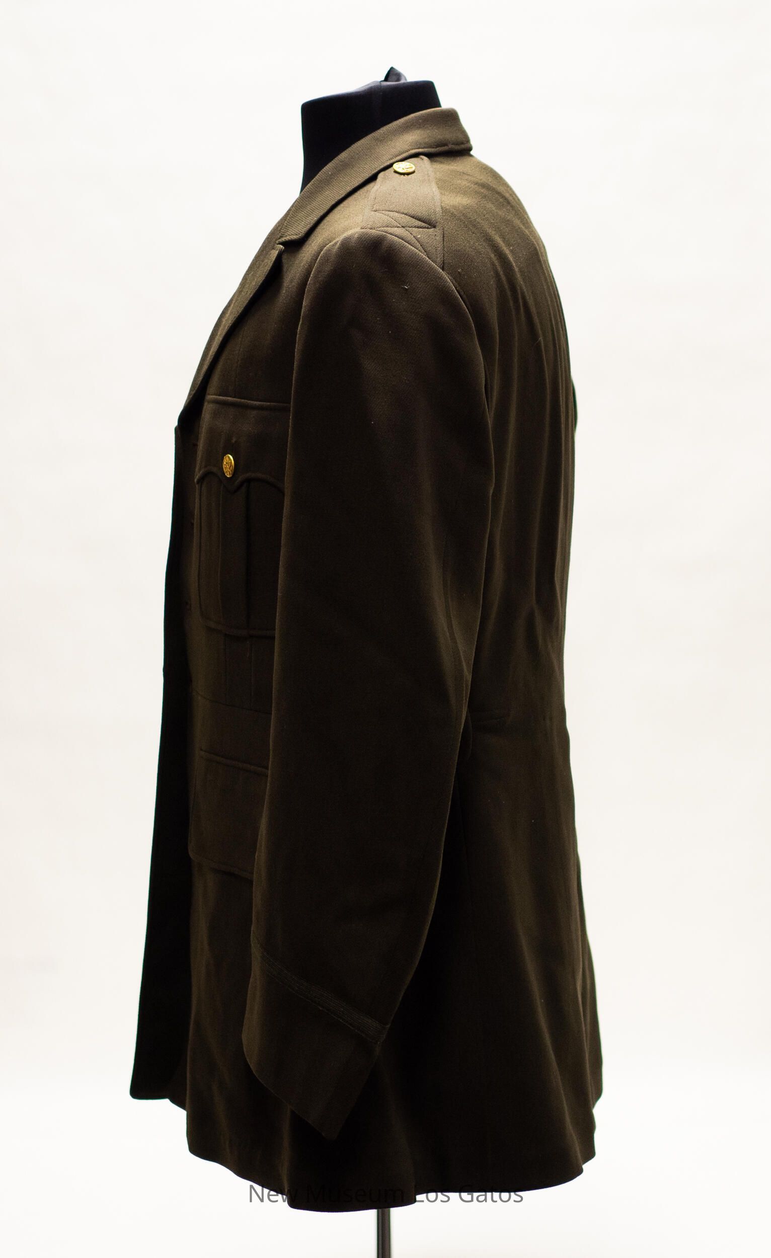 An olive drab coat made out of finer wool. The coat buttons up in the center, with three gold buttons with the United States Coat of Arms embossed on them, and one plain brown button. There are breast pockets and lower pockets on both sides of the coat, all of which close with a button-down flap that also features gold buttons with the coat of arms. There are also gold buttons with the coat of arms on the shoulder straps. The sleeves have a single stripe towards the ends of olive drab in a different, glossier fabric than the rest of the coat.Collection