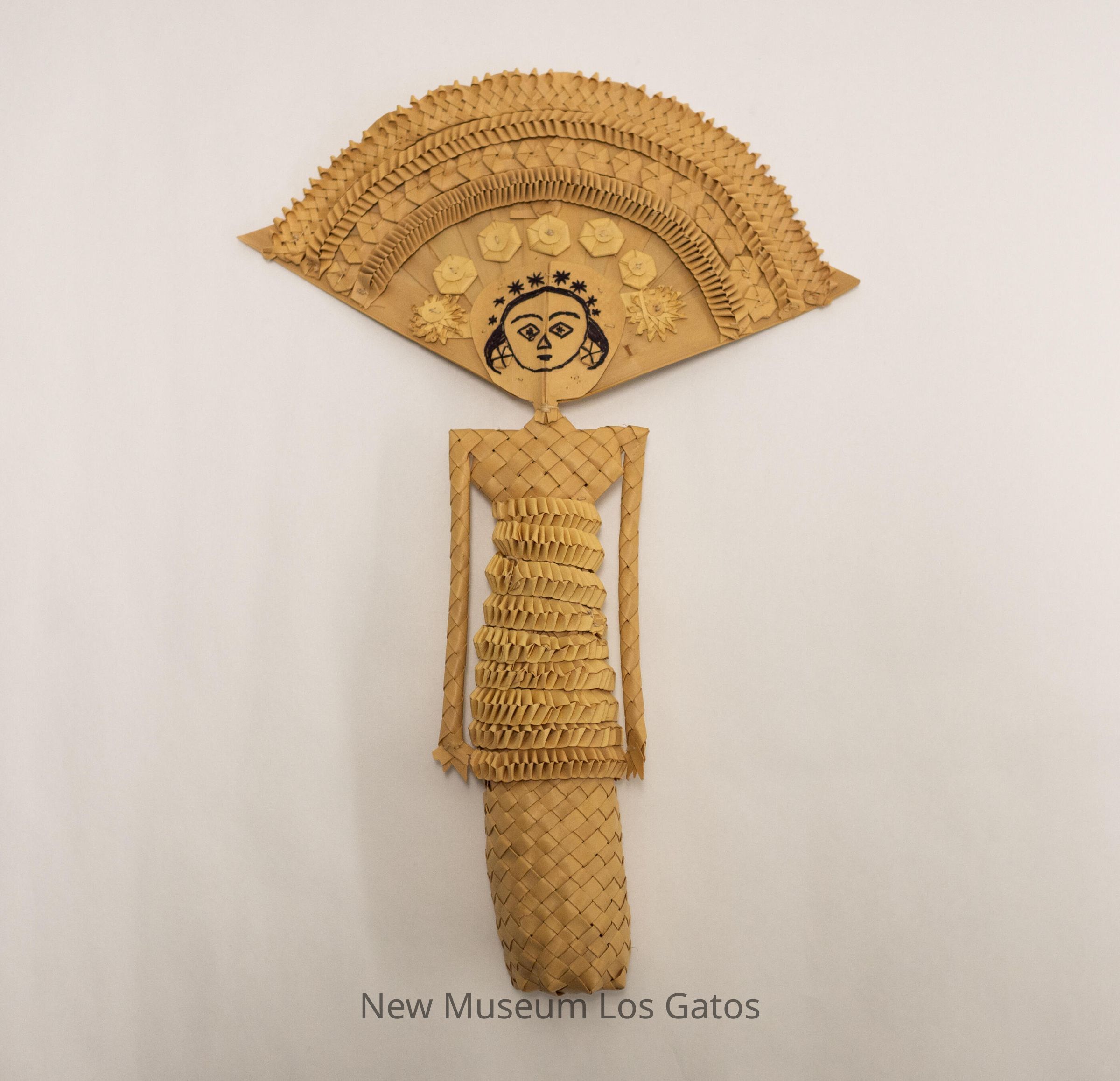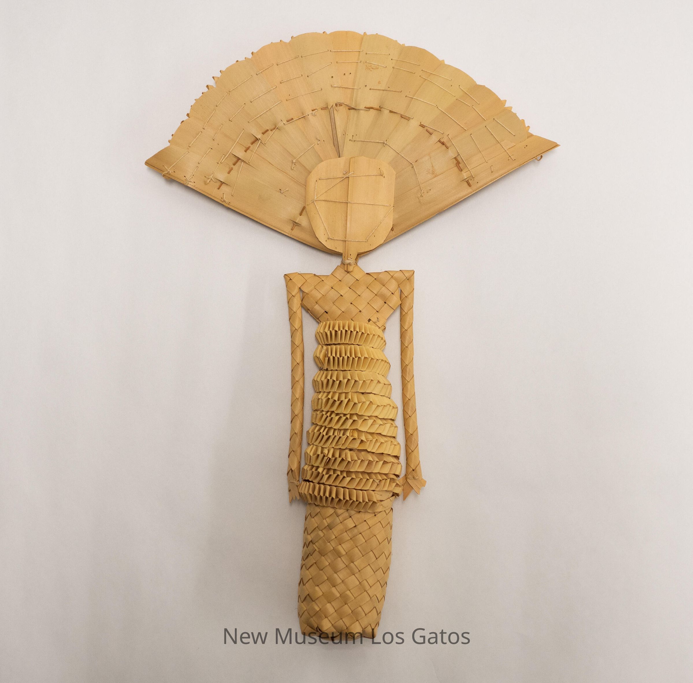 A tan-colored doll made from woven plant fibers. The body of the doll is cylindrical, with ruffles wrapped horizontally around the center of the body. The head is fan-shaped, with facial features and hair sewn on with black thread. Above the facial features are decorative stripes, ruffles, and geometric shapes, forming a headdress.Collection