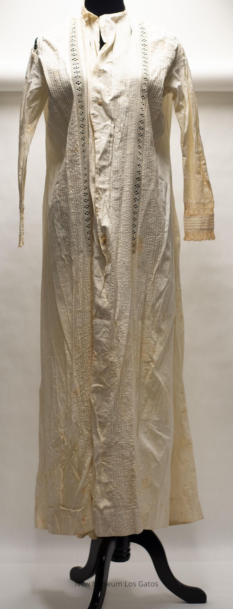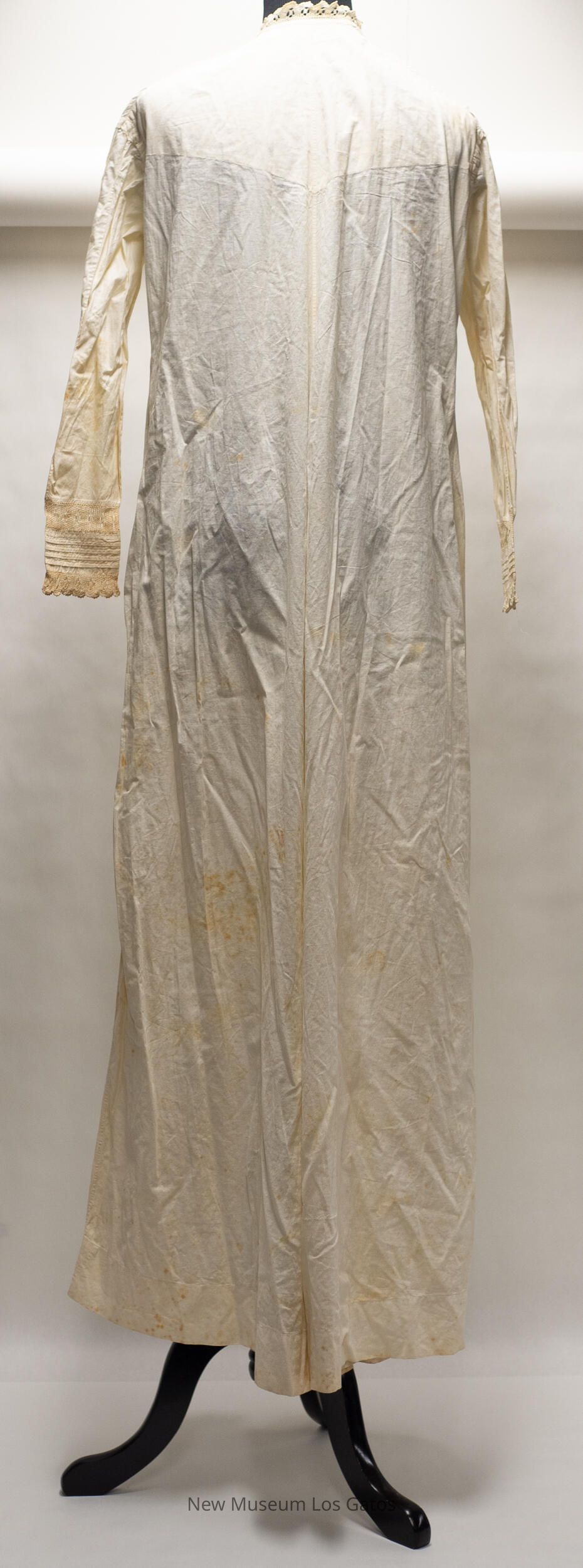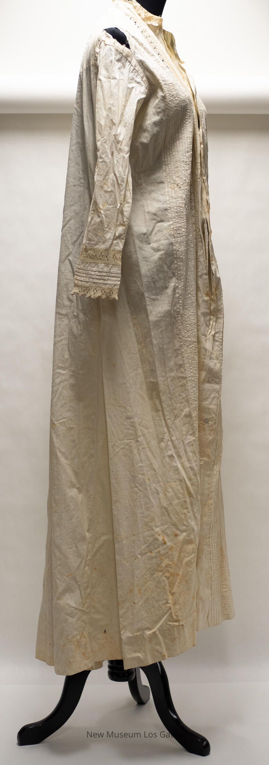 A long, cotton dress that buttons up in the front with small, iridescent white buttons. There are two horizontal bands of lace and one horizontal band of french pleats at the bottom of each sleeve, two vertical bands of french pleats and one vertical band of lace on each side of the front. There is also lace around the collar.Collection