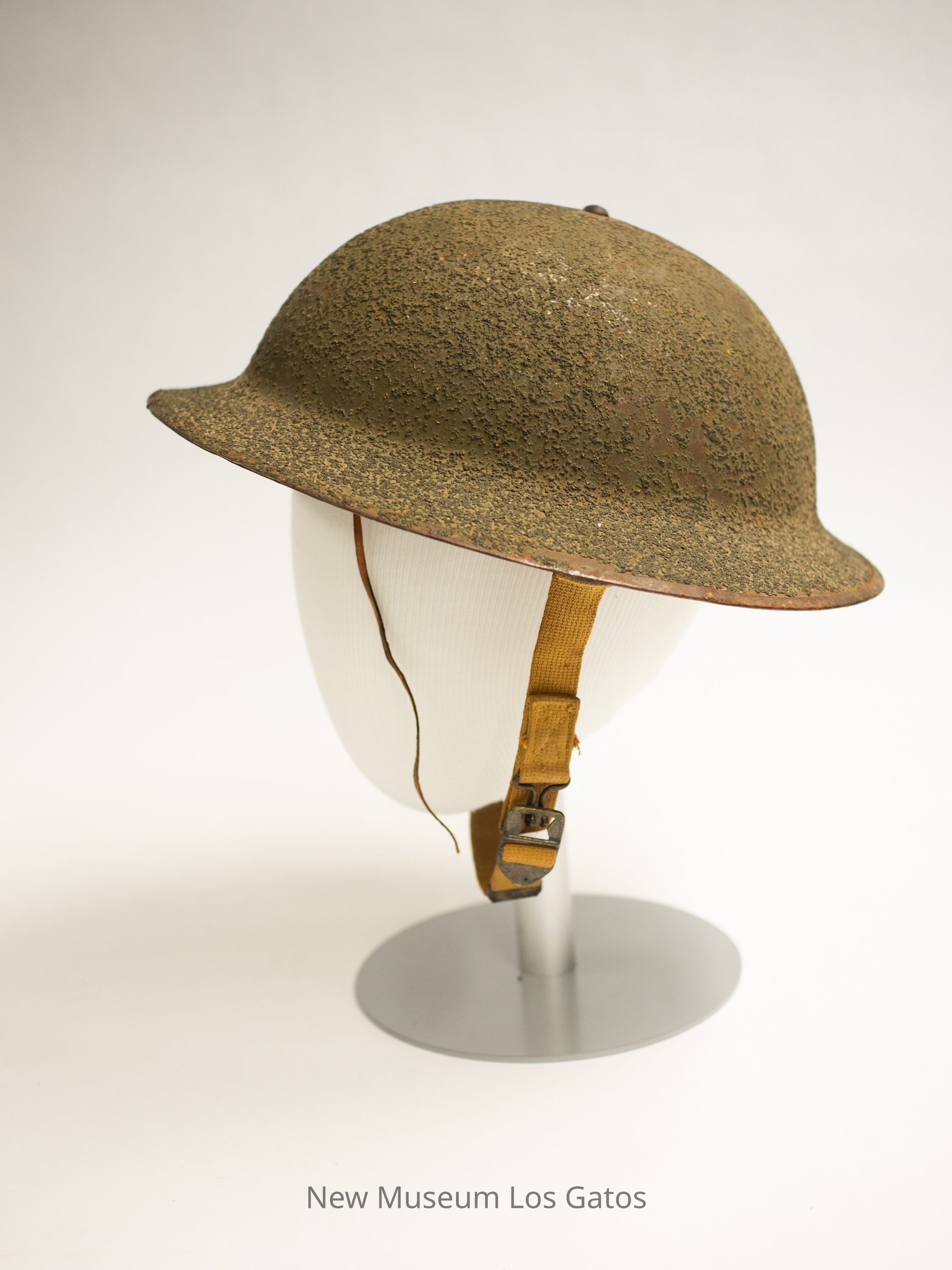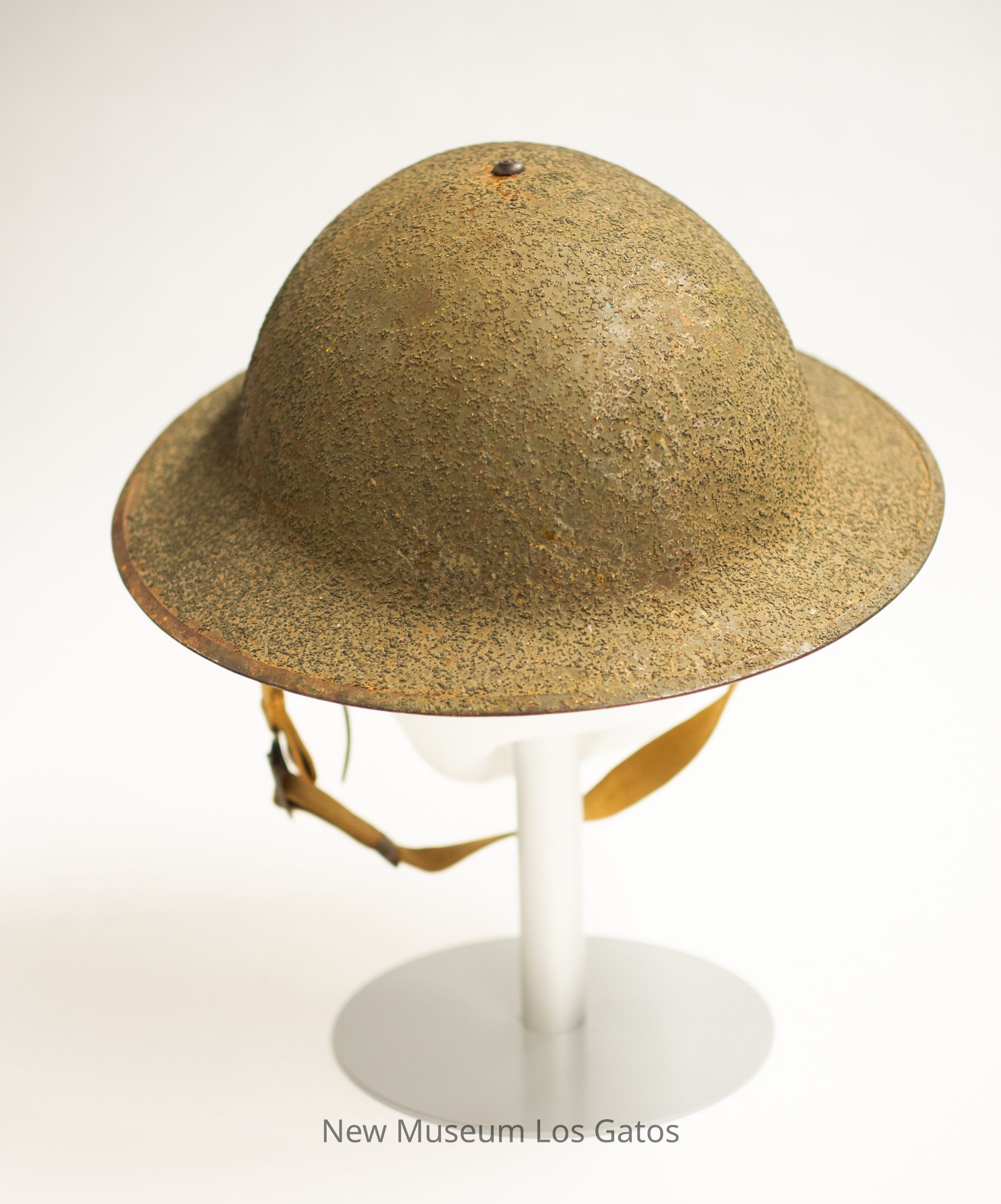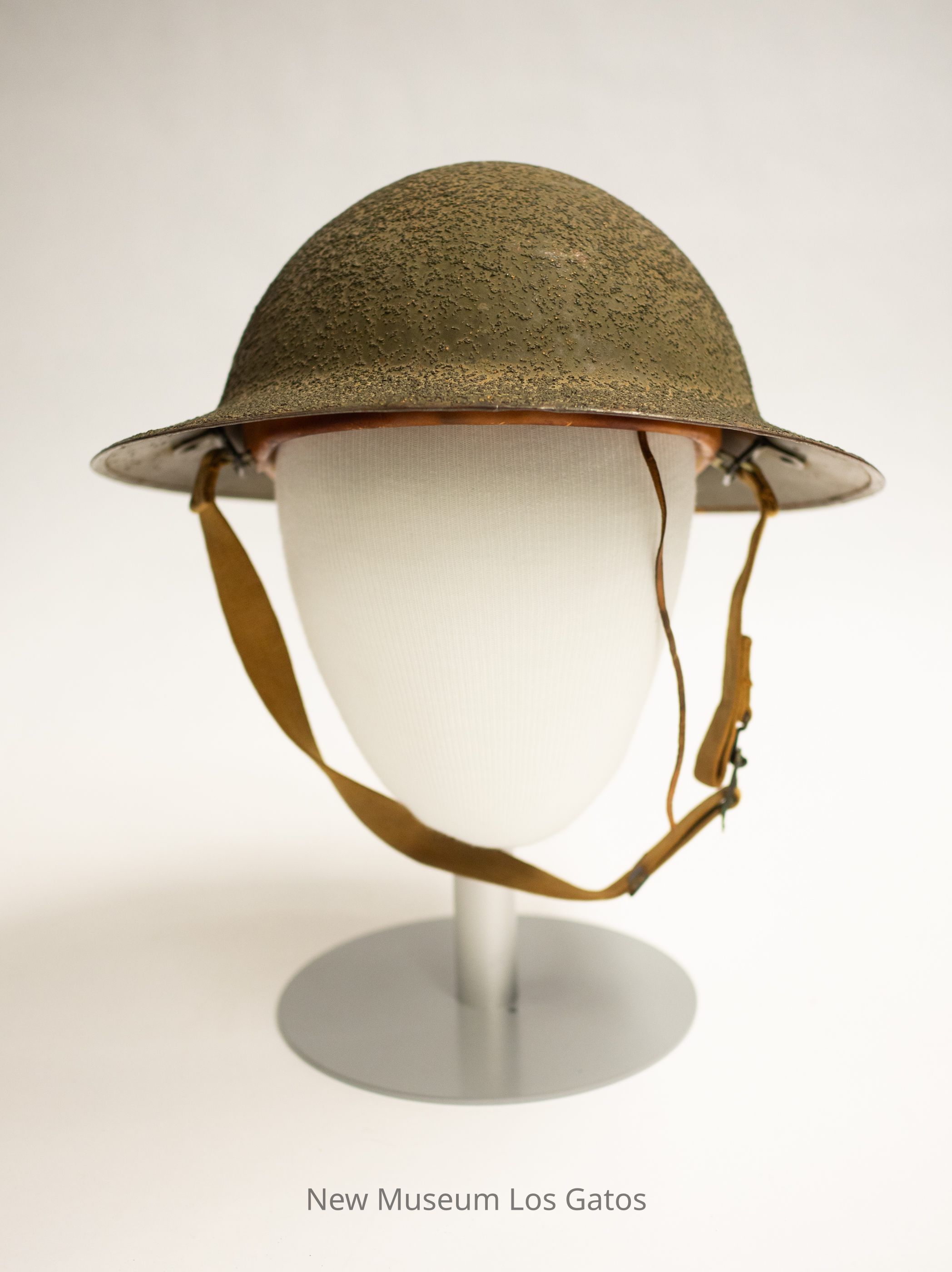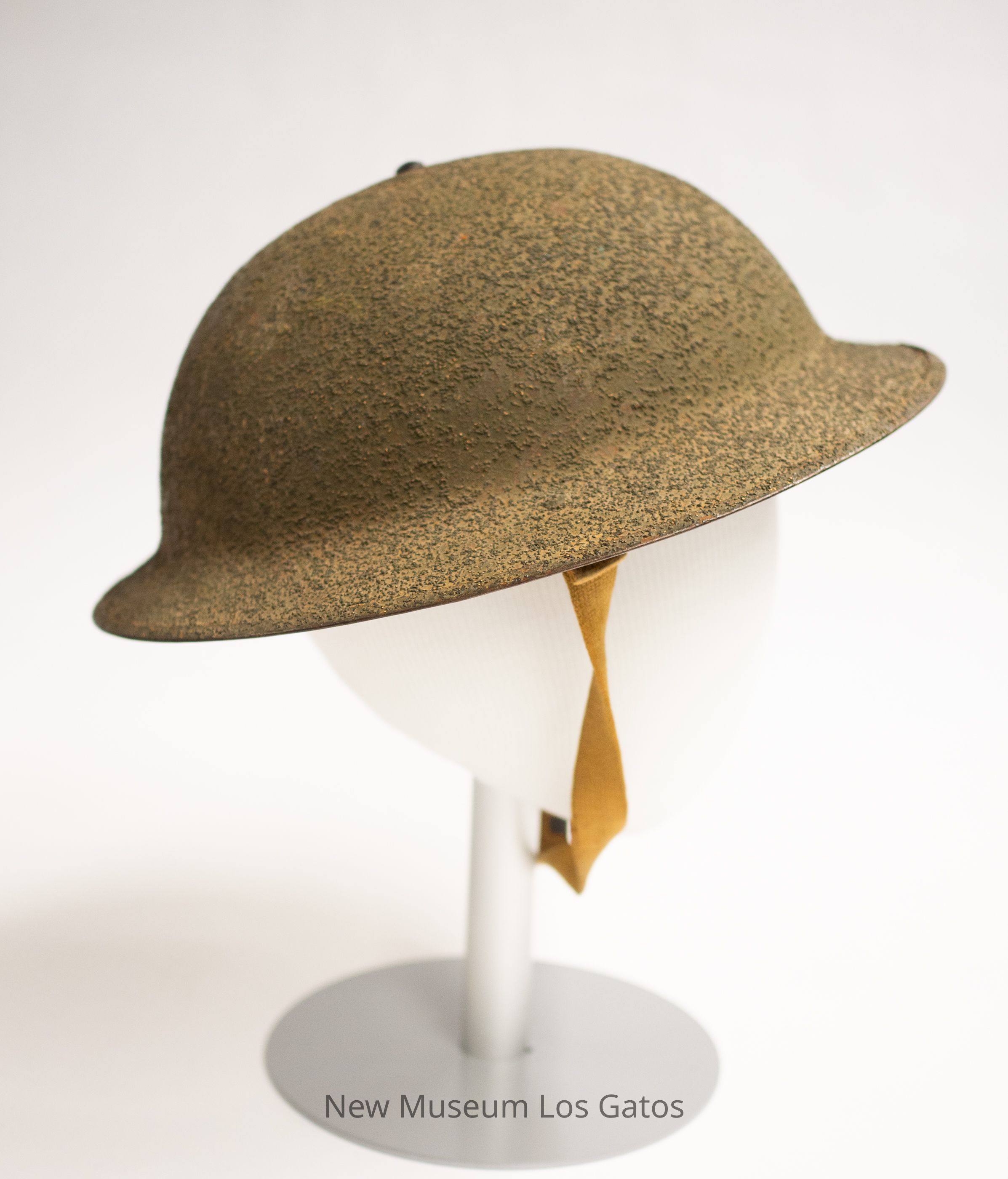A hard, steel, olive green hat with a metal ball at the top. The inside of the hat is light brown leather, with two yellow fabric straps for securing the hat.Collection