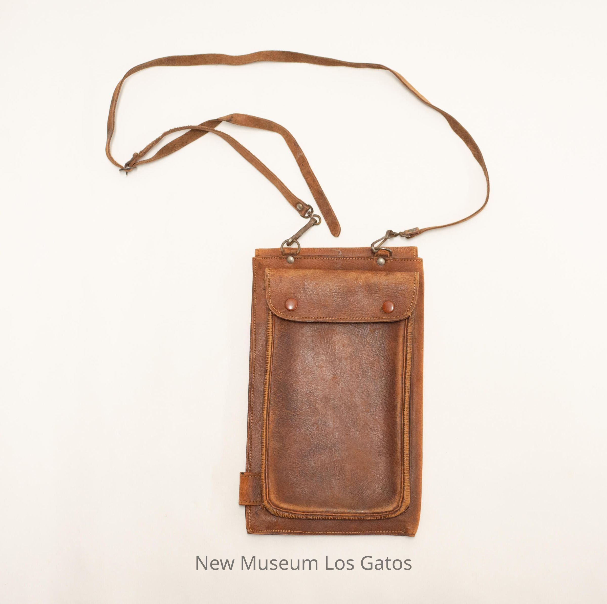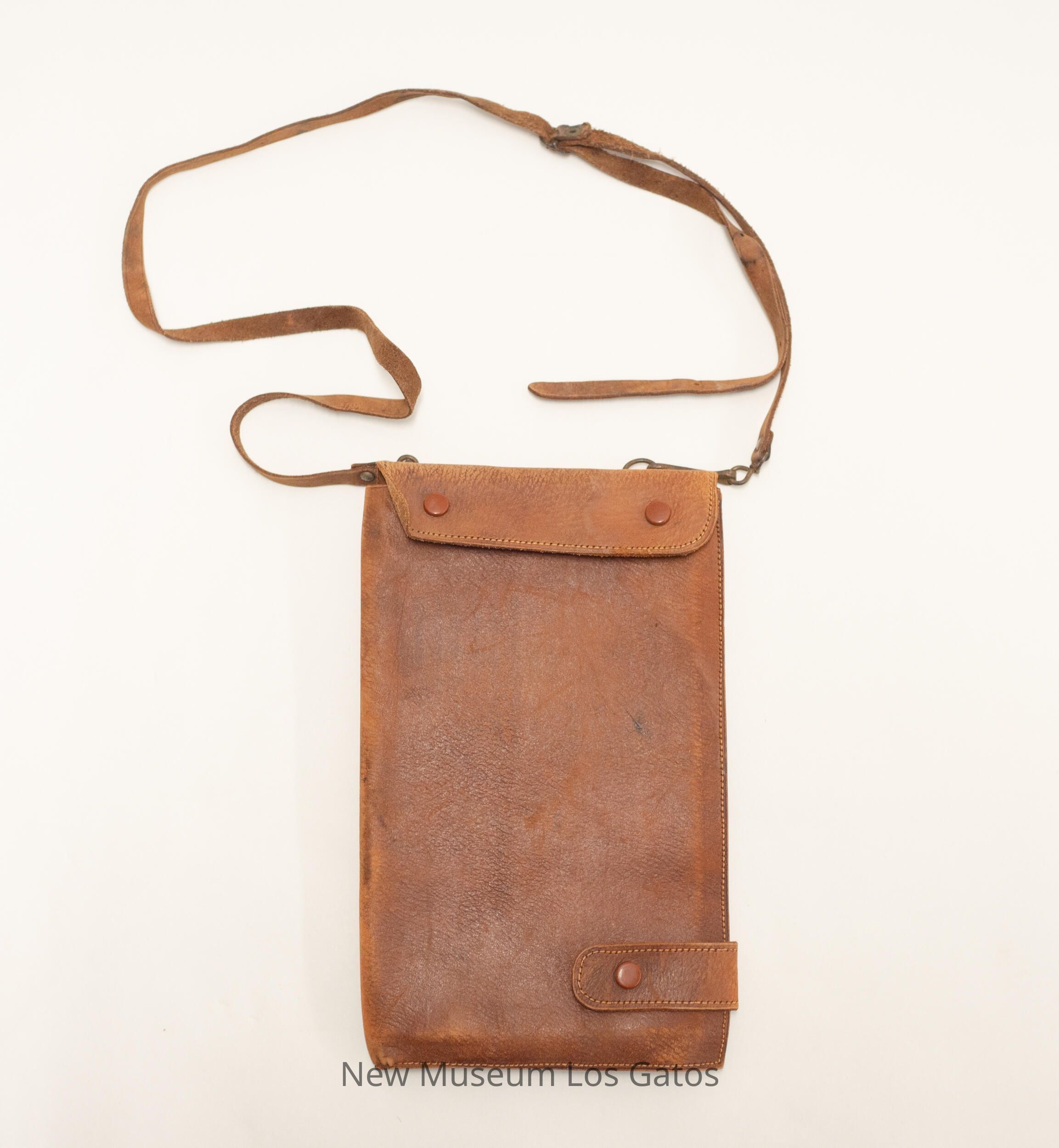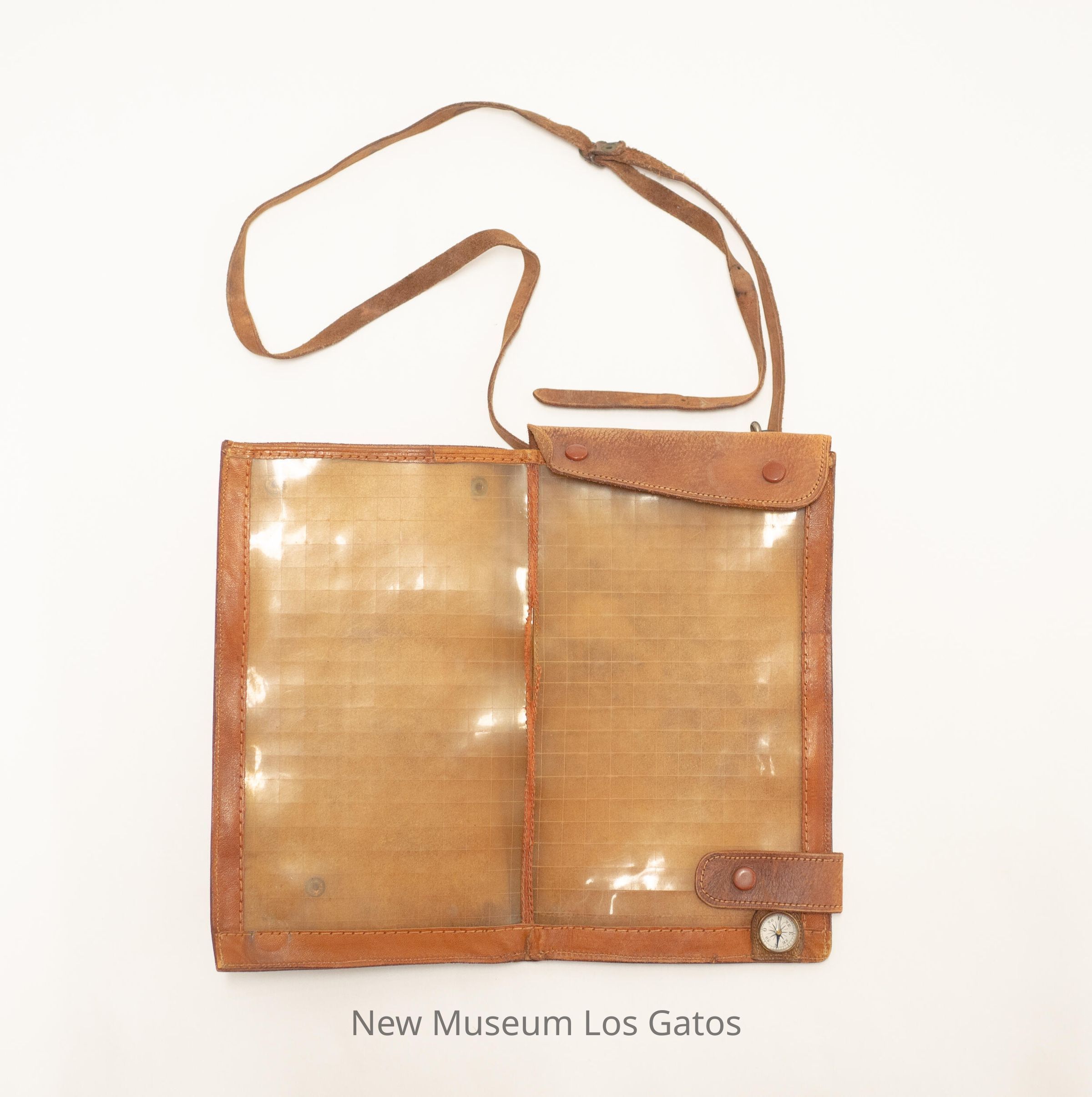 A brown leather bi-fold case, that opens to the left. On the front of the case is a large pocket, with a flap that snaps in place. There is also a leather strap along the bottom that snaps to the back, and an leather flap on top that also snaps to the back, keeping the case closed. Inside the case is a plastic sleeve with a grid pattern on it. There is also a small compass attached to the inside bottom right (viewer's) corner. The adjustable leather straps are attached to the top of the case via metal clips.