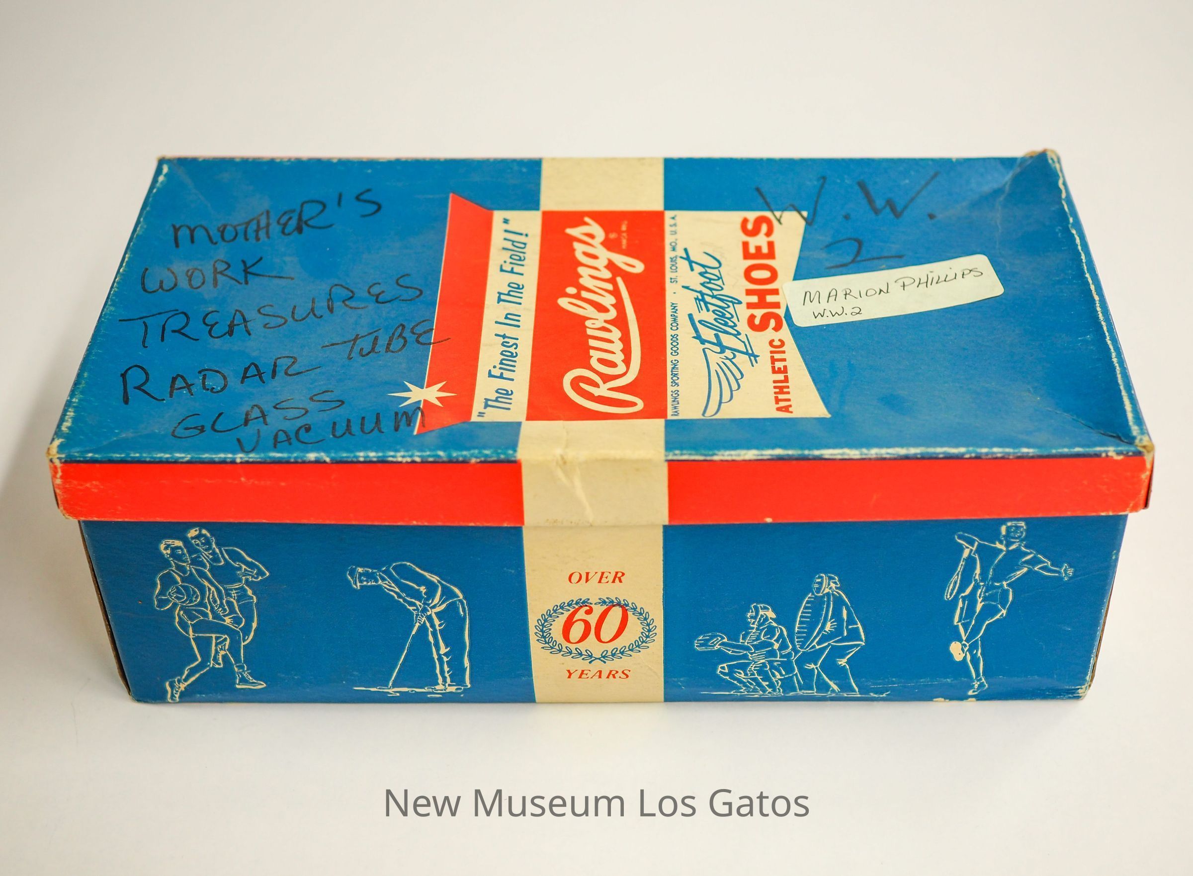 Fragments of some device dated to WWII, stored in a red, white, and blue Rawling's Athletic Shoe Box. The fragments consist of various clear and green-tinted glass tubes, wires, and lightbulbs of indeterminate use.Collection