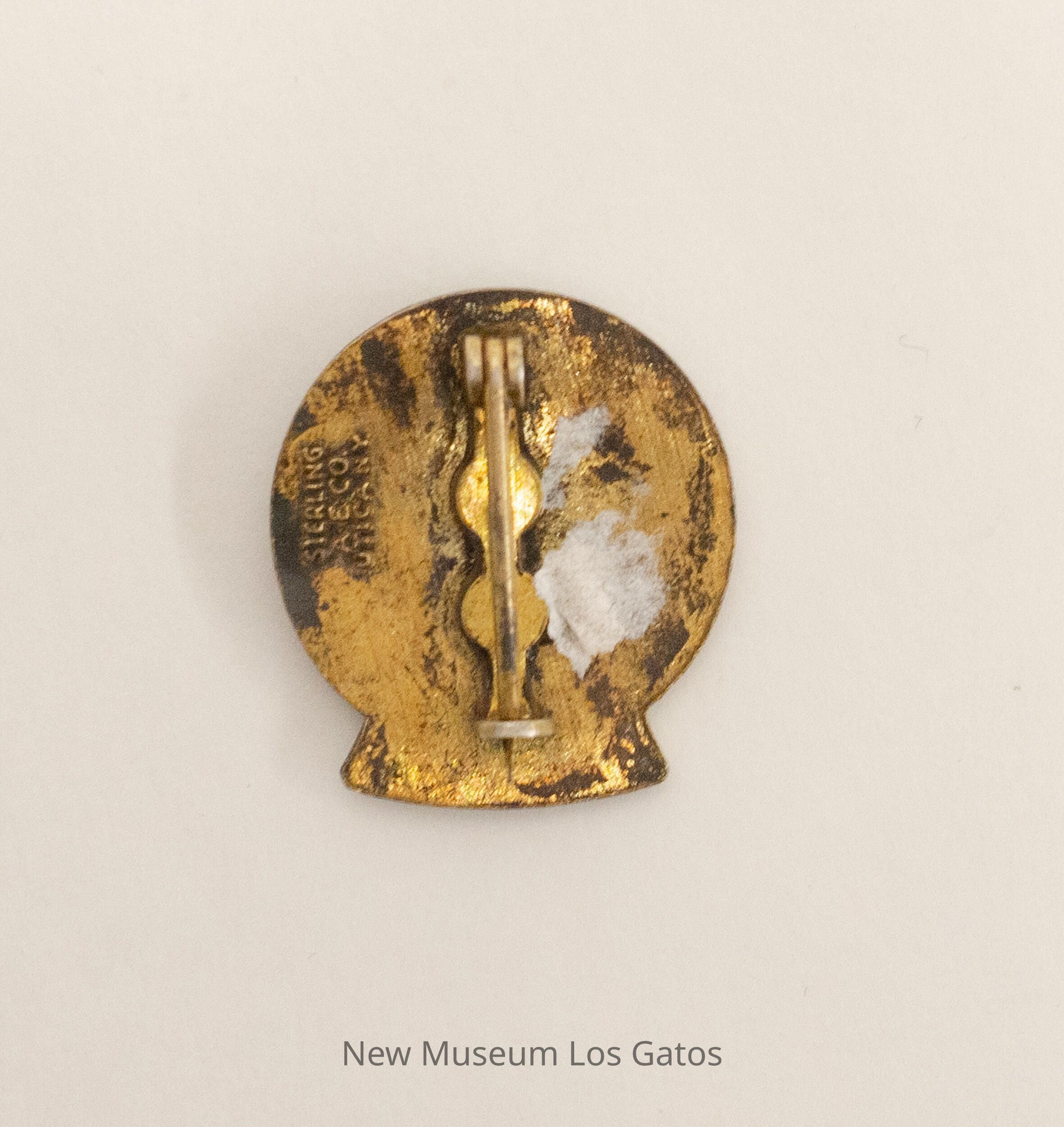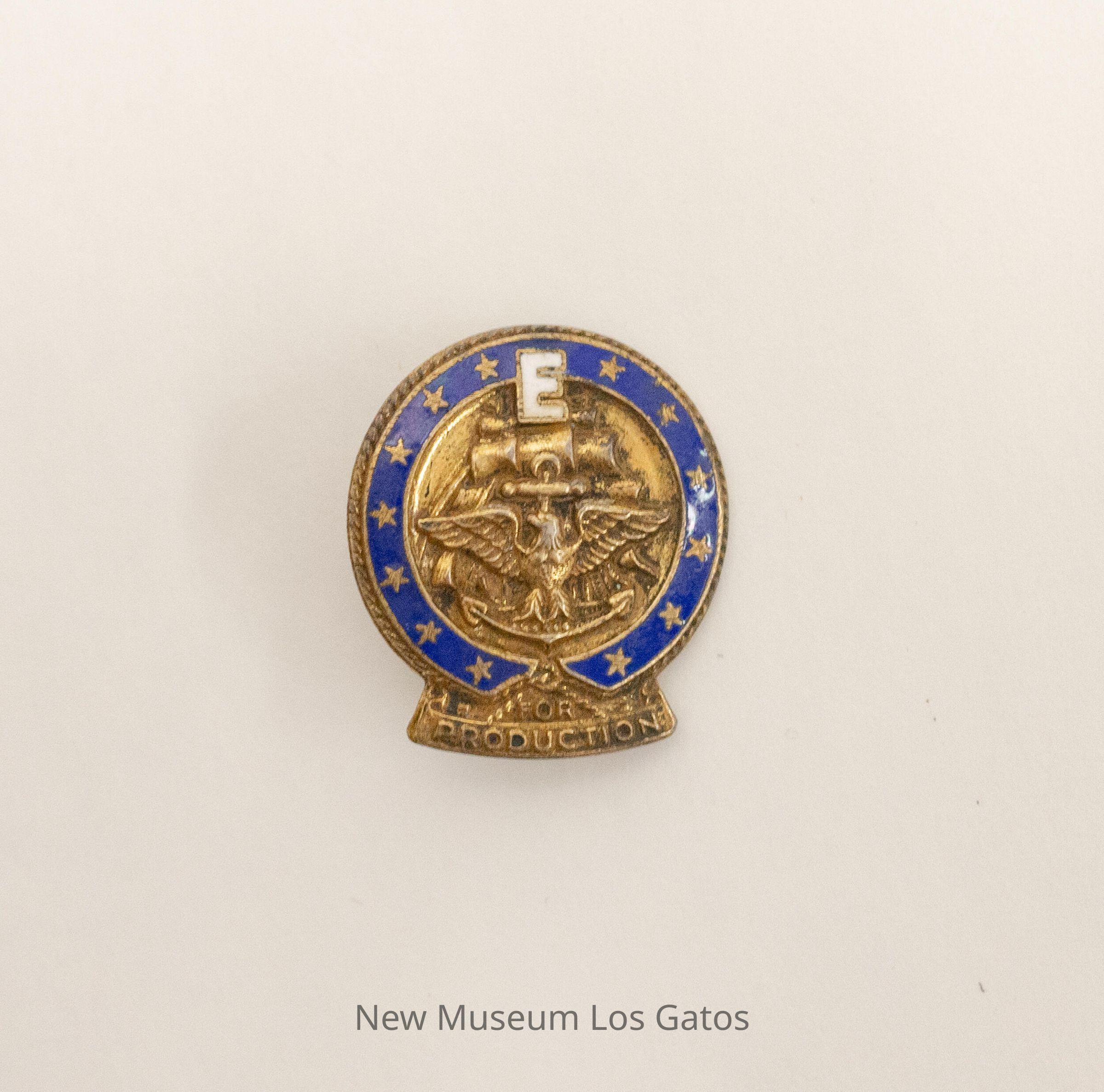 The Navy Production Award: a small, golden pin, with an eagle looking to the left, with its wings spread, on top of an anchor. There is a blue banner with gold stars along the border of the pin, with a large white "E" on the top of the pin, and "FOR PRODUCTION" in gold at the bottom of the pin.Collection