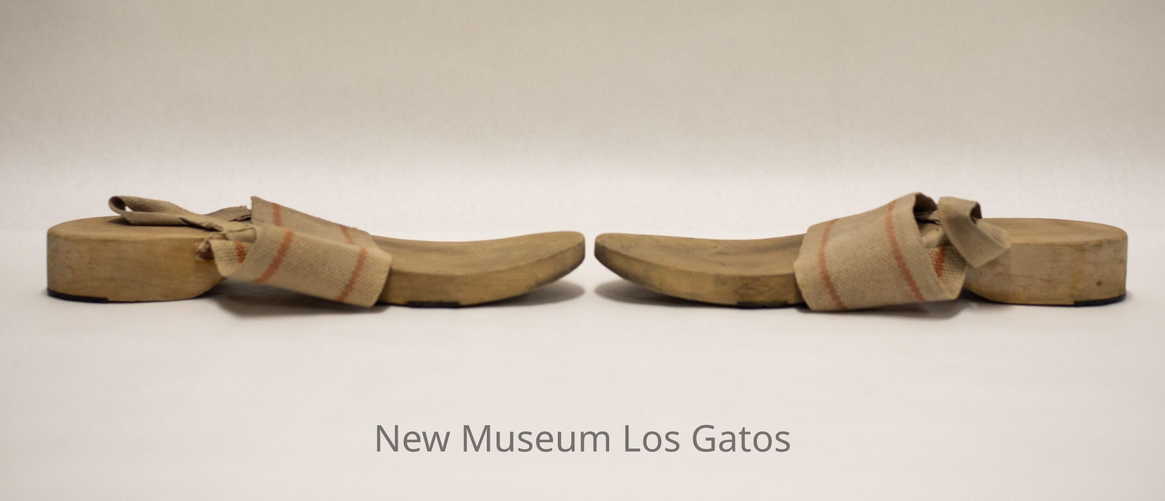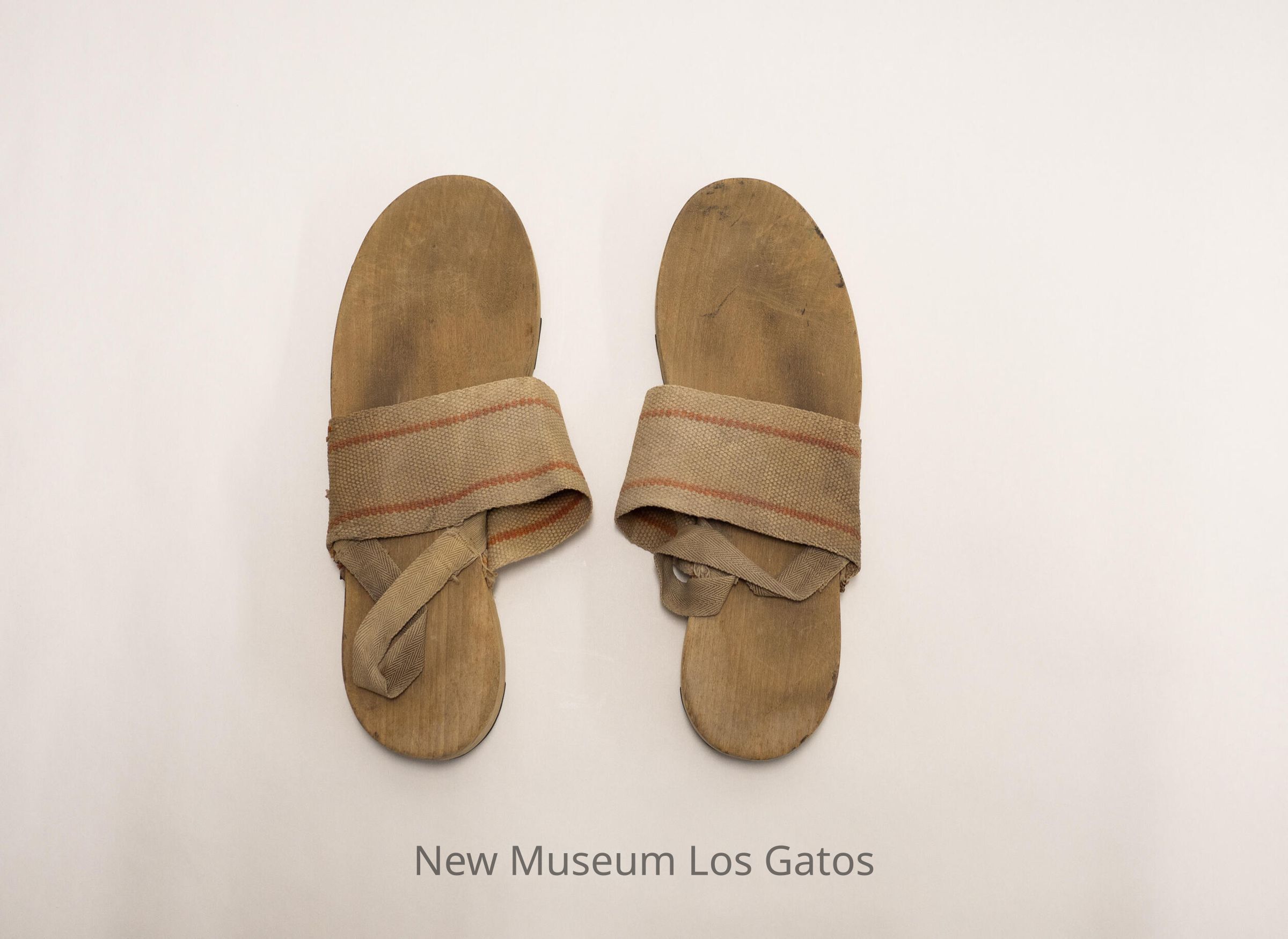 A pair of wooden shower clogs, of military issue. Clogs have an over-the-foot strap with two red stripes, as well as a thin heel strap. On the bottom of the clogs are two strips of rubber, to prevent slipping.Collection