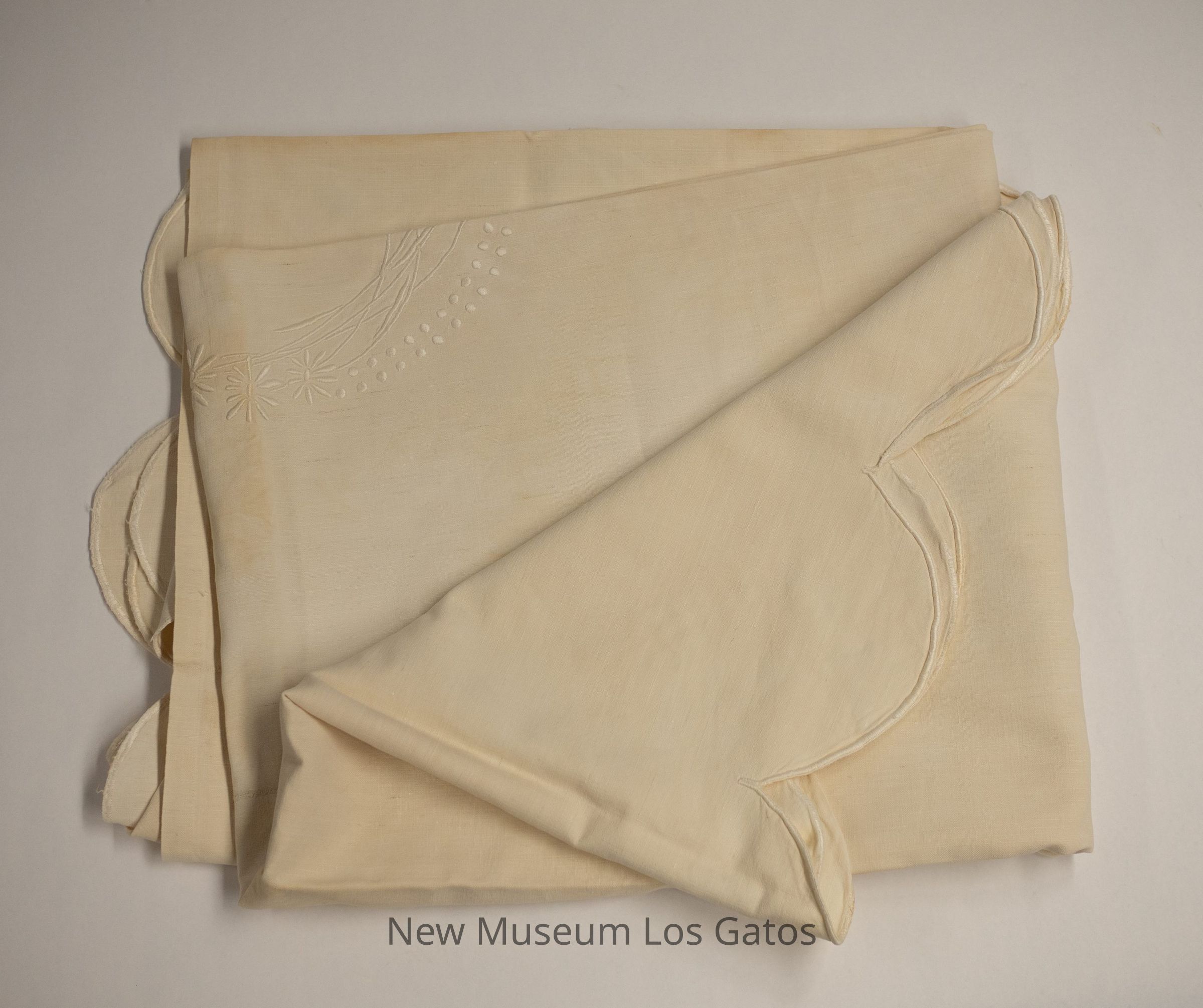 A homespun, plain linen top sheet for a child's bed. The right, left, and bottom edges are scalloped, with white embroidered trim detailing. There is decorative circle of embroidered flowers and polka dots in the center.Textile Type