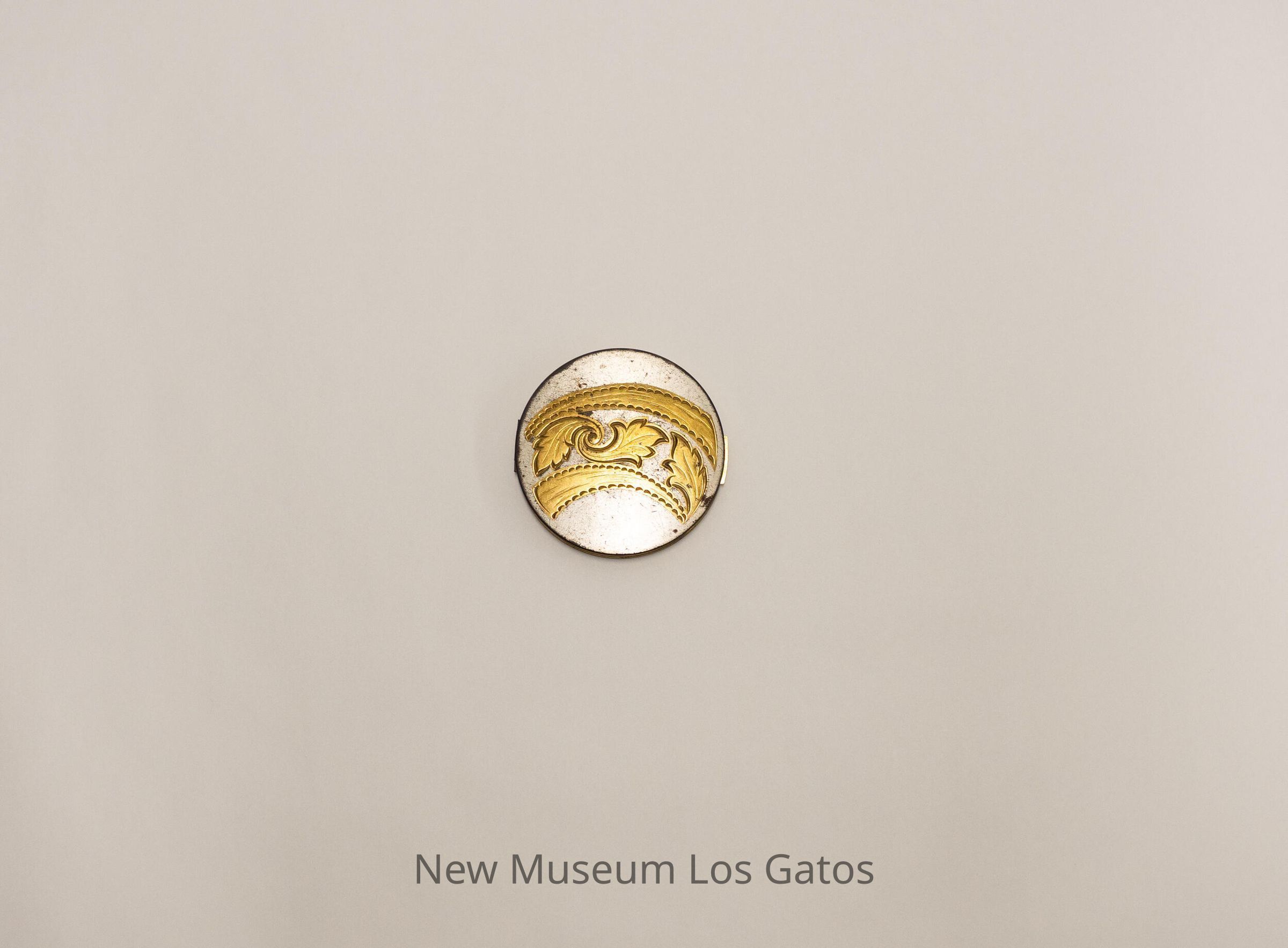 Silver and gold Zell cosmetic compact, with a gold leaf pattern on the top, and a geometric pattern on the bottom. Inside, there is a mirror on one side and a pink powder puff on the other side.