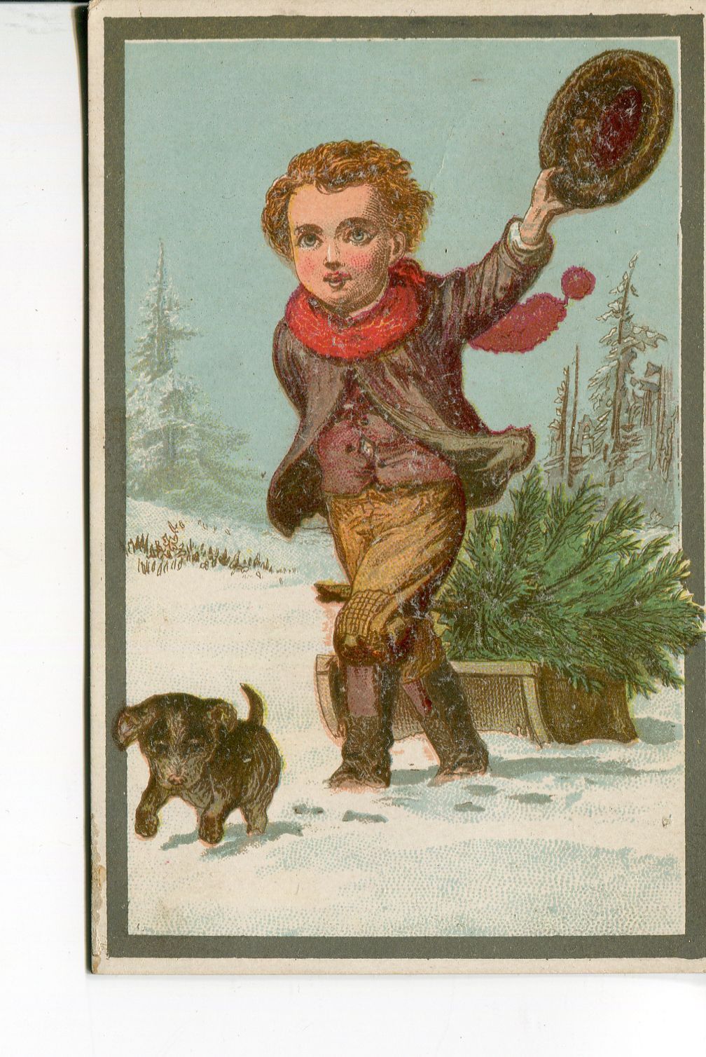 Card to Willie Chaplin from Mary. Card features a young child and a dog in the wintertime pulling a sled with a christmas tree on it.