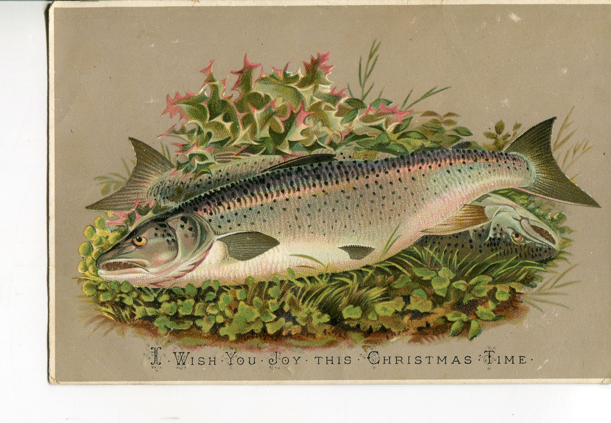 Christmas Card to Willie Chaplin. Card features two fish laying on top of green foliage. The card says "I wish you joy this Christmas Time"
