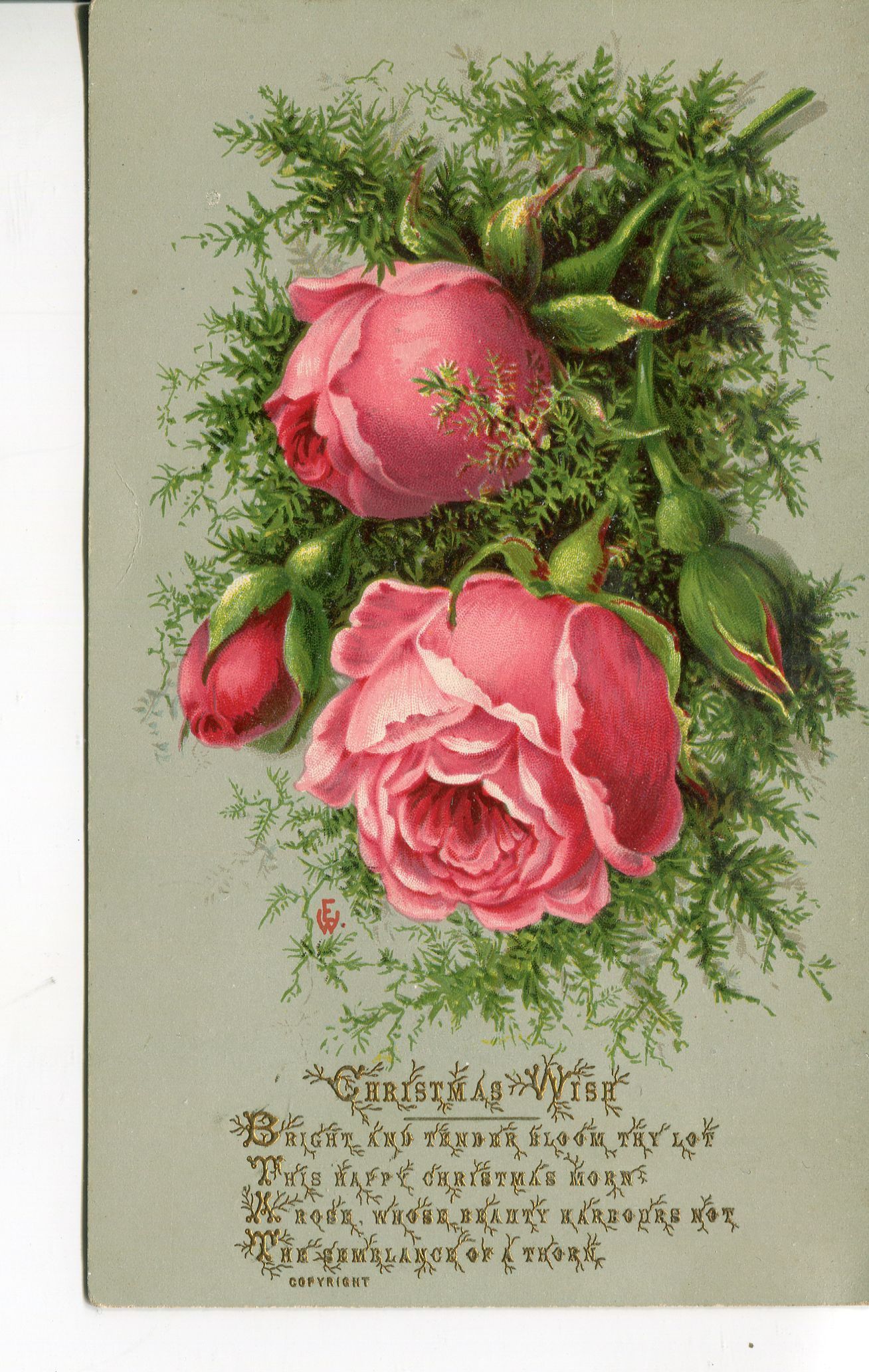 Christmas Card to W. Chaplin. Card has pink roses and foliage and reads: