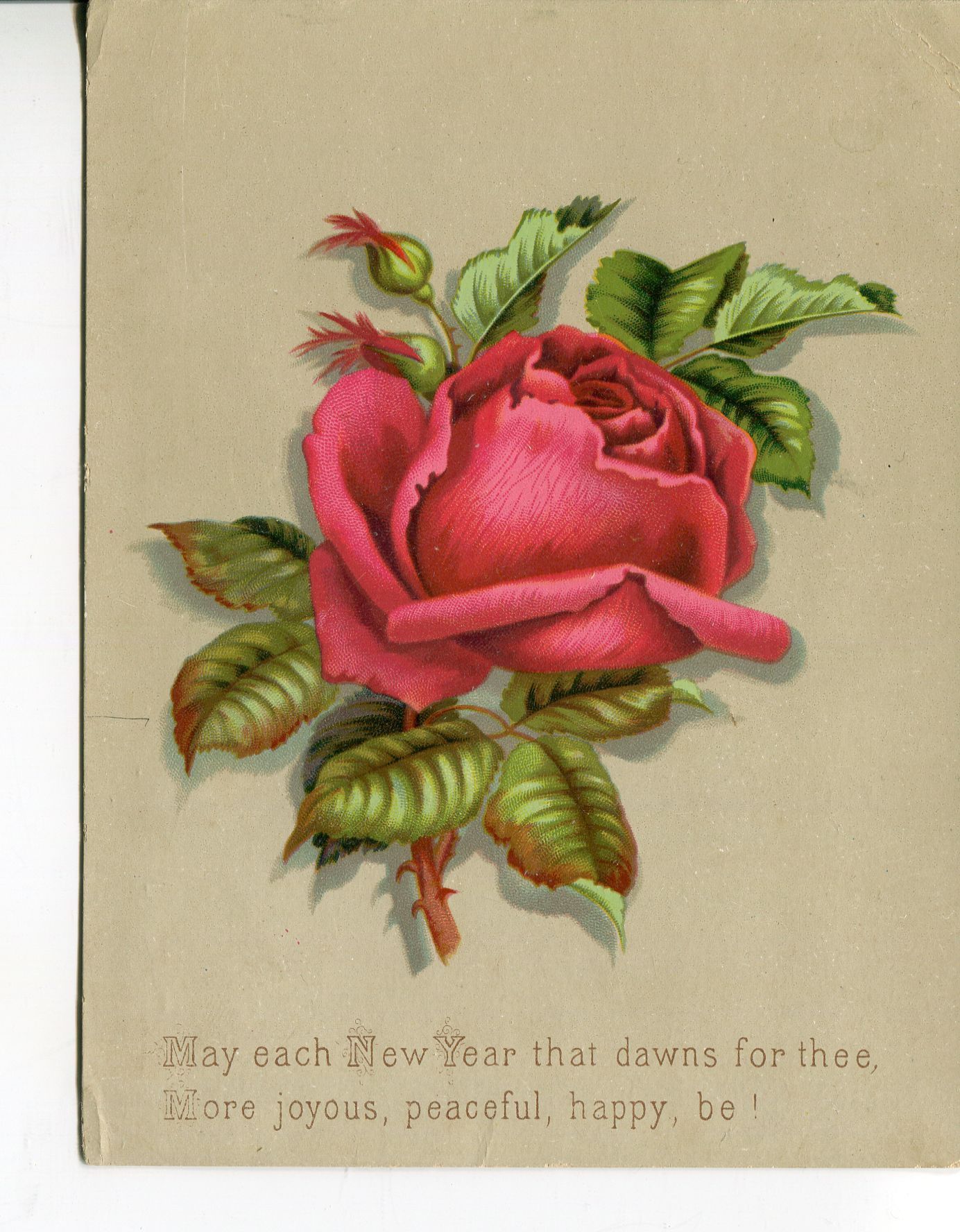 New Years card from 1881 to W.H. Chaplin from J.D. Roberts. The card has a singular pink rose and some green petals tinged with green at the end. It reads: