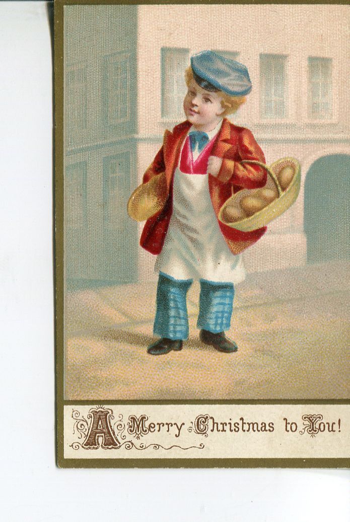 Christmas Card to Willie Chaplin from 1880. The card features a young boy carrying a basket with bread as well as a loaf of bread. He is infont of a building wearing black shoes, blue checkered pants, a white apron, a red jacket, a pink and white shirt, a blue tie, and a blue cap. The boy is white with blonde hair. The card has a section at the bottom that says: