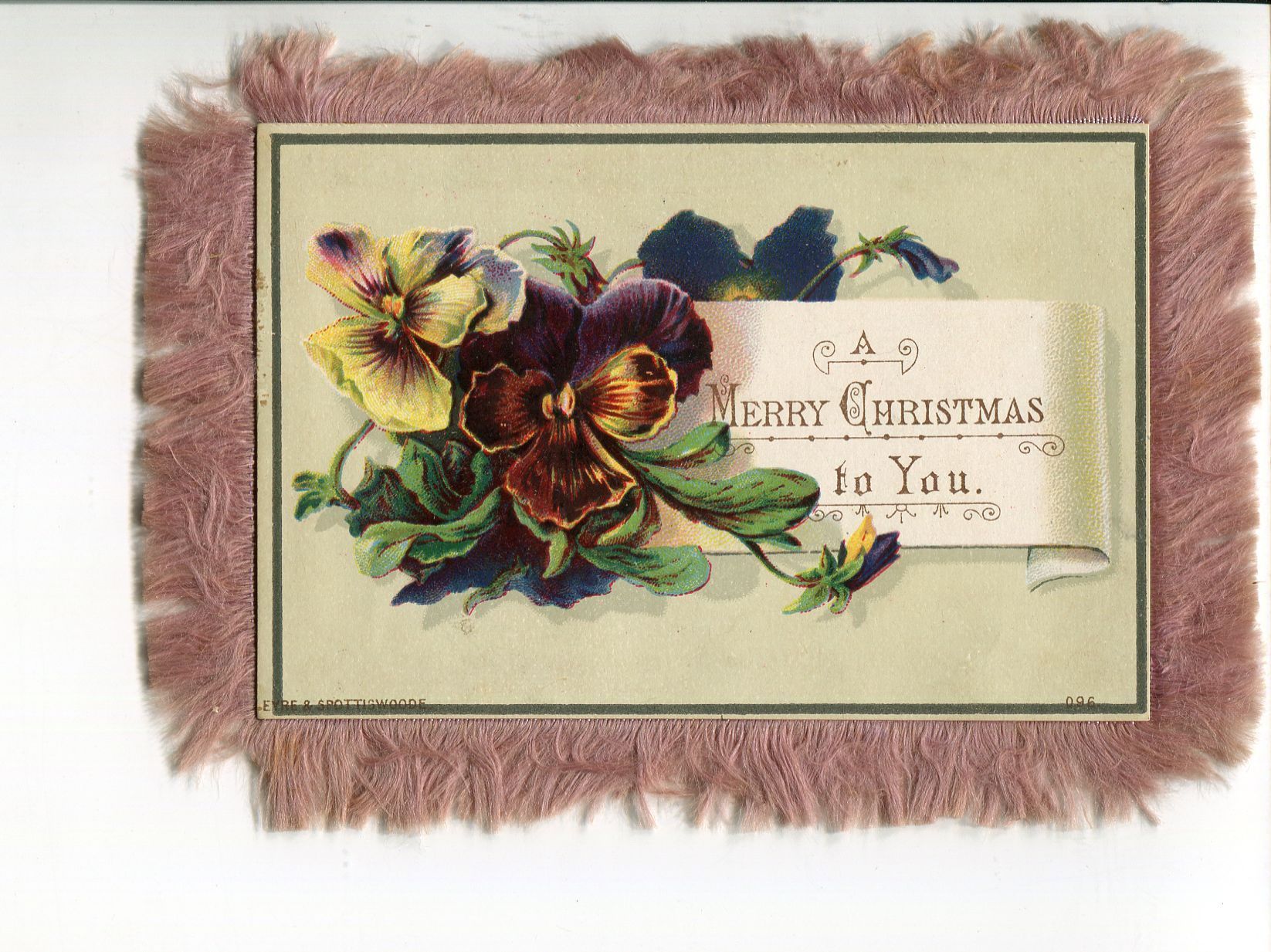 Christmas card to and from and unknown person. Card is cream coloured with fluffy pink fringe along the outer rim. It has a few colourful flowers and a banner on the right that says "A Merry Christmas to You." Card is created by Eyre & Spottiswoode. On the back it has a similar image and wishes for a happy New Year.