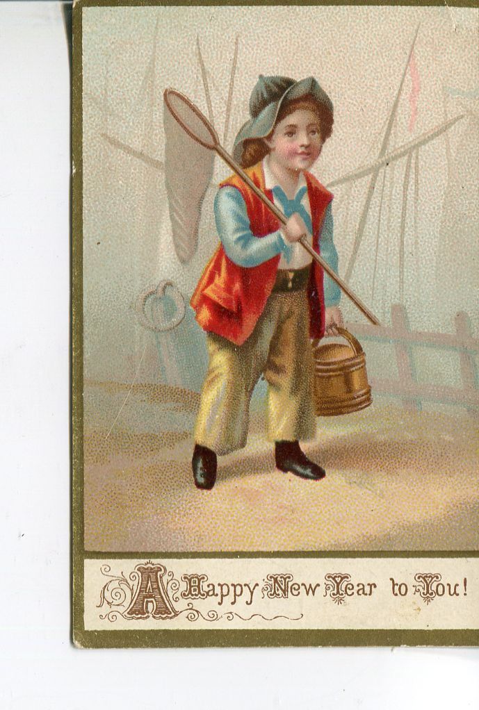 New Years Card to Willie Chaplin. Card has a young child carrying a bucket and a net near a harbour and says "A Happy New Year to You!"