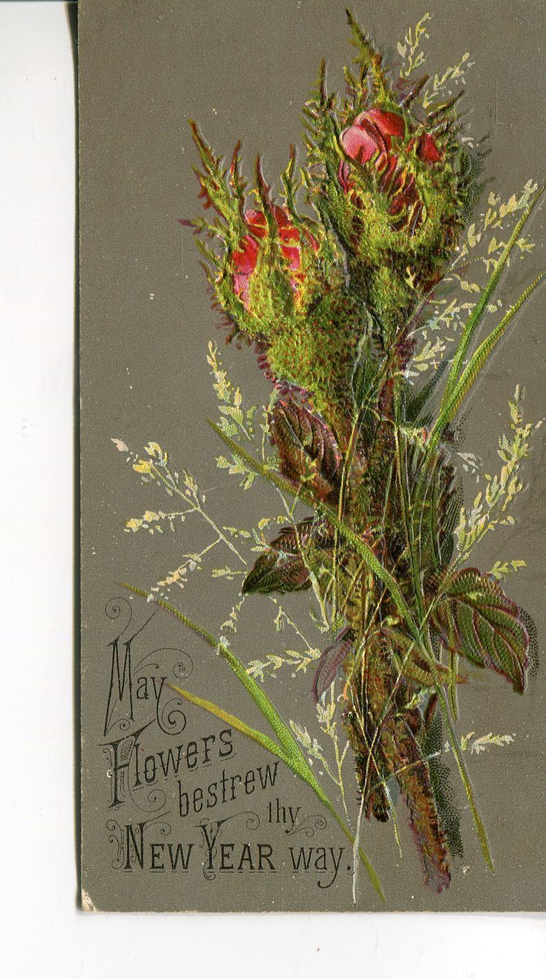 A Green-tinged grey card to Willie Chaplin from Mrs. McChung with foliage and thorn covered roses on it. The card reads: "May Flowers bestrew thy New Year way." The card is from 1880.