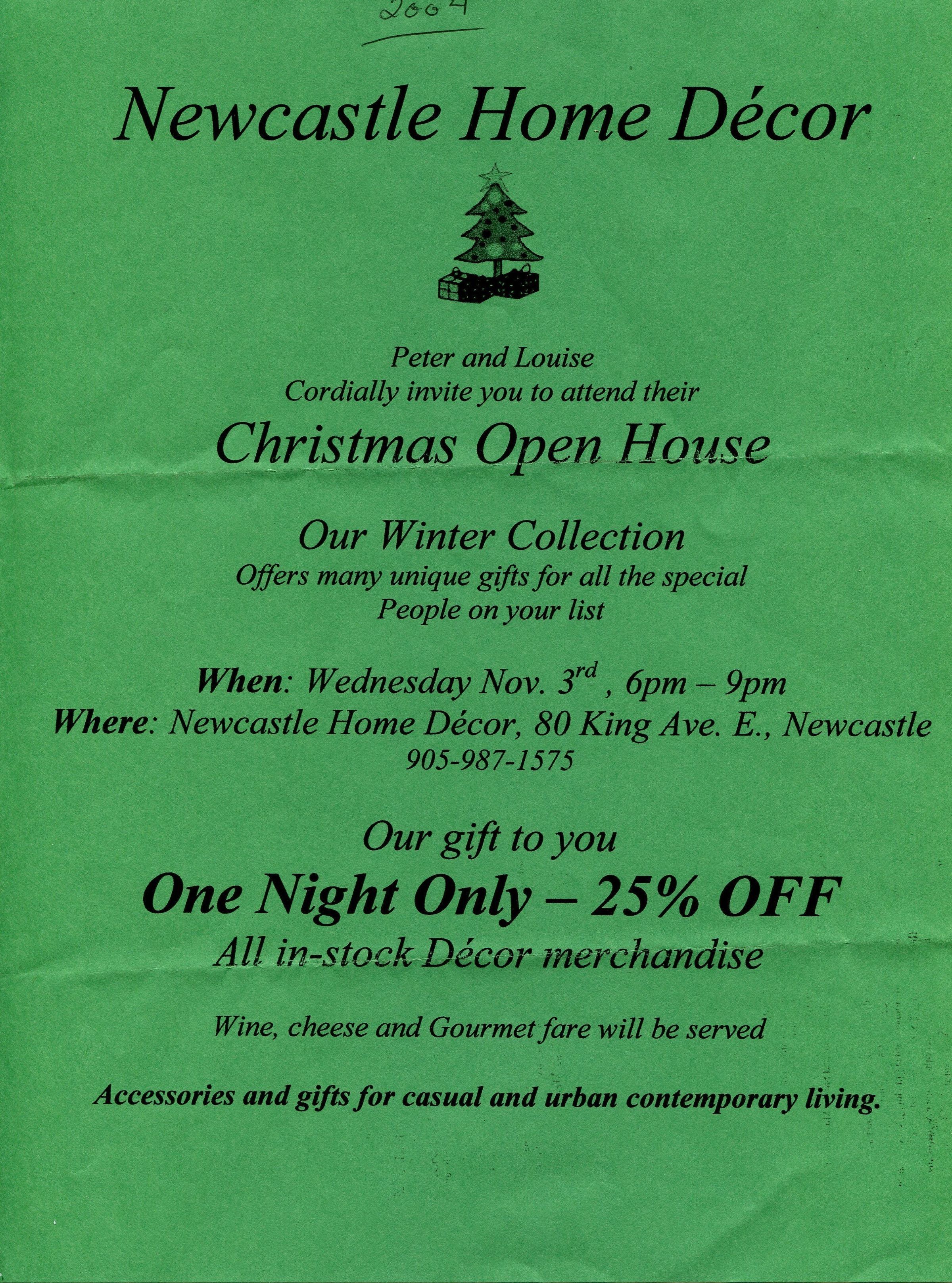 Newcastle Home Decor Christmas Open House Sale. 25% off decor for one night