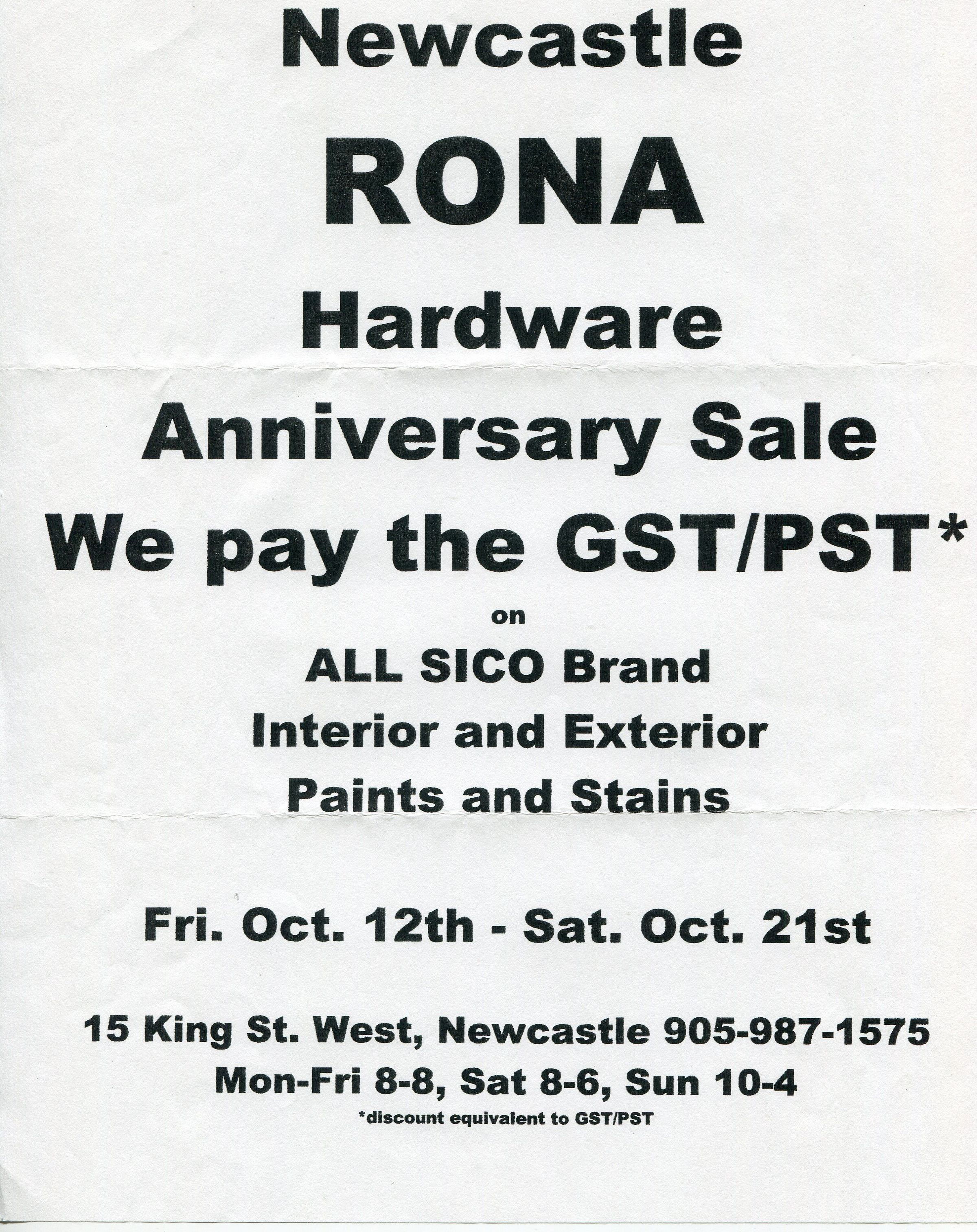 Flyer for Newcastle RONA Anniversary Sale