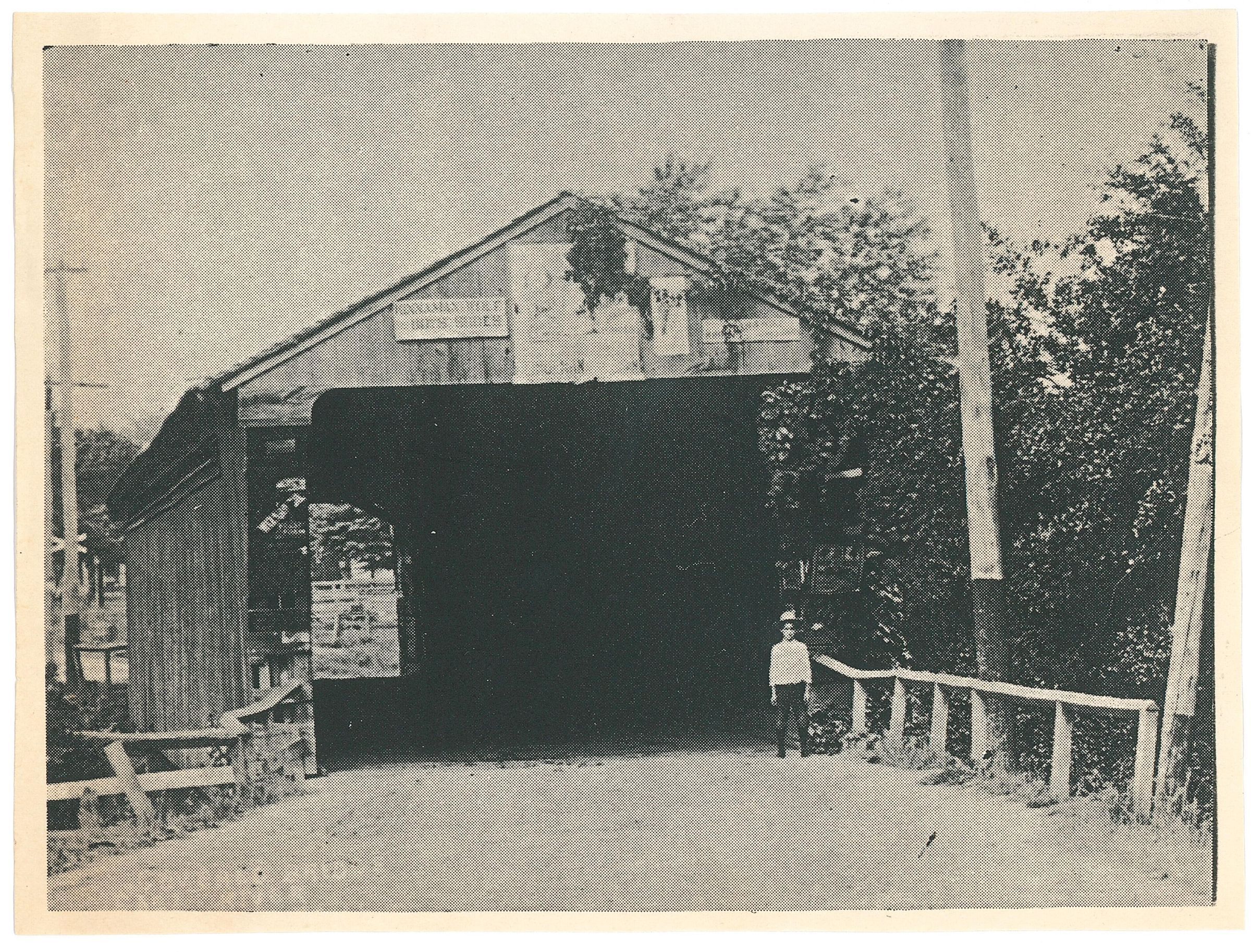 Unidentified person in front of covered bridge over the east branch of the Mahoning River. The bridge was constructed in 1831. This photo was taken before the covered walkway was added in 1921.Photograph Details