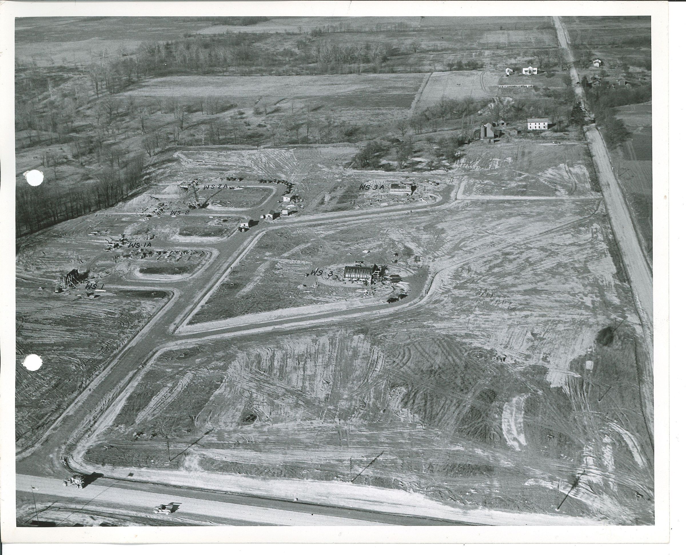 Ariel view looking North of Wet Storage Area, showing the excavation and foundation work on buildings WS1, WS1A, WS2 and WS2A. Also shown is the erected arch forms for buildings WS3 and WS3A. From Class "A" Construction Photographs - Hunkin-Conkey Construction Company, Book NO. 4Photograph Details