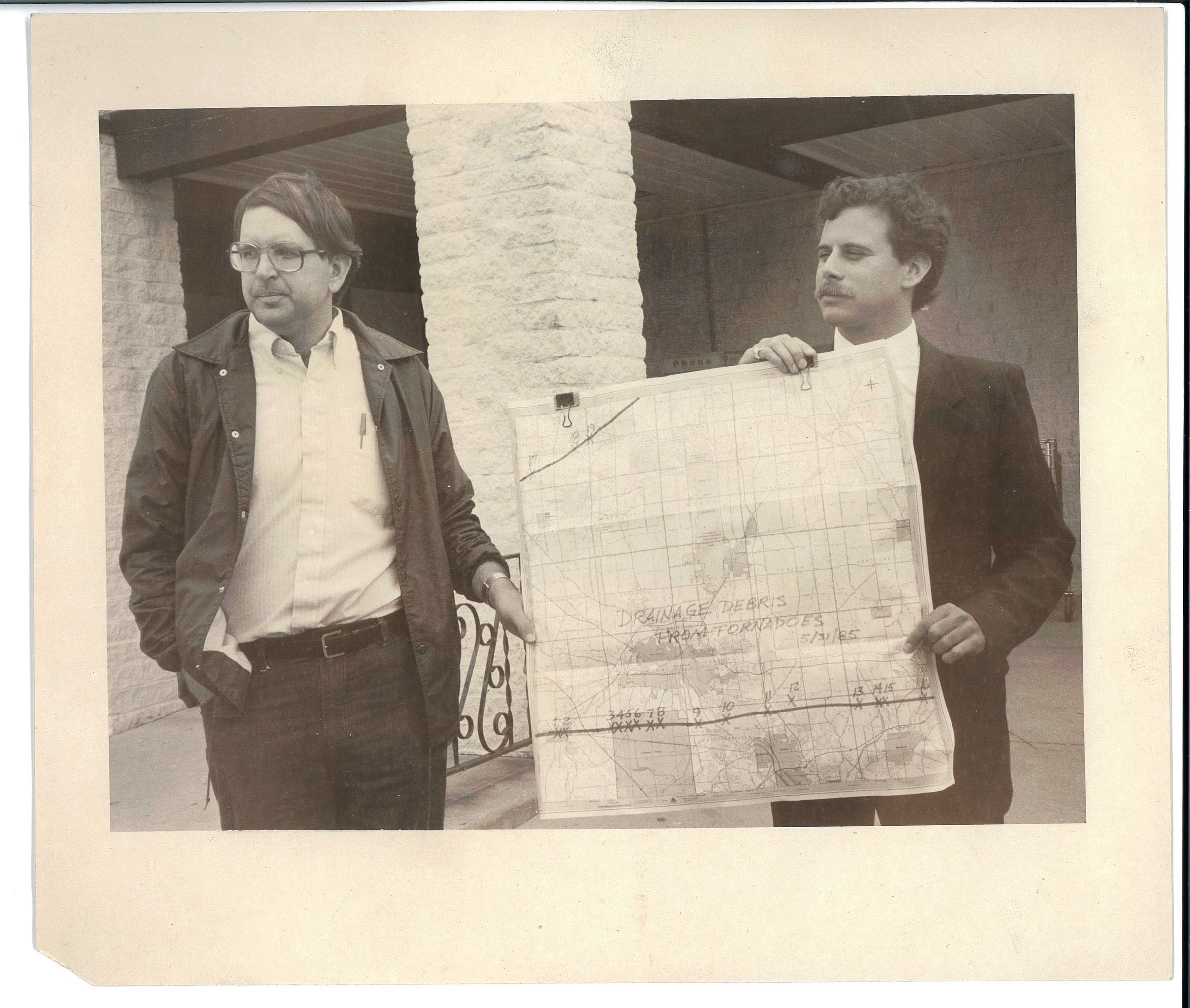 Dan Ross, left of the State Soil and Conservation Dept., and the Newton Falls City Manager Mike Blau, right discuss palns for the clean-up along the west branch of the Mahoning River following the May 31st tornado.Photograph Details