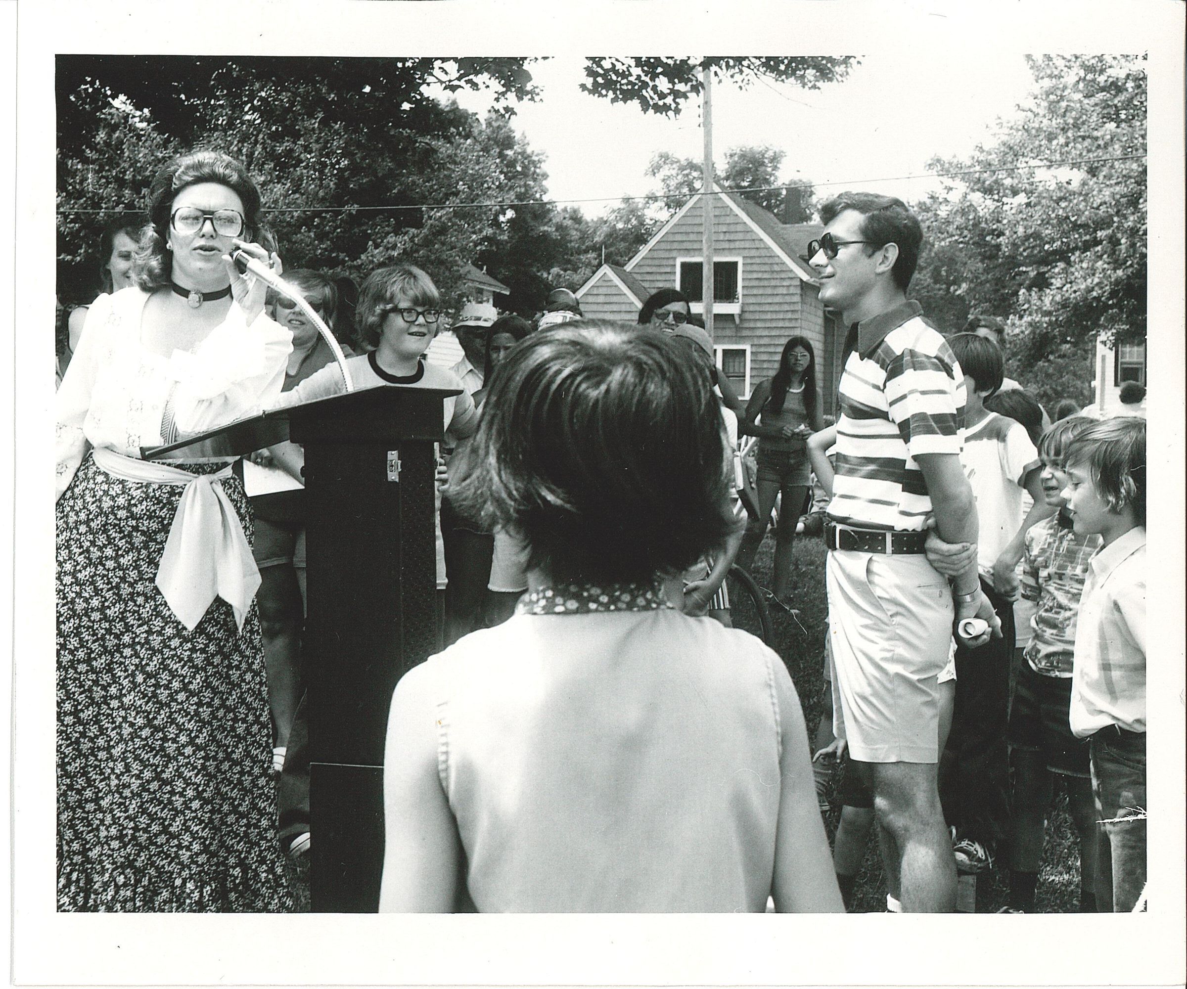 Judy Babyak taking part in the husband calling contest with her neighbor Paul Williamson. One of the family games organized by the Rotary Club for the 1975 Bicentennial celebration.Photograph Details