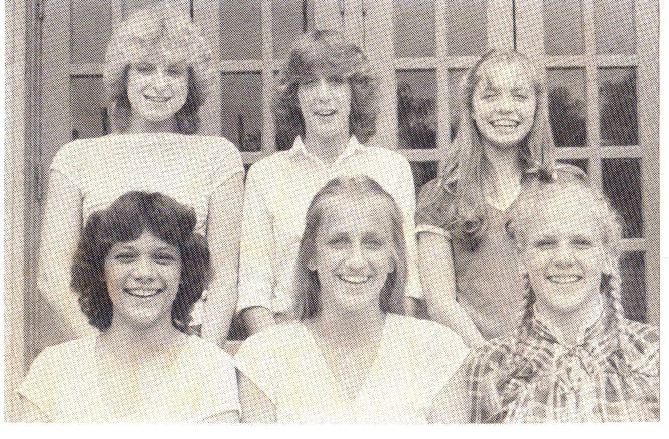These are the Varsity Cheerleaders who will cheer on the Vikings of LaBrae High School. Left to right, front row: Dee Dee Enisey, Tammy McAdams and Tracy Vold. Backrow: Renee Whitacre, Susan Erbelding and Michelle Noga.Photograph Details