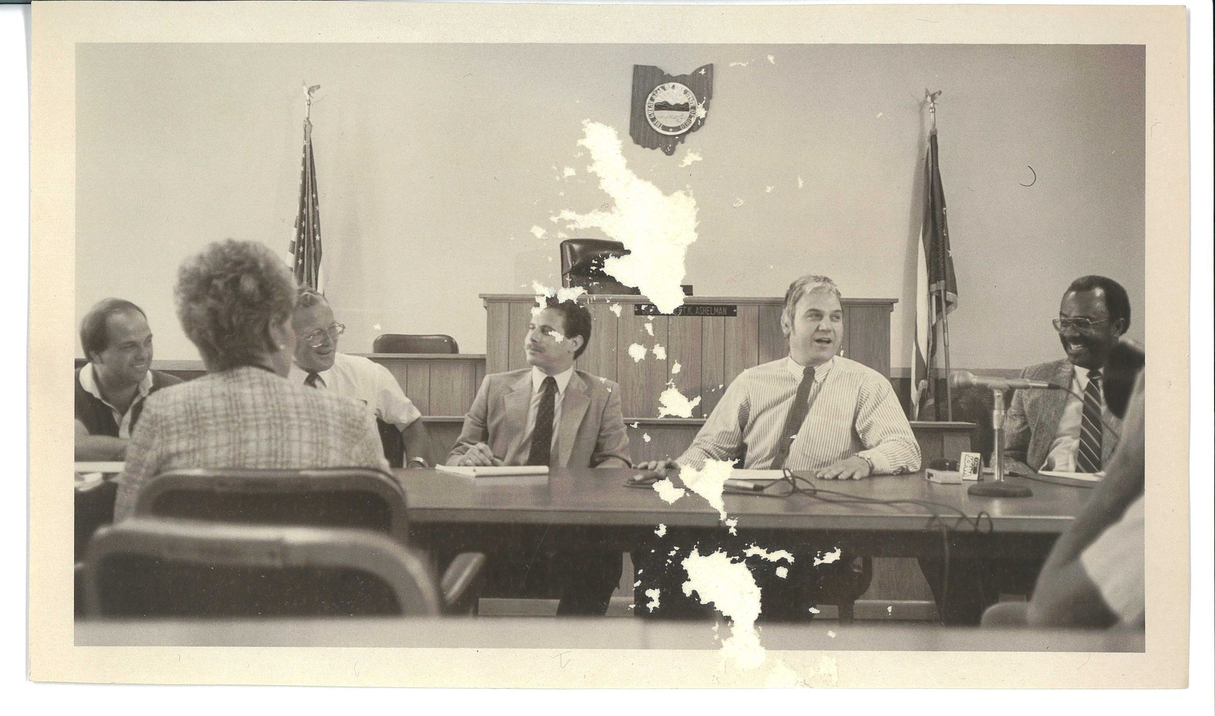 Community officials meet with congressman James Traficant seeking assistance following the May 31st tornado. Left to right: Bob Caparanis, president of the Newton Falls Camber of Commerce; Robert Irwin, mayor of Newton Falls; Michael Blau, City Manager; Jim Traficant, Bob Douglas, Aide.Photograph Details