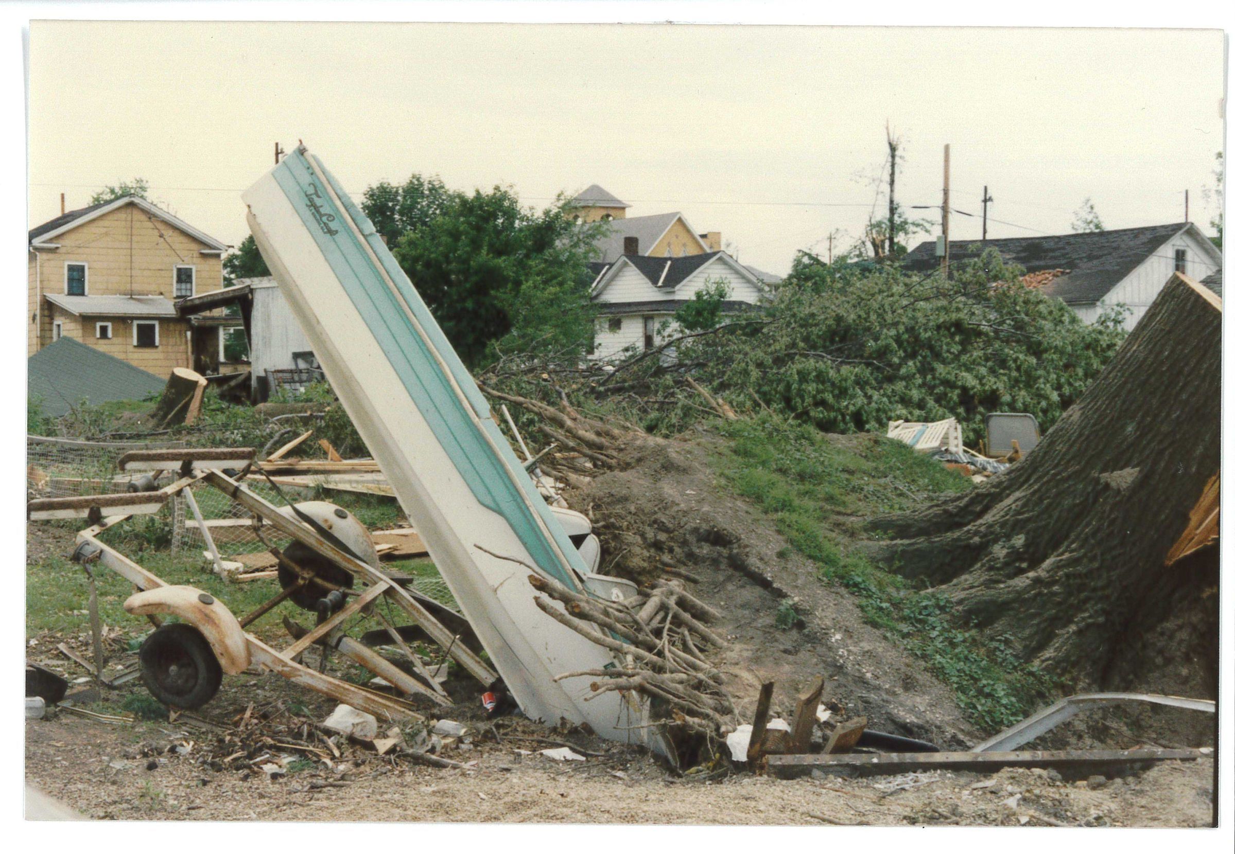 Damage to a boat in back yard on Jay Street. Looking toward Bridge Street.Collection