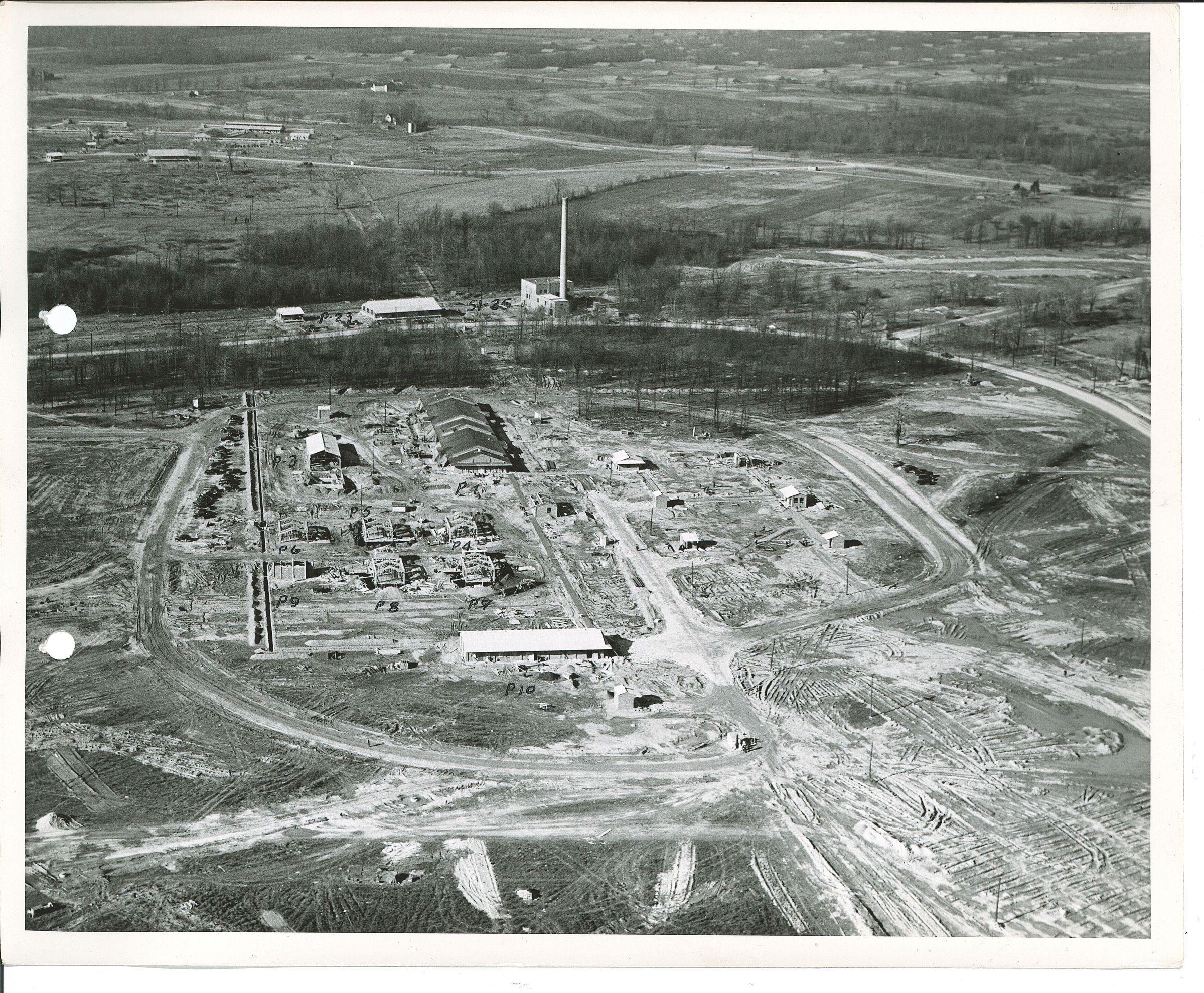 Ariel view looking North showing the completed super structure of Buildings of buildings P-1, P-10 and the structiral steel work on other buildings in this group. From Class "A" Construction Photographs - Hunkin-Conkey Construction Company, Book NO. 4Photograph Details