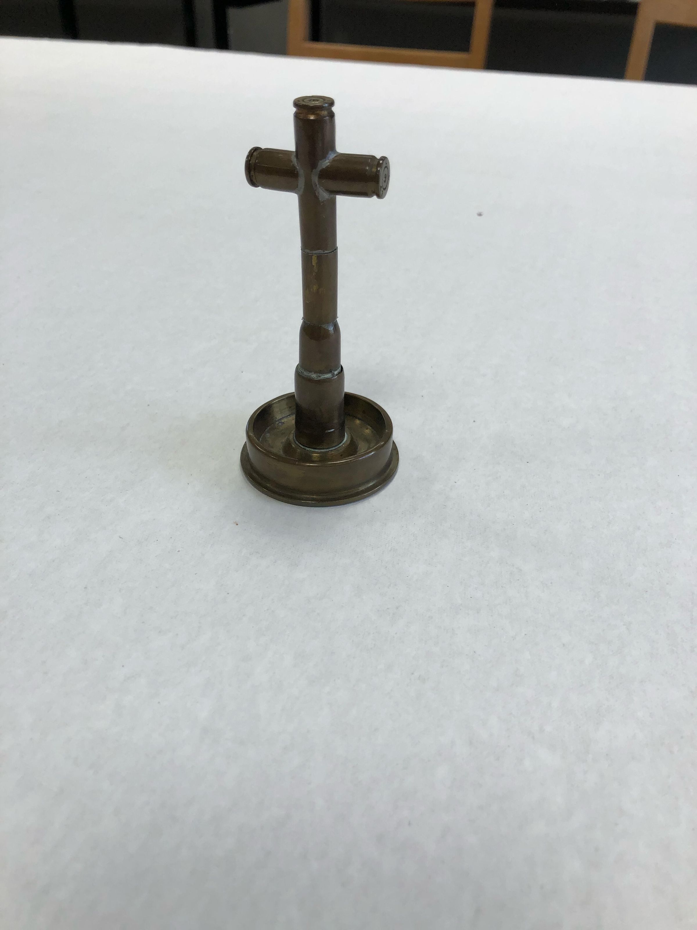A statue in the shape of a cross made from World War II military ordnance. Circa 1940s. Belonged to Andrew D. BednarcikCollection