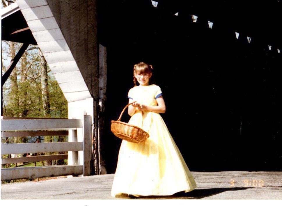 A third grader poses in front of the Covered Bridge before the dedication.Photograph Details