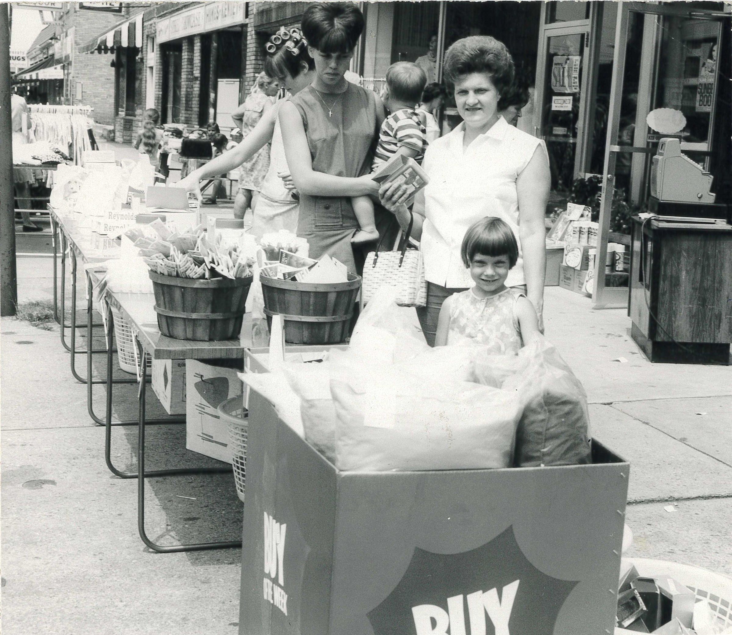 Second annual Sidewalk Sale Days. Folks taking advantage of the Aid'n Save display are Mary Serotko, holding Billy Hauck, while hist mother, Carolyn (behind Mary). In the forefront is Mrs. Helen Kolowicz and daughter Julie Kolowicz.Photograph Details