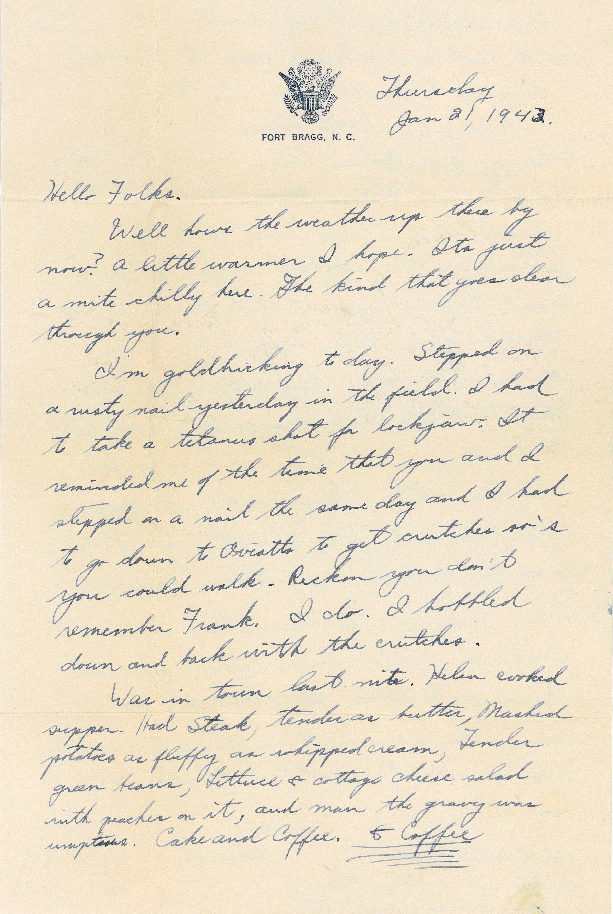 Correspondence to Mr. and Mrs. Frank Ticknor from Charles Ticknor at Fort Bragg, NC.Subject Person/Organization
