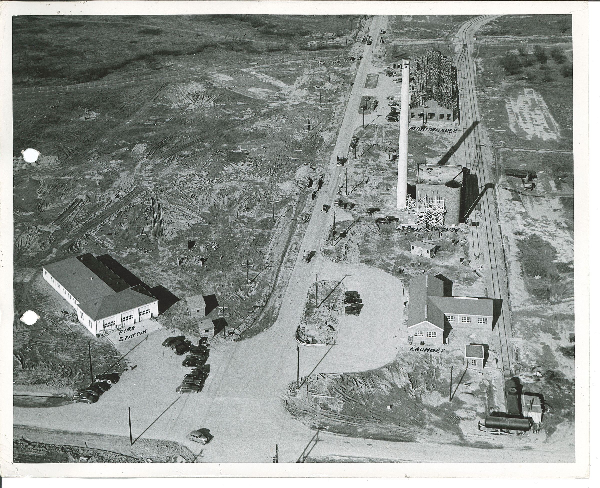 Ariel view looking north showing the structural steel and masonry work on the Maintenance Building, the completed stack and super structure of the power house, and the completed laundry and fire house. From Class "A" Construction Photographs - Hunkin-Conkey Construction Company, Book NO. 4Photograph Details