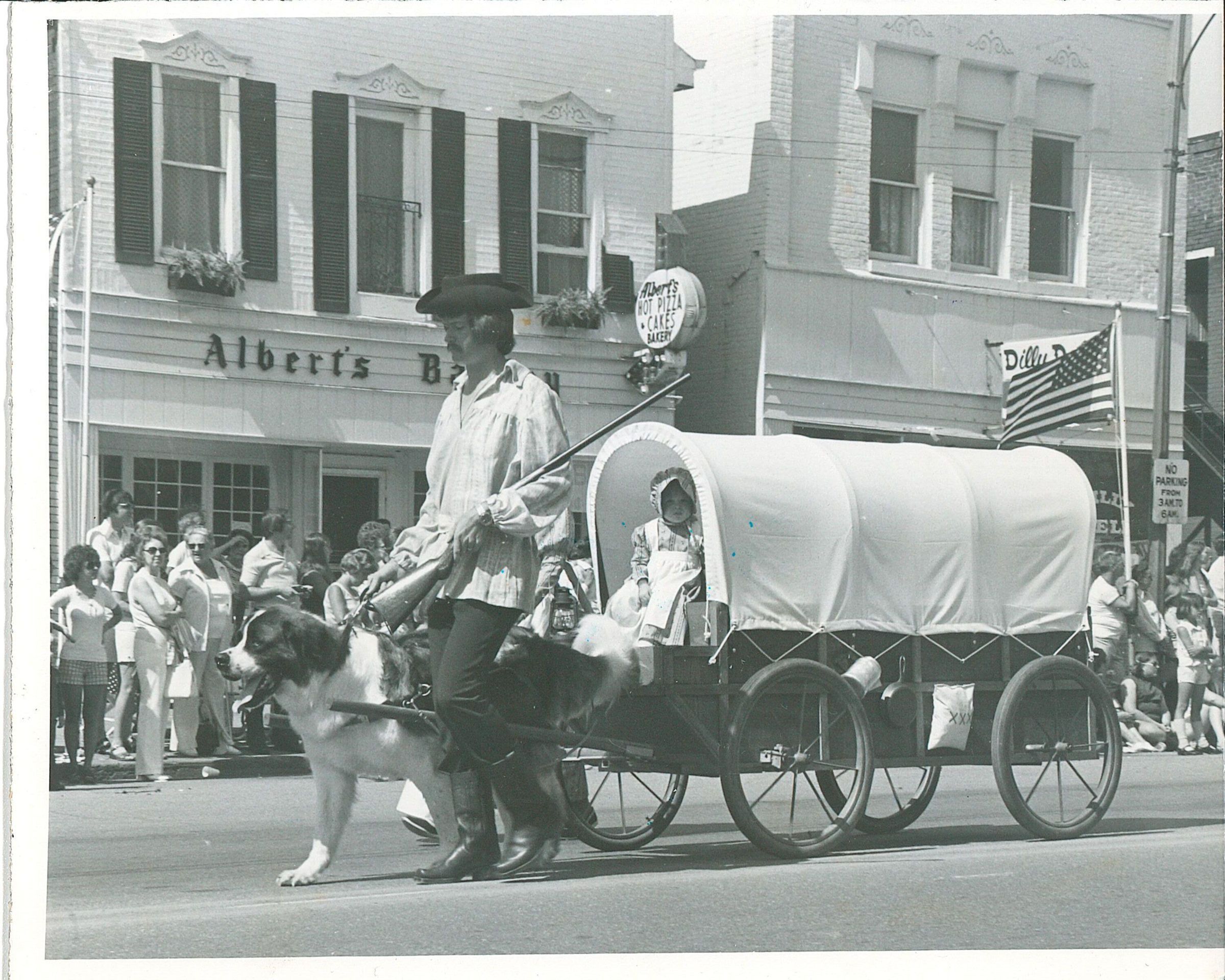 Howard Wassink, daughter Kristina Wassink, and dog Tiny marching down Broad Street in the 1976 Bicentennial Fourth of July parade. The Wassinks won the grand prize for Best Family Group in the historical costume contest.Photograph Details