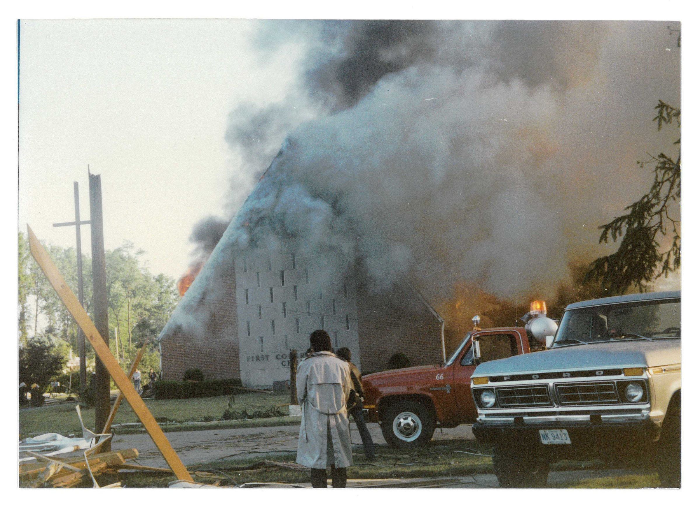 Folks watch as the First Congreational Church burns. The fire erupted the day after the Tornado did structural damage to the building, The sanctuary was gutted in the fire.Photograph Details